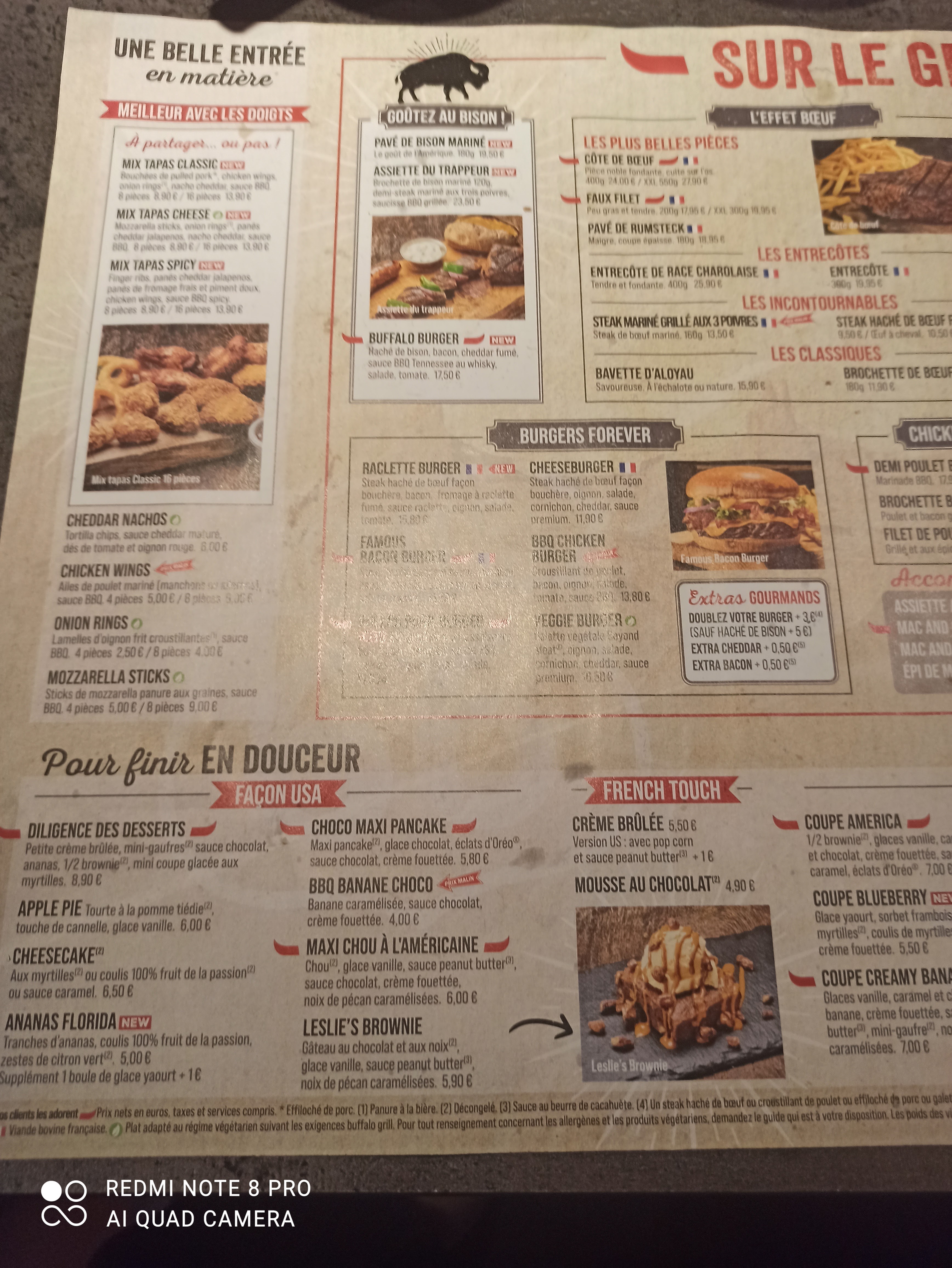 un plat d aiguillette de cabillaud avec 4 petits morceaux et une pomme de terre pas assez manger la portion était pour un enfants à 14.90. Steak mariné grillé aux 3 poivre vraiment tout petit c’est abusé pour le prix. La serveuse fait la tête jusqu’à parterre, elle est greffée du sourire vraiment pas motivée de faire son travail contrairement à son collègue qui est venu nous ramener de la sauce. Ce n’est plus le Buffalo qu’ont à connu avant. Vraiment très déçu