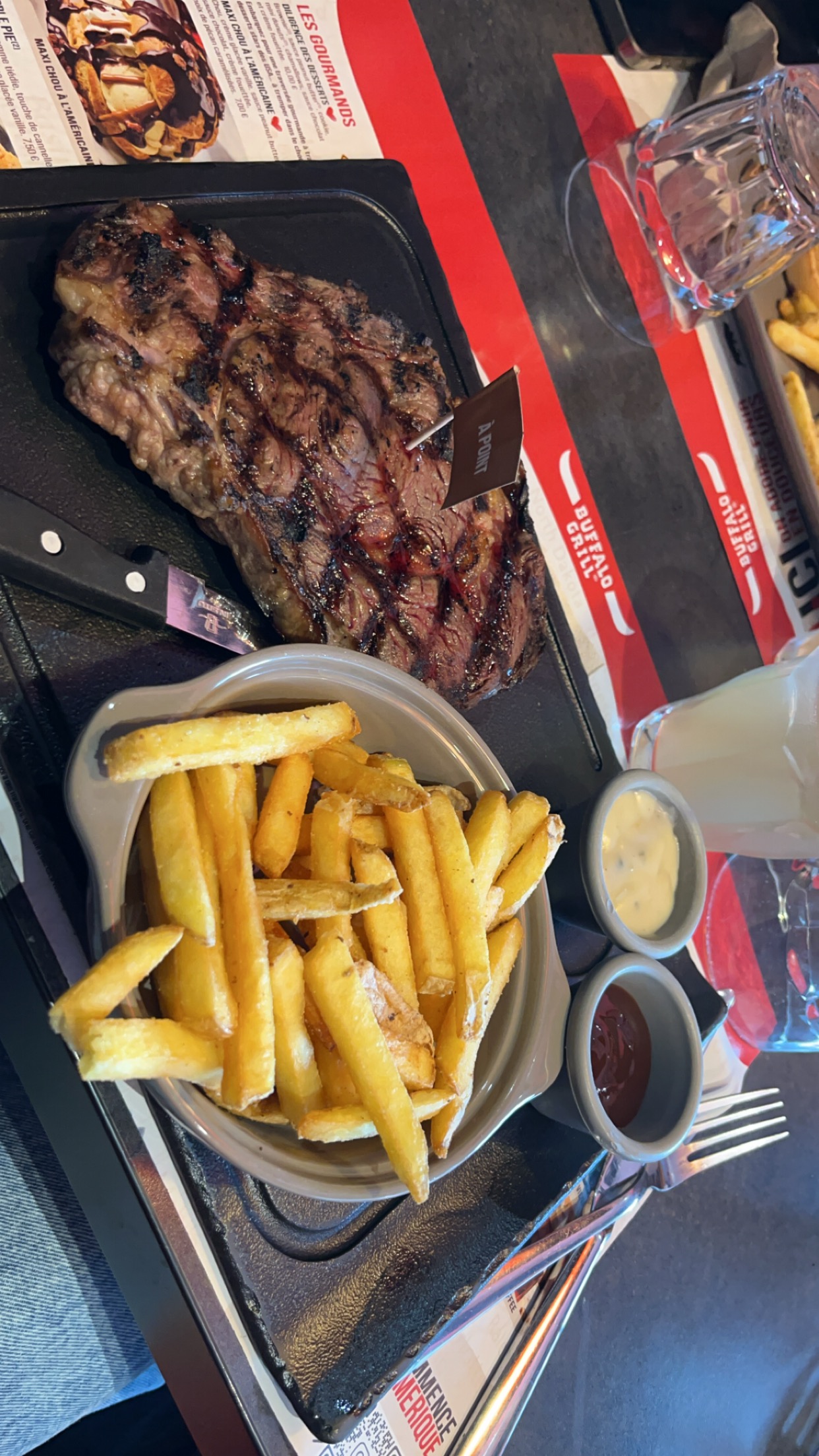 Dans un autre monde. Arrivé plus de frite, plus de patate, plus de salade d accueil plus de barbapapa . Service long très long. Un seul verre alors que nous avons commandé des boissons... Le premier dans son genre... Ne ressemble pas à la chaîne Buffalo non chaleureux, peu accueillant, il faisait froid. Déçu vraiment. Même pas un geste sur la note. 1 fois mais pas 2 vraiment si vous avez rien et bien fermer. C'est tout. Honte vraiment
