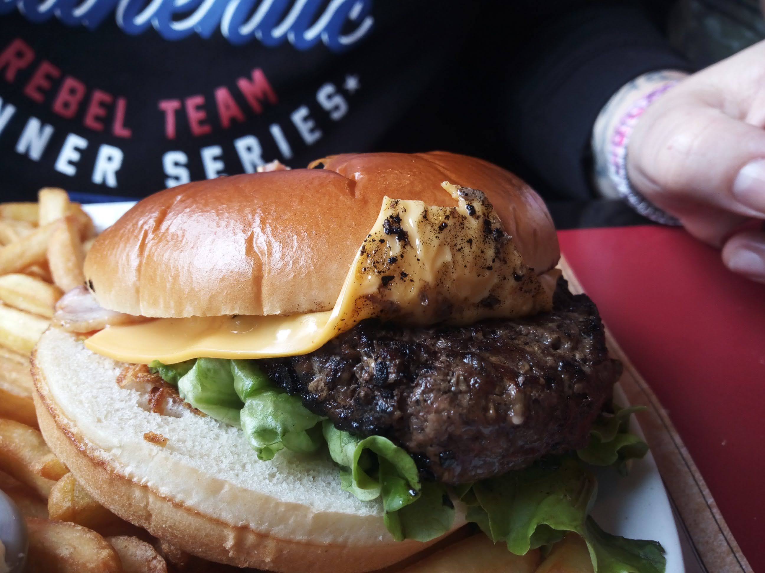 Étrange, le pic avec drapeau sur le burger avait perdu son drapeau (déchiré sûrement, en espérant que ce n'était tout simplement pas un pic récupéré d'une ancienne assiette, dieu merci j'ai pris un double steak vu la taille microscopique de ceux ci, et la salade dedans m'a imploré de l'achever tellement elle était en fin de vie. Heureusement j'ai pu me caler avec les 13 frites servies avec le burger.