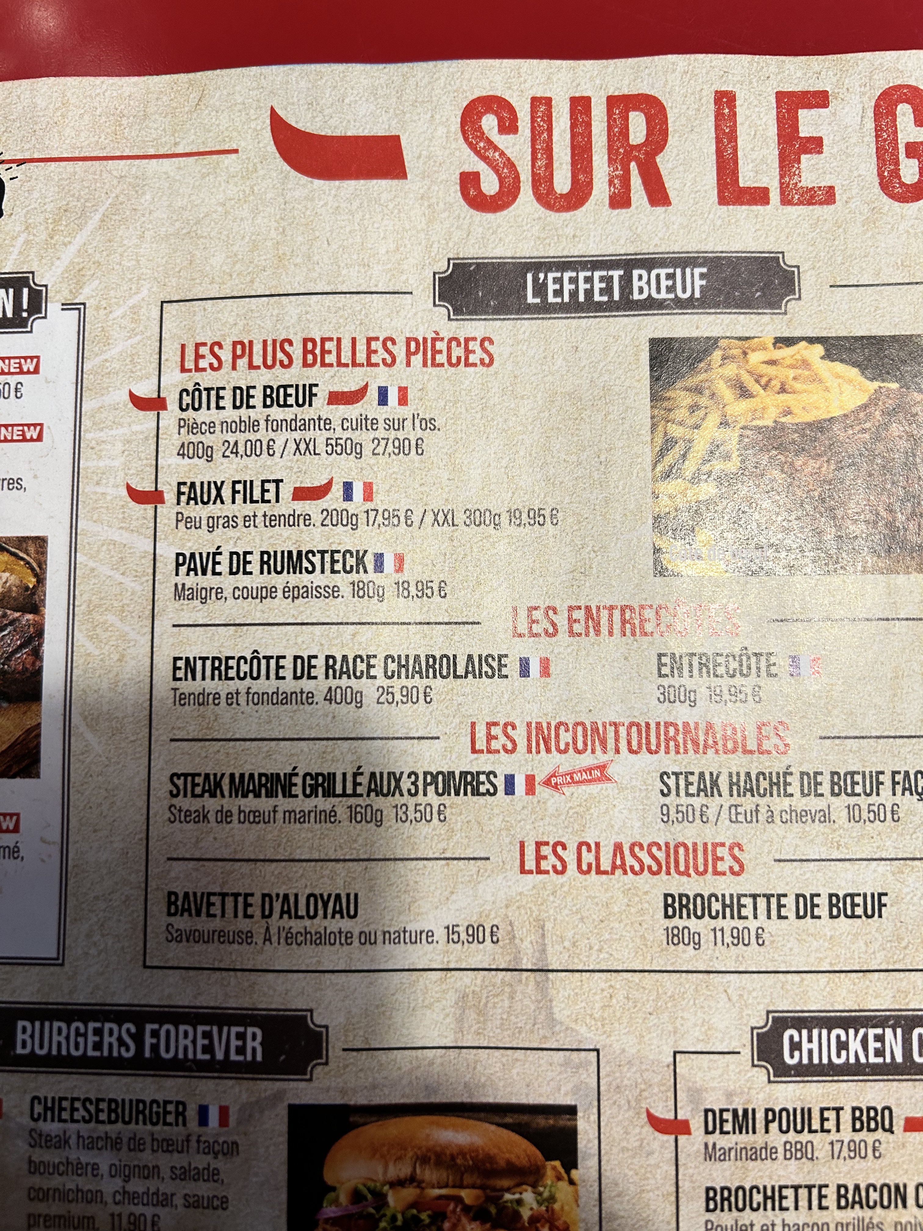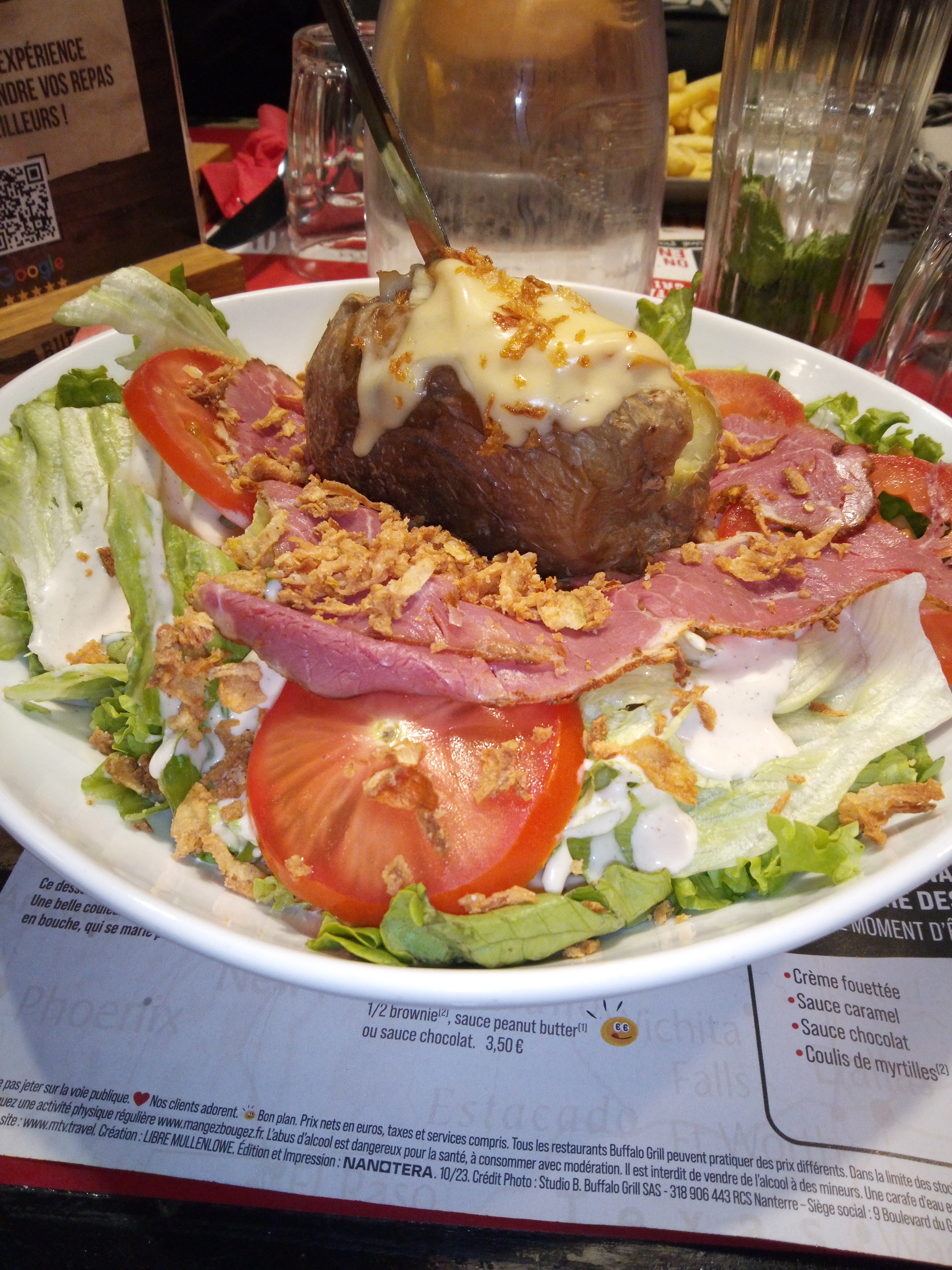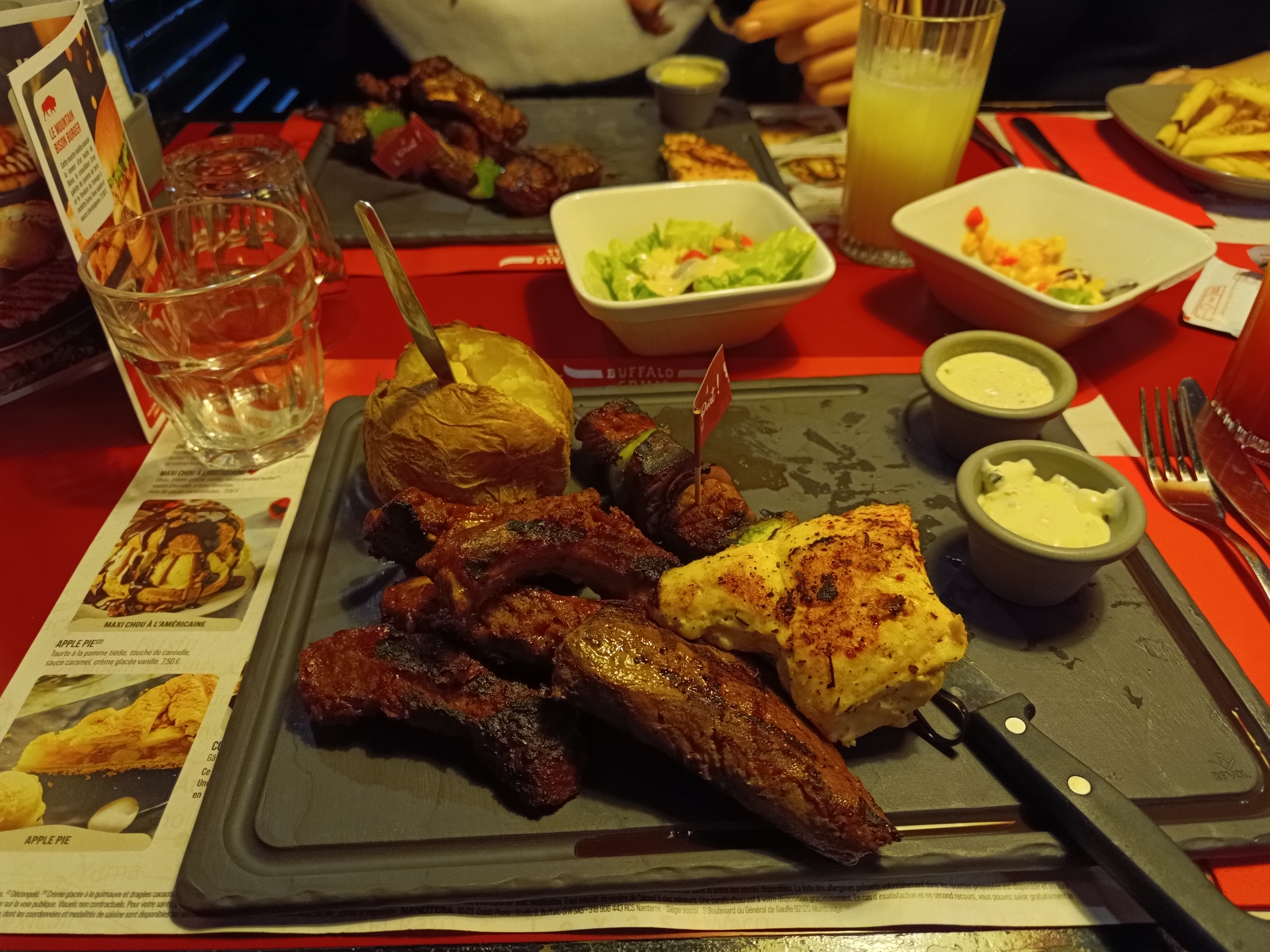 Nourriture ok mais prix exorbitants, serveuse agréable mais service lent et déstructuré alors qu’il y avait peu de monde, déco laisse à désirer (franges se décollent des lampes, poussières, tables à la peinture décollée) ; c’est plus le PasOuf Grill que le Buffalo Grill désormais.