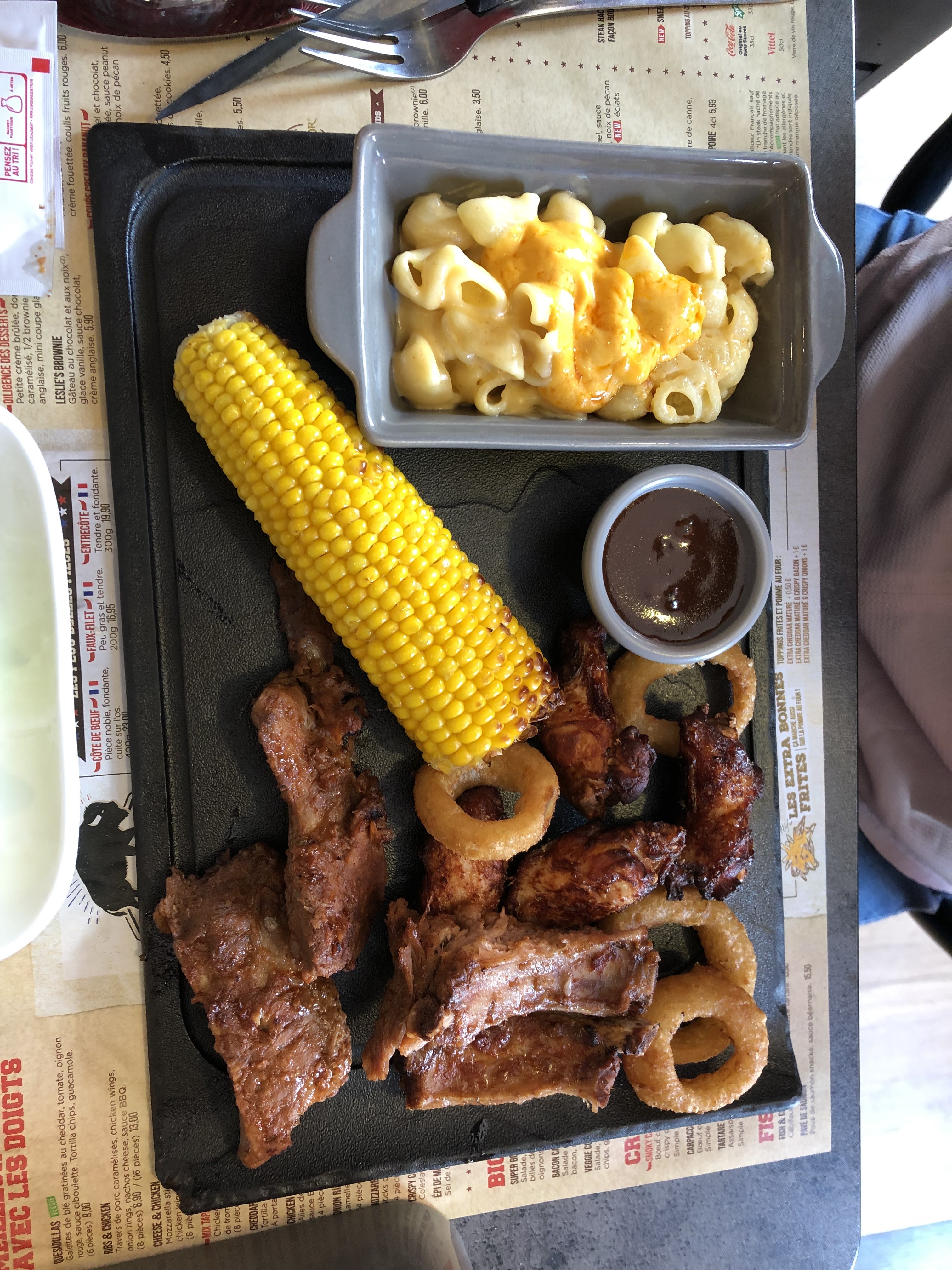 Un personnel très accueillant. Merci de loi errure le 1er mai, pratique pour notre escale. La salade est devenu optionnelle, bonne initiative pour réduire les déchets. Malgré l'affluence, repas assez rapide. Famous burger et Ribs sont des valeurs sures. Frites ok mais les légumes ne sont toujours le fort des cowboys 😁. Bonnes sauces béarnaise et roquefort Desserts gourmands, par contre pas certains que l'ananas soit de saison en mai 😜.