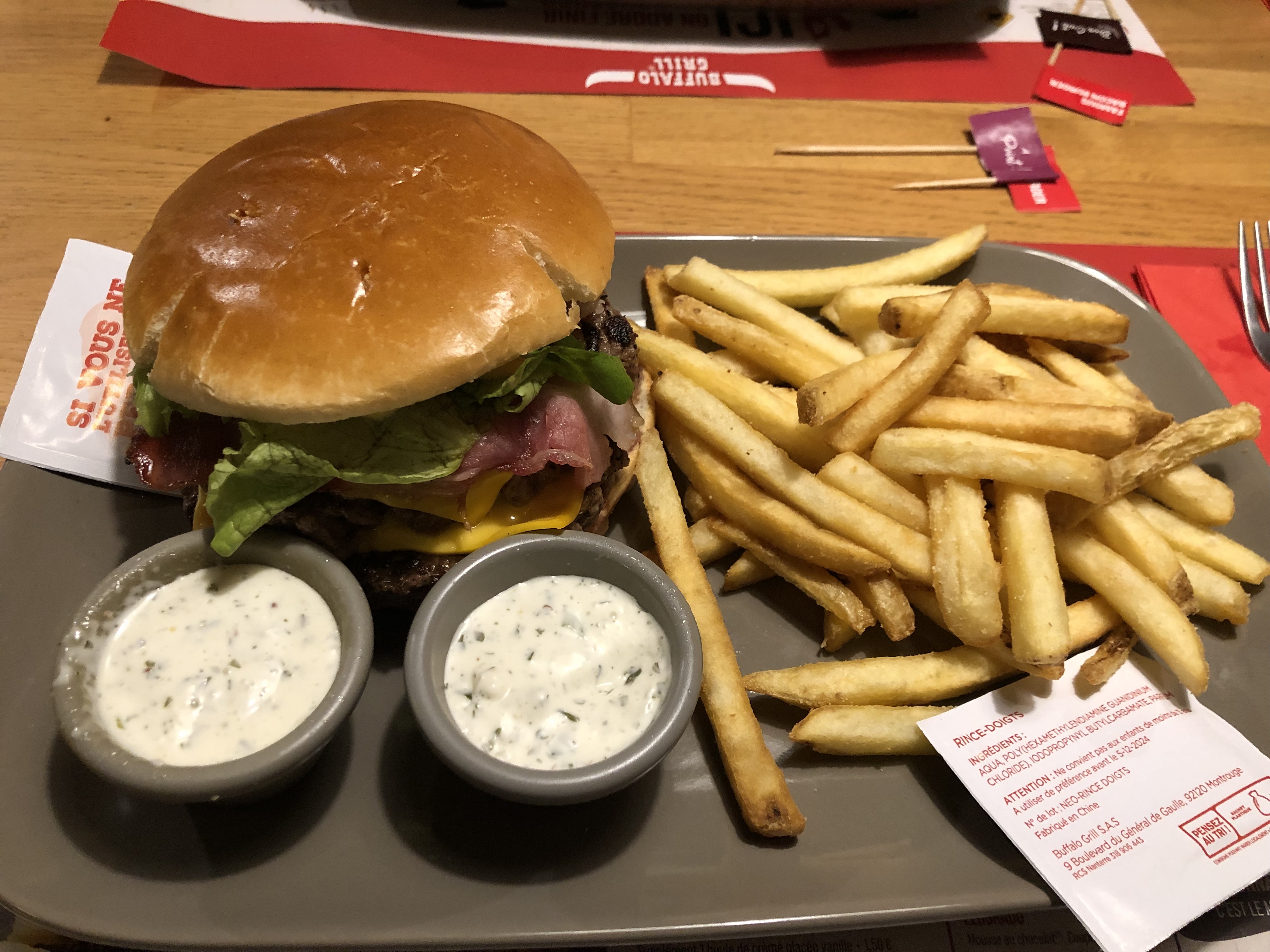 Malgré notre trio agitée nous avons passé une agréable soirée, rempli de sourire de rigolade avec Loulou comme serveuse très sympathique et agréable nous remercions ce Buffalo gril, côté nourriture nous avons été surpris par cette saveur extraordinaire que donne cette superbe sauce aux poivres à l’entrecôte. Le Burger est tout simplement exquis, le steak est bon. Cependant quelque chose nous turlupine, le jeu de la carte a mal tourné, une triche a dû être organisé dans mon dos, c’est pour cela que je ne reviendrais plus à moins que je sois satisfait du dessert qui m’a été apporté. Bon le dessert a été englouti, il est bon même exelent pour être honnête je reviendrais bisous à vous et à très vite