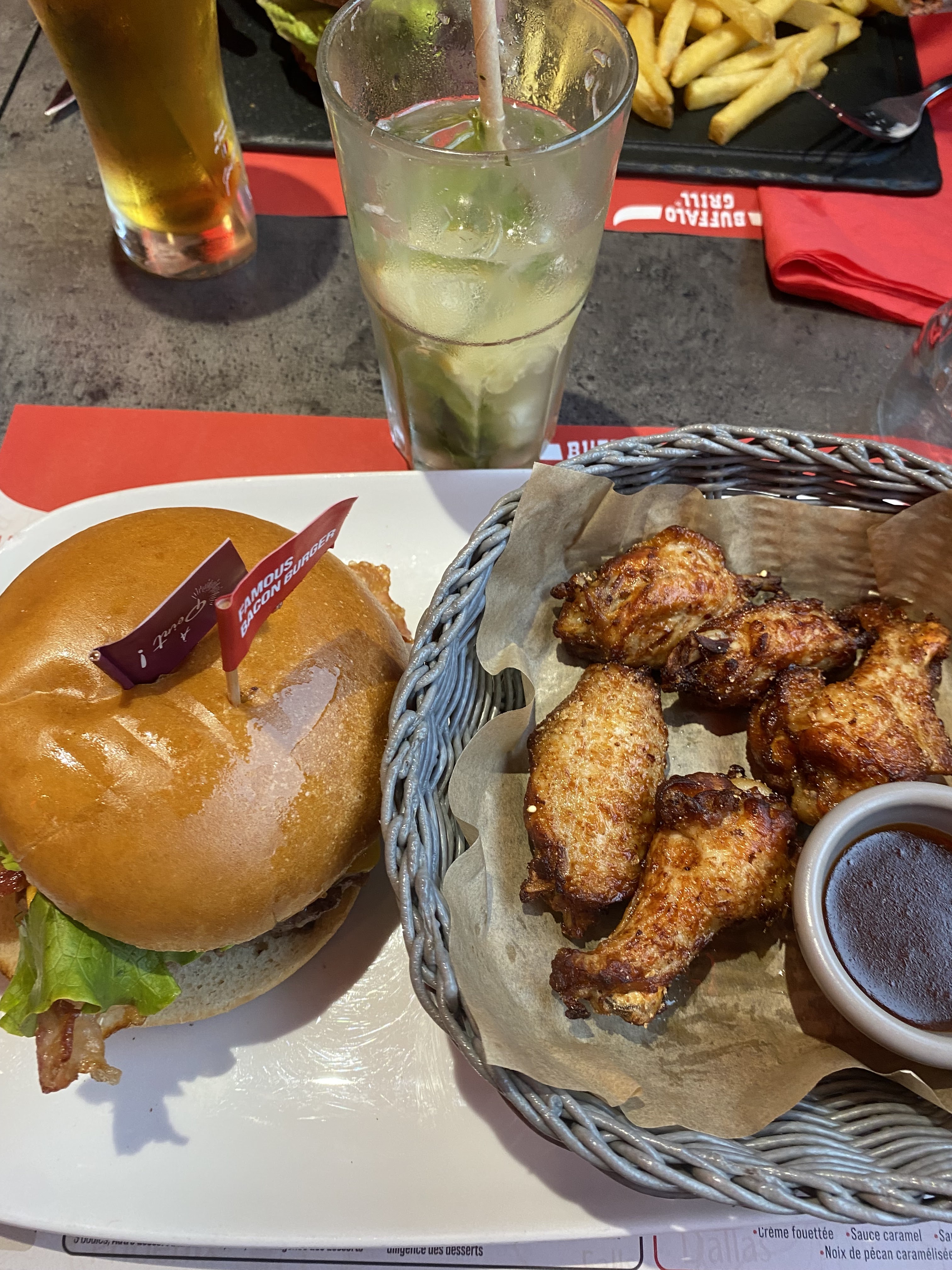 Pas fou. Longtemps que je n'avais pas mangé dans un Buffalo, assez déçue. Le serveur devait débuter donc j'ai attendu dix plombes entre chaque plat, son collègue a dû venir prendre ma commande à chaque fois. Niveau cuisine, j'avais souvenir d'assiettes bien pleines, mais la portion de frite faisait honnêtement peine à voir. Le steak grillé devait être à point, il est arrivé cru dedans avec un énorme nerf au milieu. Franchement pas fou. La mousse au chocolat et les oignons rings étaient bons, mais pour + de 20€, on s'attend quand même à un contenu un peu plus sympa que ça.
