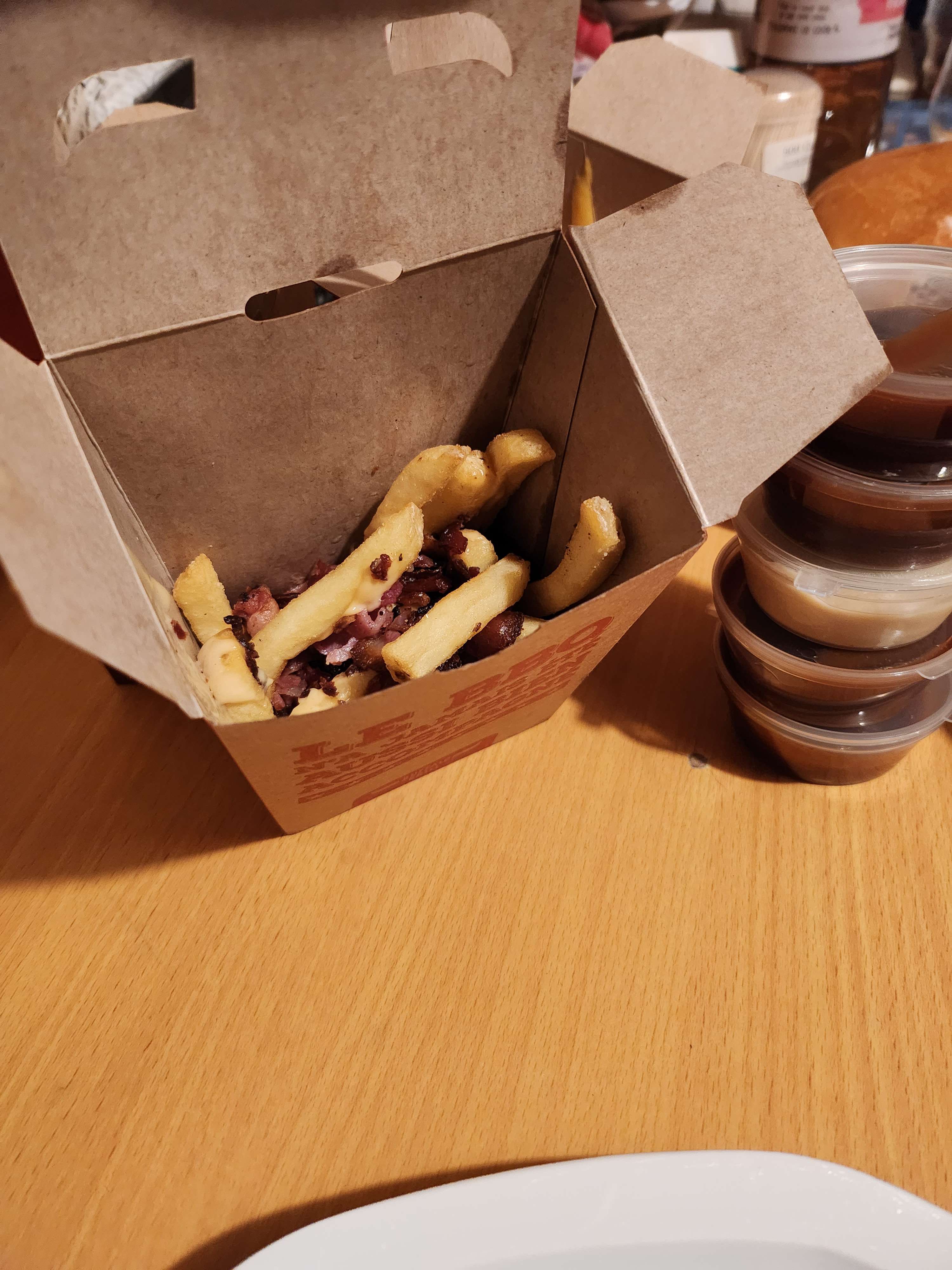 La commande en ligne se détériore depuis plusieurs semaines. Comptez 20 minutes de plus d'attente que ce que vous indiquez sur le site. Commandes non respectées, on demandes des frites cheddar on nous sert des frites au bacon et boites à moitié vides (Voir photo).