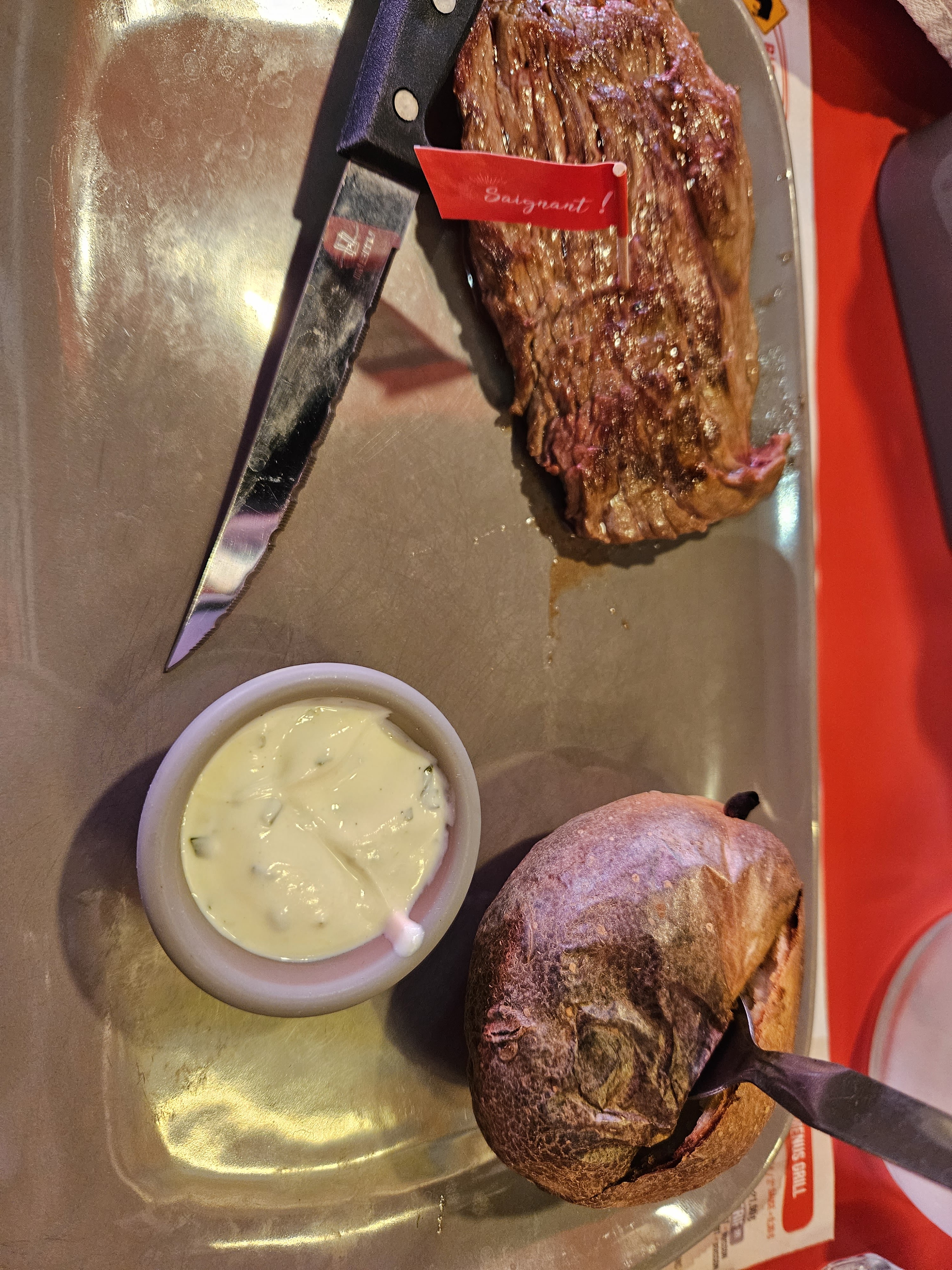 De la bonne viande et des bon accompagnement. Un service plutôt rapide et des serveuse agréable. Le midi il y a un manque de place car les parking sont vite plein. À déconseiller : la cote de bœuf trop grasses mais l'onglet est excellent