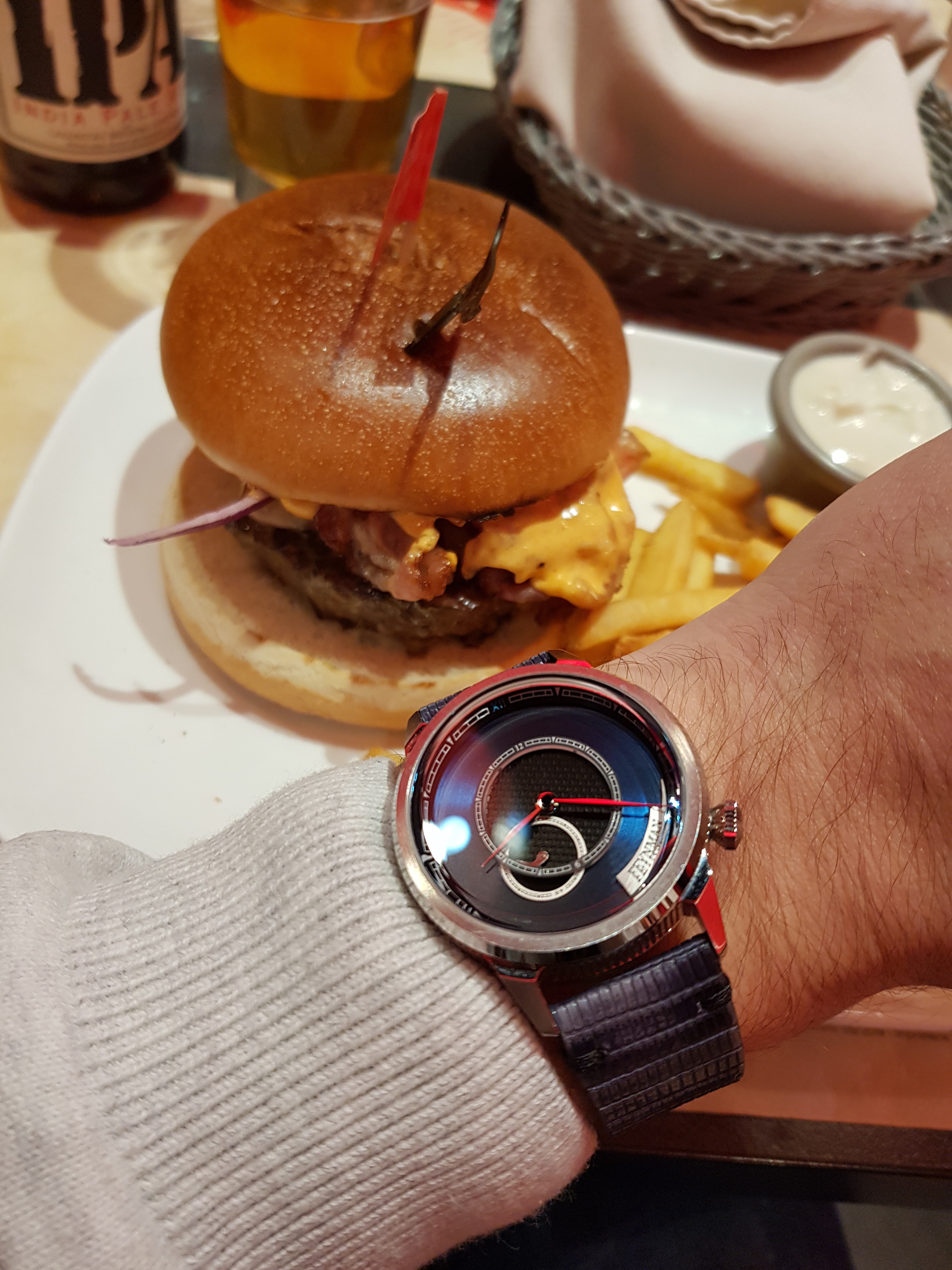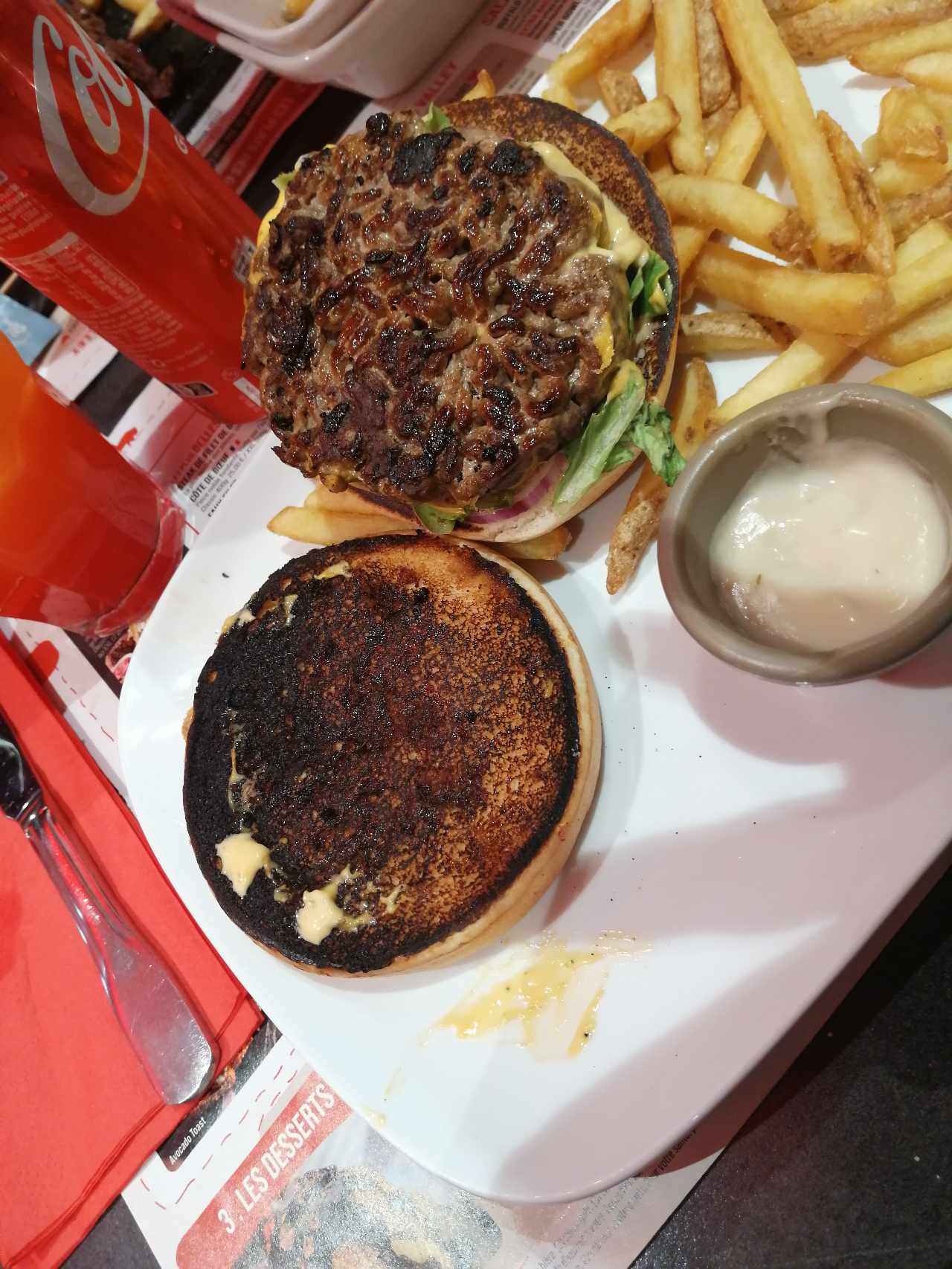 Verres sales, carafe d’eau aussi digne qu’un aquarium tellement ça flotte à l’intérieur Une éternité pour avoir l’apéro, le vin qui arrive une fois le plat terminé Burger demandé sans oignons mais qui arrive avec des oignons, j’ai mangé après tout le monde le temps qu’ils refassent la commande De la mayo sur la salière, bref…..