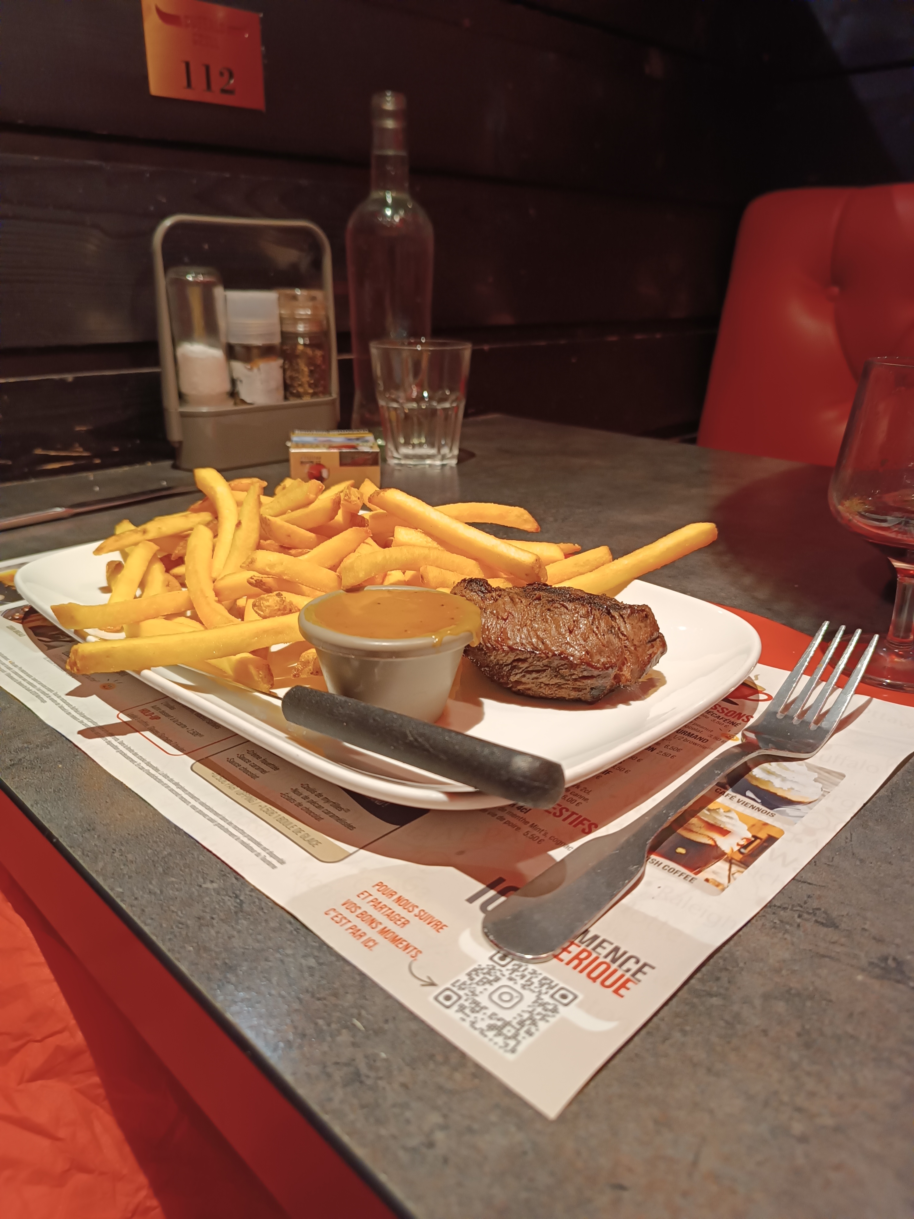 Mauvaise expérience ! mon steack était pire que dur, donc impossible à manger, on me répond:ça dépend des morceaux donc pour résumer, soit on a de la chance soit on paye mais sans manger(que des frites) , certe nous avons eu lors de l'addition un bon de 5€mais malheureusement nous 'y retournerons plus...