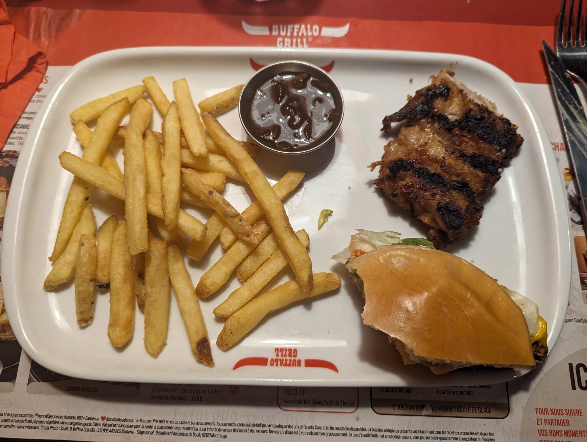Quelle expérience décevante. Nous nous sommes rendus dans ce restaurant en dernière minute. Il est aux alentours des 21h, un samedi soir, le restaurant est au 3/4 vide. Nous attendons deja pour être amenés a une table. La table qui nous est attribuée est une table de deux, minuscule dans un compartiment. Nous décidons de nous décaler sur la table a côté (nous n'avions rien touché sur la table), étant chargés (affaires de moto), pour être plus à l'aise. En revenant, la serveuse nous prie de bien vouloir regagner la petite table, au cas où un groupe arriverait en car plus tard dans la soirée (d'ailleurs, on l'a attendu, il n'est jamais arrivé !) Que vous dire de la nourriture? J'avais commandé des quesadillas, on me prévient qu'il faut 20 min d'attente. Effectivement c'était long, mais quel fut mon étonnement quand c'est arrivé: une portion minuscule qui semblait avoir été décongelée... Le plat était aussi très sommaire. Autant vous dire qu'il ne faut pas avoir faim! Sur la photo le burger avait deja été bien entamé mais la portion de frites était ici intacte, voilà a quoi ressemblent les portions de frites chez buffalo en 2024. D'ailleurs nous avions demandé s'il était possible de couper le burger en deux en cuisine avant qu'il nous soit servi, la même serveuse nous rétorque qu'en cuisine ce n'est pas possible car ils ont les même couteaux que vous. Après tout cela, nous sommes restés sur notre faim (c'est le cas de le dire). Buffalo grill représente un univers qui se veut singulier, mais malheureusement ce n'est plus du tout le cas. Merci mais je ne reviendrai pas .