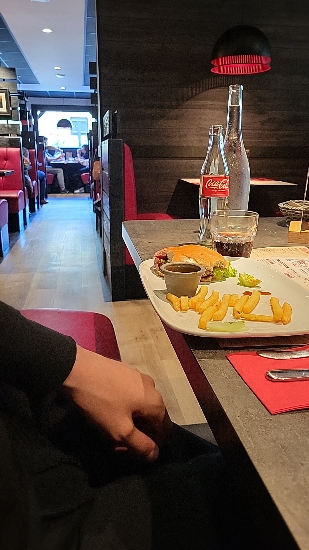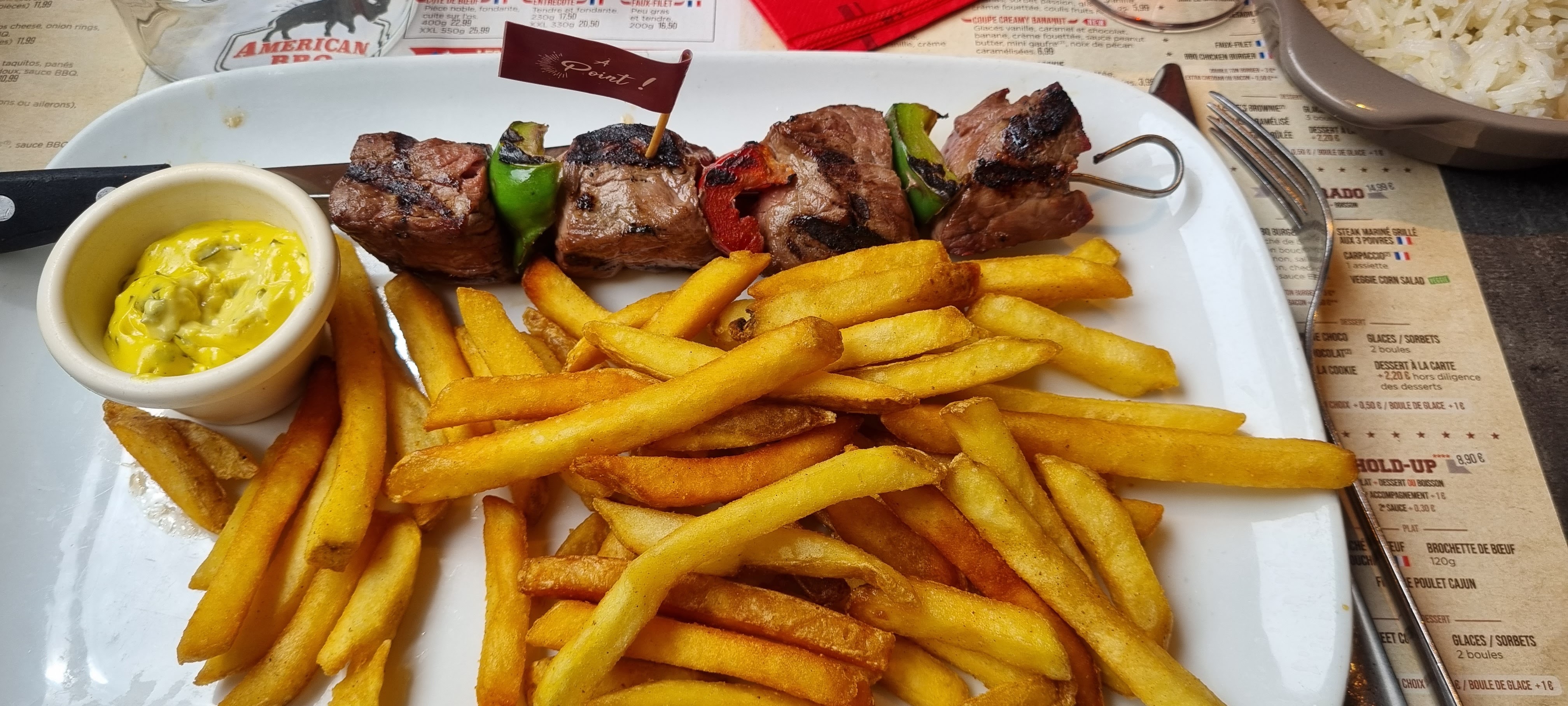 Sympathique accueil chaleureux services rapide viande très bonne mais les frites trop cuite et sec et pas de moutarde ni sel sur les tables
