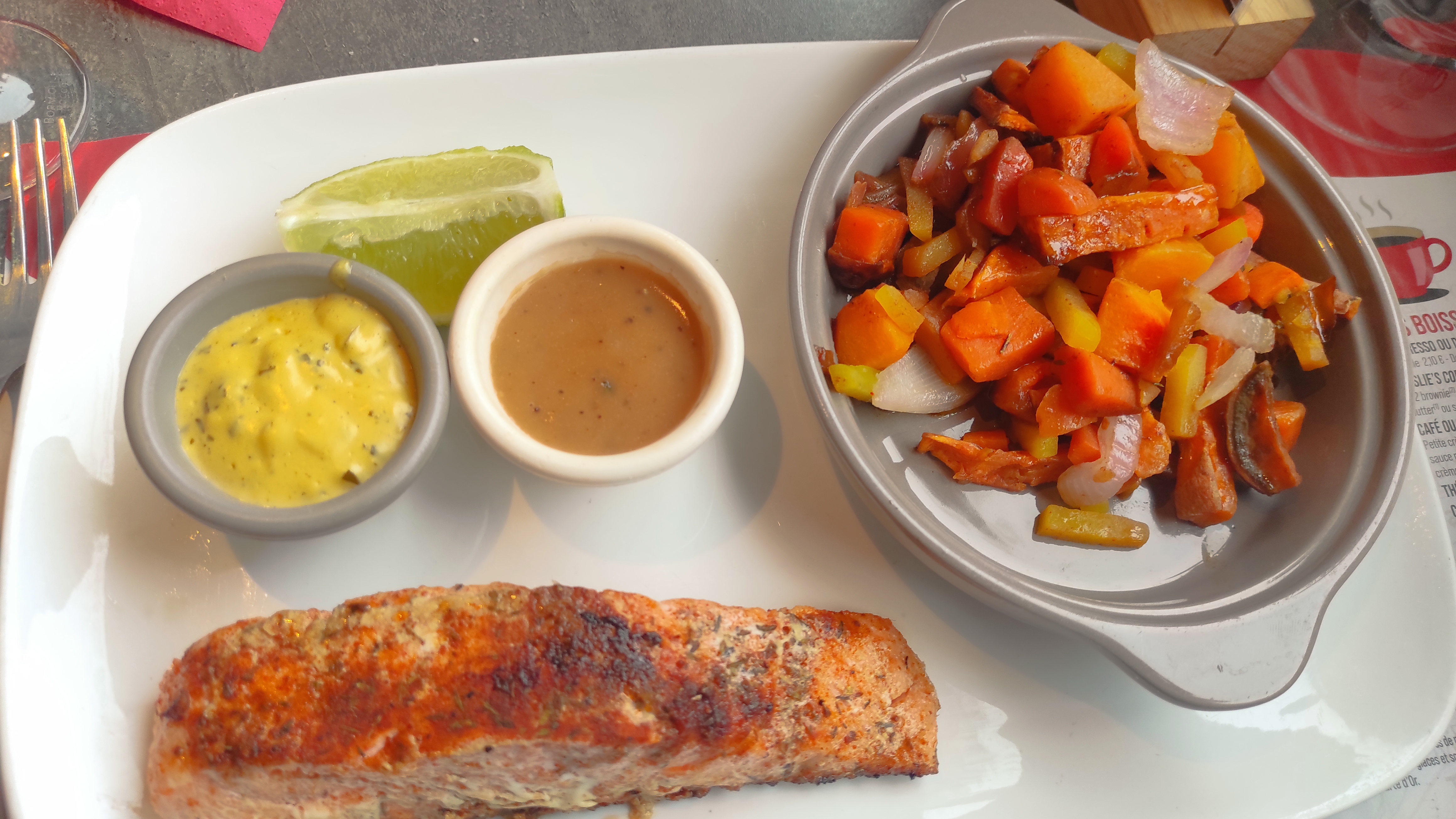 Après une expérience mitigée quelque temps avant (pas de salade d'accueil, une viande pas très tendre et une portion de légumes minimaliste), très bonne surprise pour cette nouvelle visite pour ma pause déjeuner : la fameuse salade d'accueil, des quesadillas au cheddar et crème à la ciboulette fondantes et gourmandes à souhait, des tranches de pastrami avec une petite salade fraîcheur assaisonnée de façon originale, un steak haché avec un oeuf à cheval et des frites, classique mais vraiment bon, et un pavé de saumon cajun moelleux et goûteux avec une poêlée de légumes d'hiver assez généreuse. Bref, un tir parfaitement rectifié entre la 1ère et 2eme visite 👍