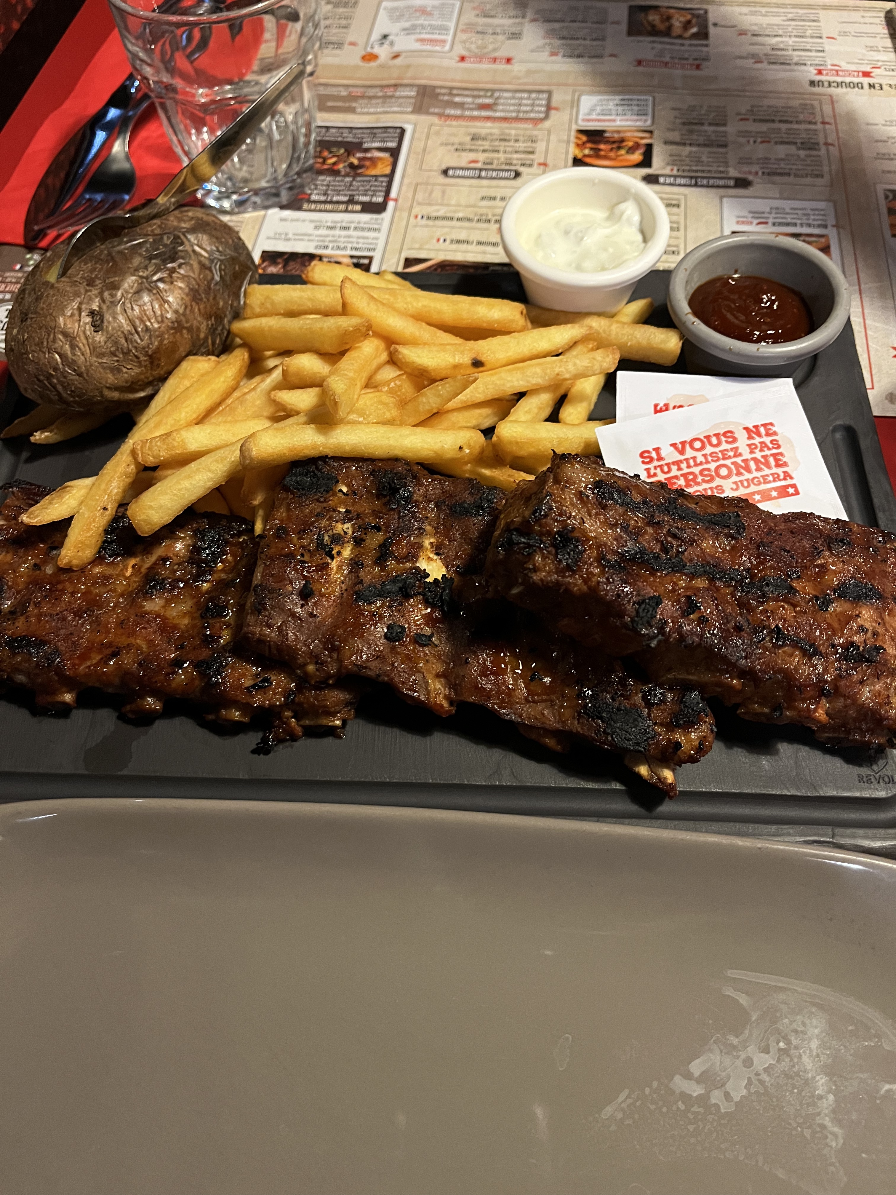 C'était un très bon restaurant mais depuis qq temps on ne retrouve ni la quantité, ni la qualité. Les frites et les onions rings toujours très bon par contre les ribs ... C'est la deuxième fois que nous sommes déçus, ils n'ont plus le même goût et sont bien plus petits qu'il y a quelques mois. Mais le pire reste les gros morceaux de brûlé, sur la face cachée bien sûr (photo 1 face visible, photo 2 le dessous). Je me demande depuis combien de temps les grills n'ont pas été nettoyés. Vraiment dommage !