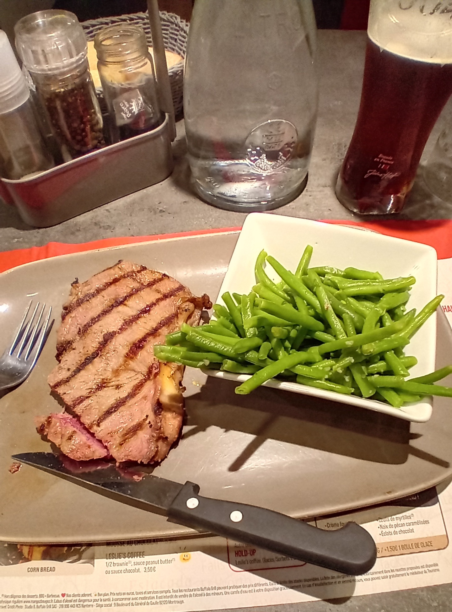 Ça faisait des années que je n'étais pas allée dans un Buffalo grill. Aurélie la serveuse était très agréable et nous avons été servis rapidement. Attention cependant à La salade d'accueil, qui avait l'air fatiguée. Nous n'avons pas mangé tout notre repas et il n'y a eu aucun soucis pour faire un doggybag. Point à améliorer, les cocktails, la Pina Colada n'était pas bonne, nous n'avons pas réussi à définir si le rhum n'était pas bon, s'il y en avait trop ou si il n'y avait pas assez de lait de coco? Quant au Monaco, il manquait la limonade. Nous ne sommes pas formalisé. Cela reste malgré tout une bonne expérience.