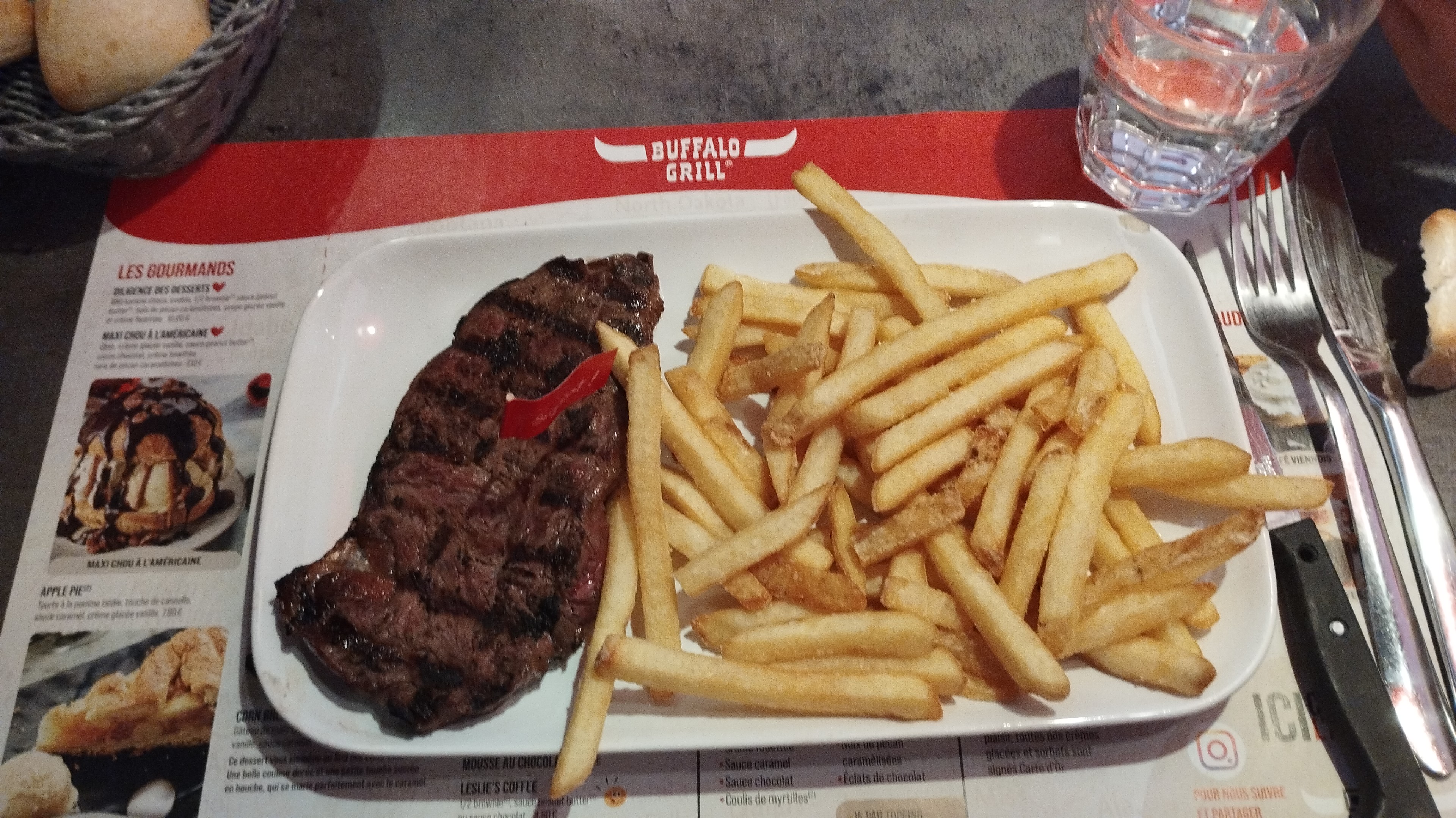 Nous ne retournerons pas au Buffalo Grill. Déjà, pour notre fille engagée auprès des animaux, les oeufs proviennent tous de poules élevées en cage (alors qu'une chaîne concurrente utilise des oeufs de poules élevées en plein air, que ce soit dans les plats ou les préparations). De plus, si mon mari s'est régalé avec ses ribs, les frites n'étaient pas terribles et ma bavette était filandreuse. Pour un repas à 80€, sans vin, la qualité est à revoir.