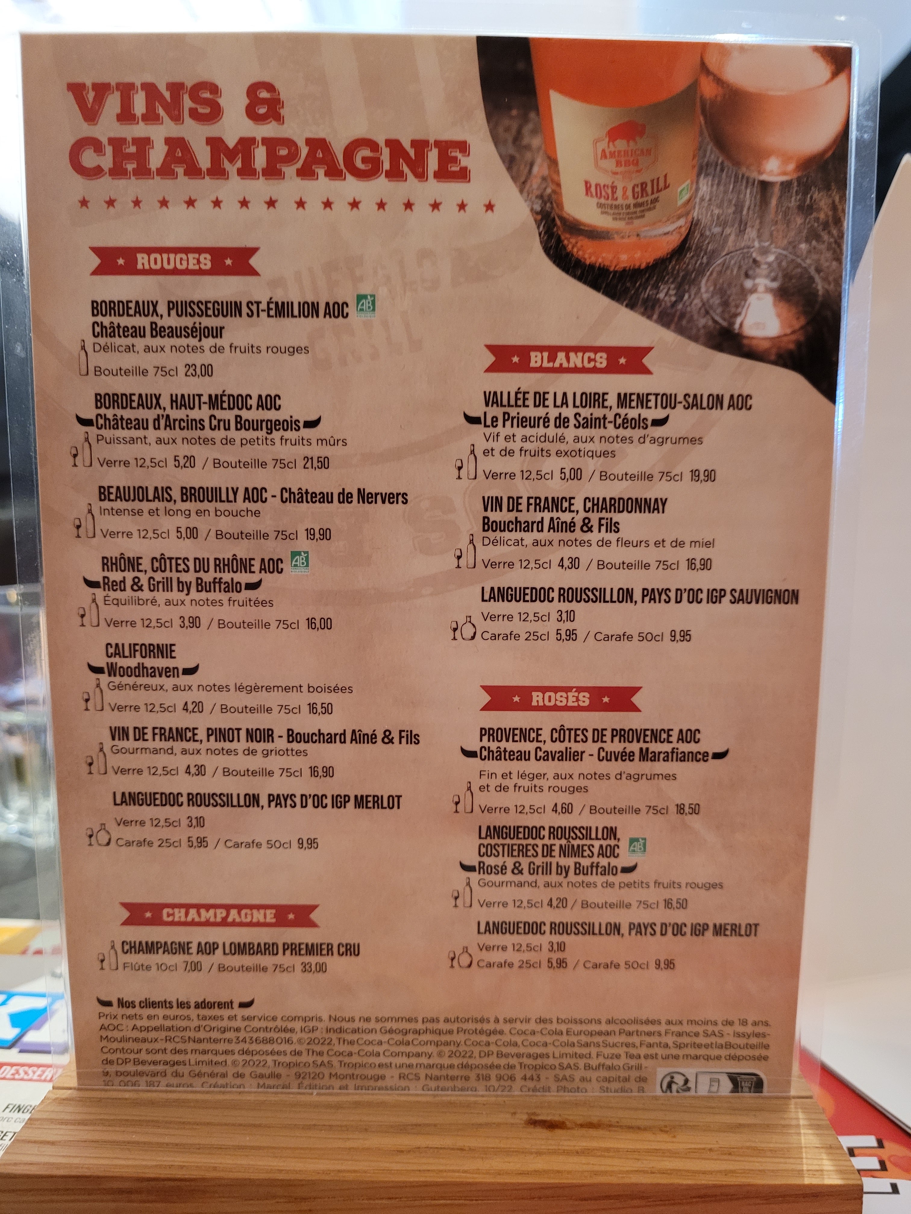 Le restaurant est bien entretenu. Le service a été rapide et les serveurs sympathiques. Habitué de Buffalo, nous remarquons l'augmentation des prix et surtout la baisse de qualité. Assiette trappeur: 3 pauvres morceaux de bison, un ribs réduit et un demi blanc de poulet à la place du bœuf. Tout ça pour 26€. 92€ pour 3 sans dessert, sans entrée, ça commence à chiffrer. Dommage. Commander par téléphone rend l'expérience très impersonnelle. Ps: assiette arrivée froide, nous avons dû demander de la réchauffer.