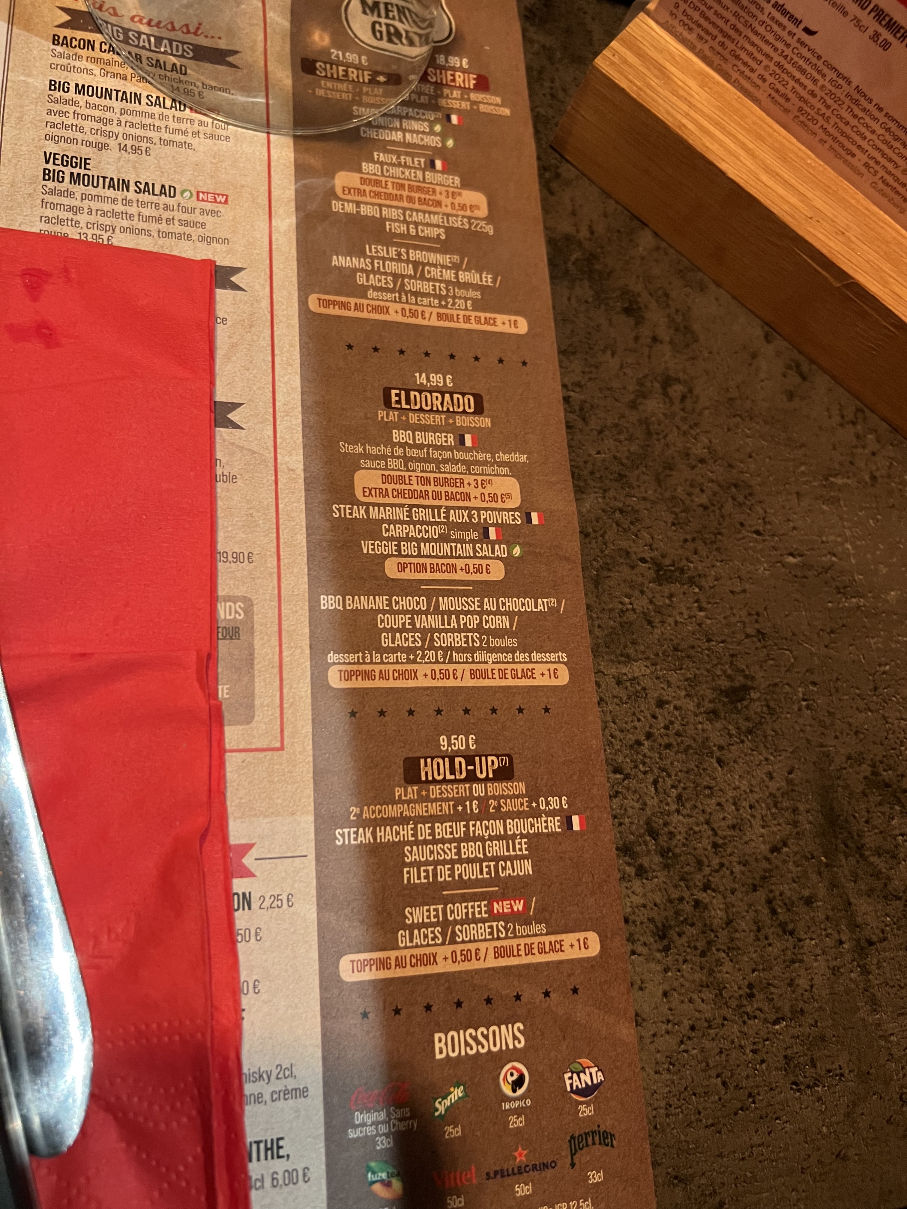 Alors bonjour. Tout d'abord je vais comparer à celui de st mitre (celui detruit) tout d'abord l'ambiance. C'est monotone, des murs gris. Plus les fameux tableaux d'indiens. Plus aucune reference aux indiens. Plus les fameux chapeaux qu'on pouvait recup gratuitement en carton en forme de chapeau d'indiens. L'ambiance n'est plus rouge mais gris terne ! Les serveur : Certains serveur passer à coté de nous et on sentait leur transpiration passer dans nos narines.. les gars.. mettez un coup de deo de temps en temps.. on préfèrerais. Le serveur nous stresser, nous angoisser.. chaque passage. C'etais la mort qui passer à coté de nous. Prête à en découdre. On a du utiliser un antidote cobtre ce poison mortel. (Du parfum sur nos poignets pour respirer) Pour la nourriture : Le pain est dur comme de la brique (j'ai failli m'ettoufer en prenant une grosse part). Le pain est assez dure pour assomer quelqu'un. Les salade ne sont plus dans des bols mais dans des gamelles domc moins de salade. J'ai pris un menu sheriff + avec une entree carpaccio qui etais ennuyant.. adieu à la pluie de parmesan bonjour aux 7 copeaux J'ai pris comme plat bbg ribs caramelisé apres des os enorme est une viande casi inexistante. Des frites en accompagnement fades et cartonneux.. Mon amie a pris un faut filet bien cuit (brulé..) fade avec une salade nul.. si nul.. une salade juste verte.. juste les feuilles.. rien d'autre.. pas comme celle de bienvenue qui a des haricots rouges, des ptits pois et une sauce au poivre sans gout.. Le desert : J'hesiter à prendre un brownie mais j'ai demander sa taille.. je me suis rapatrier sur des glaces qui ont mi 1000 ans pour arriver.. des Glaces ! Genre pas un parfait. Juste des sorbets.. ça prend 5 min au max.. on a pas demander des biscuits speciaux. Donc il y a pad de raison Le service comme beaucoup disent et très lent ! Bref à éviter. Surtout pour ceux ayant connu l'ancien et sont venu ici pour la nostalgie. En bref une torture (surtout à cause du serveur puant)