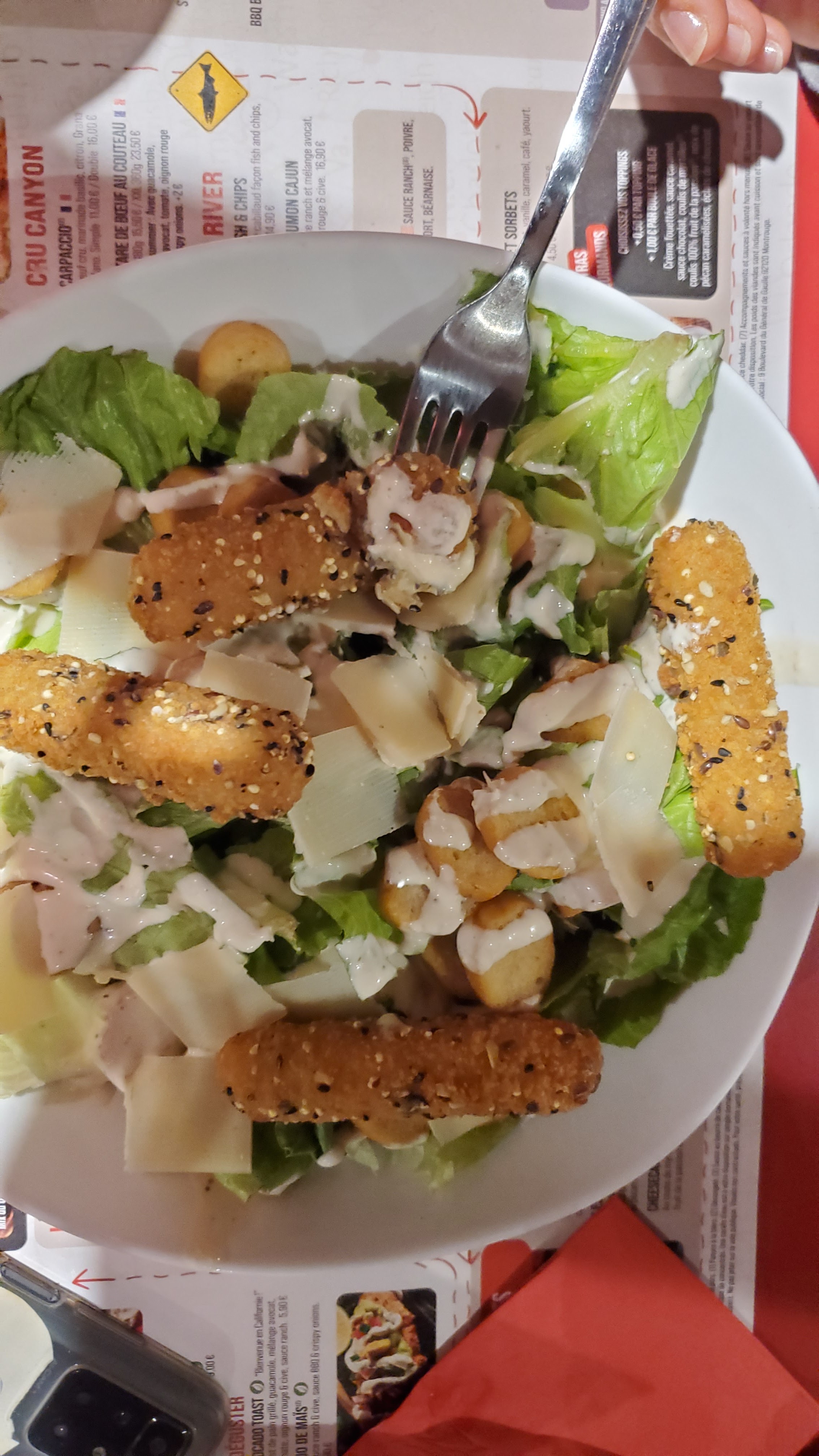Nous sommes venus manger à deux, ce midi. J'en garde un goût amer. Déjà, le ton est donné avec la salade d'accueil qui avait bien vécue et n'était plus de première fraîcheur. J'en conviens qu'elle est gratuite et qu'elle s'appelle salade de bienvenue, mais lorsque l'on veut souhaiter la bienvenue à ses clients, on leur sert quelque chose de convenable car ça peut laisser planer un doute sur la qualité et la fraîcheur des plats à venir... De plus, je souhaite manger un filet de poulet cajun, la serveuse prend la commande et revient me voir cinq minutes plus tard pour me dire qu'il n'y en a plus. Les équipes de salle ne font pas le point avec les cuisines, avant le début du service ? Par dépit, je choisis les fish and chips et quelle surprise de voir quatre minuscules morceaux de poisson pané, facturés tout de même 14,50 €. A ce tarif pour une si petite quantité, on se fiche un peu du client... Comme avec la salade d'accueil... Vous devriez songer à mettre du pigeon sur la prochaine carte... En plus, j'ai vu un serveur débarrasser la table d'un client, après son départ et là, stupéfaction !!! Le client n'a bu que du vin, donc n'a pas utilisé son verre à eau. Du coup, le serveur a pris le verre et l'a rangé avec la vaisselle propre !!! Honteux !!! Qui dit que le client n'a pas touché le verre même s'il n'a pas bu dedans ? Ce verre aurait dû partir en direction de la plonge. Avec l'expérience d'aujourd'hui, je ne suis pas certaine de remettre les pieds dans l'établissement qui ne m'a vraiment pas donné une bonne image, ni de gestion, ni d'hygiène...