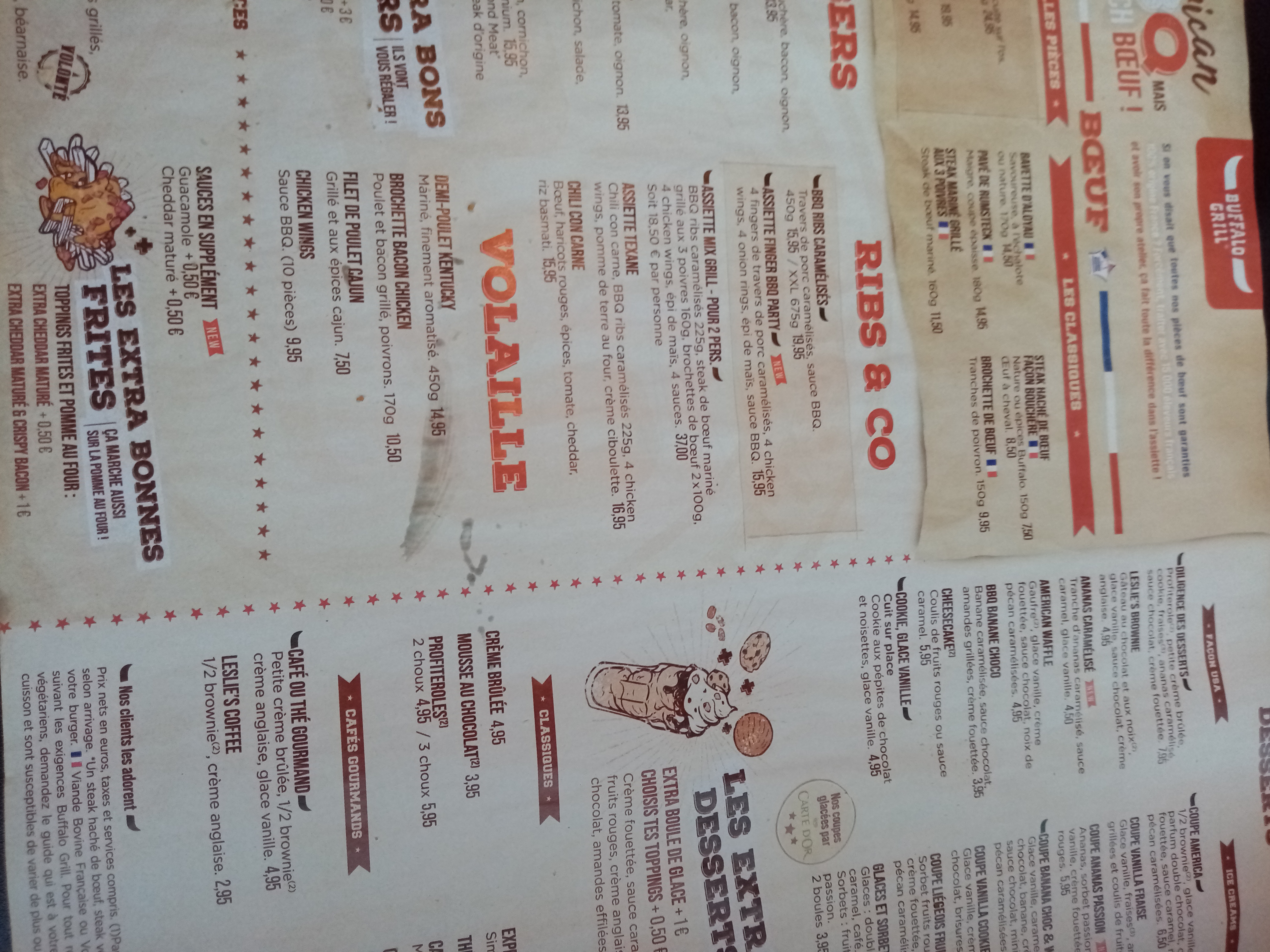 Le service a été très lent et il y avait de nombreuses erreurs sur la commande. Nous avons commandé 3 steaks saignants : j'aurai du prendre une photo mais les 3 steacks faisaient peine à voir, ça n'avait pas l'air frais... Ils étaient archi cuits et surtout je pense que c'était des steaks trop cuits qui ont été cuits de nouveau ! Nous avons demandé de changer les steaks. Les nouveaux steaks étaient deux fois plus gros et été frais. Portion de frites ridicules mais bon c'était anecdotique par rapport aux problèmes sur les boissons, temps d'attente et la cuisson/fraîcheur douteuse des steaks. J'en ai parlé au jeune responsable qui m'a indiqué sur un ton très léger que j'avais eu raison de changer les steaks. Aucun doute que rien ne va changer pour ce restaurant vu sa réaction. Dn conclusion : vous pouvez éviter ce buffalo grill.