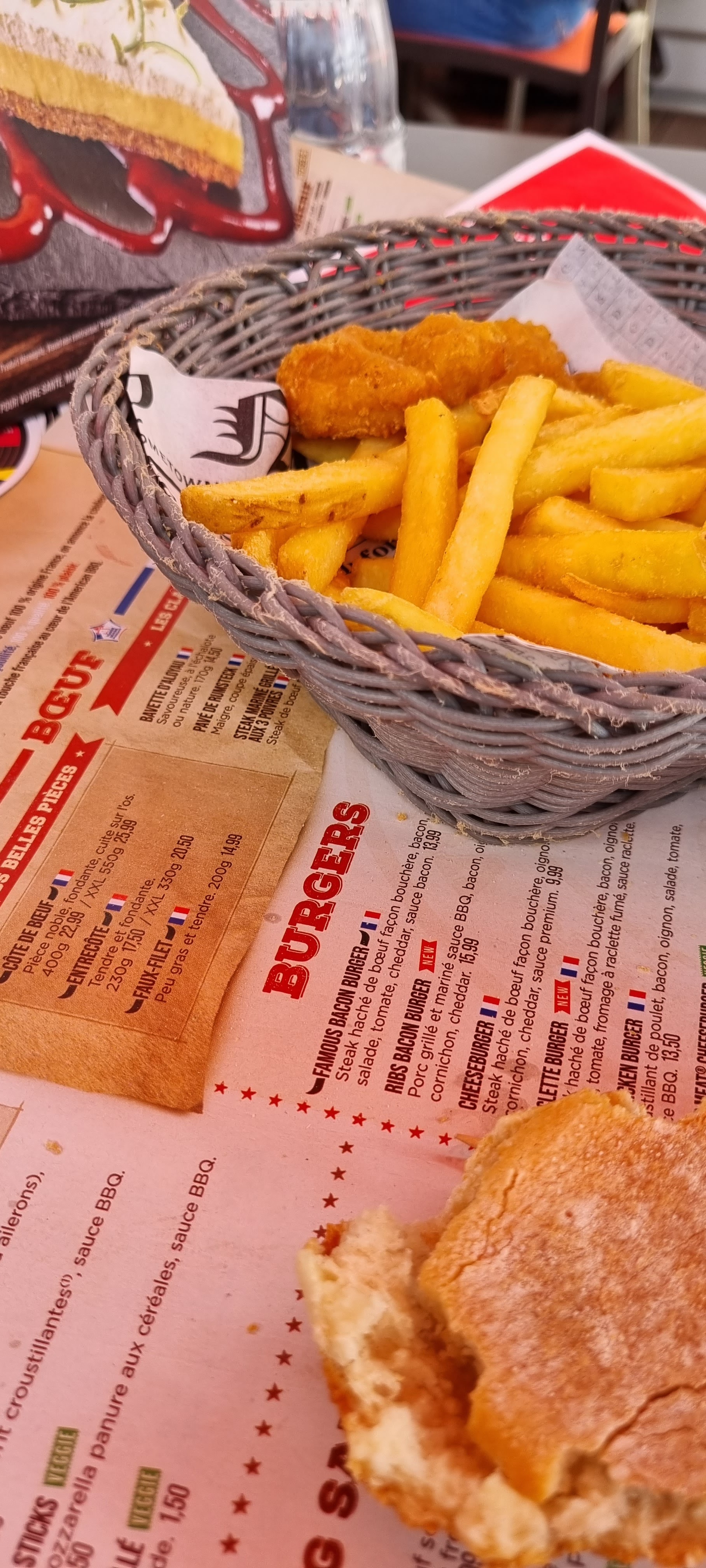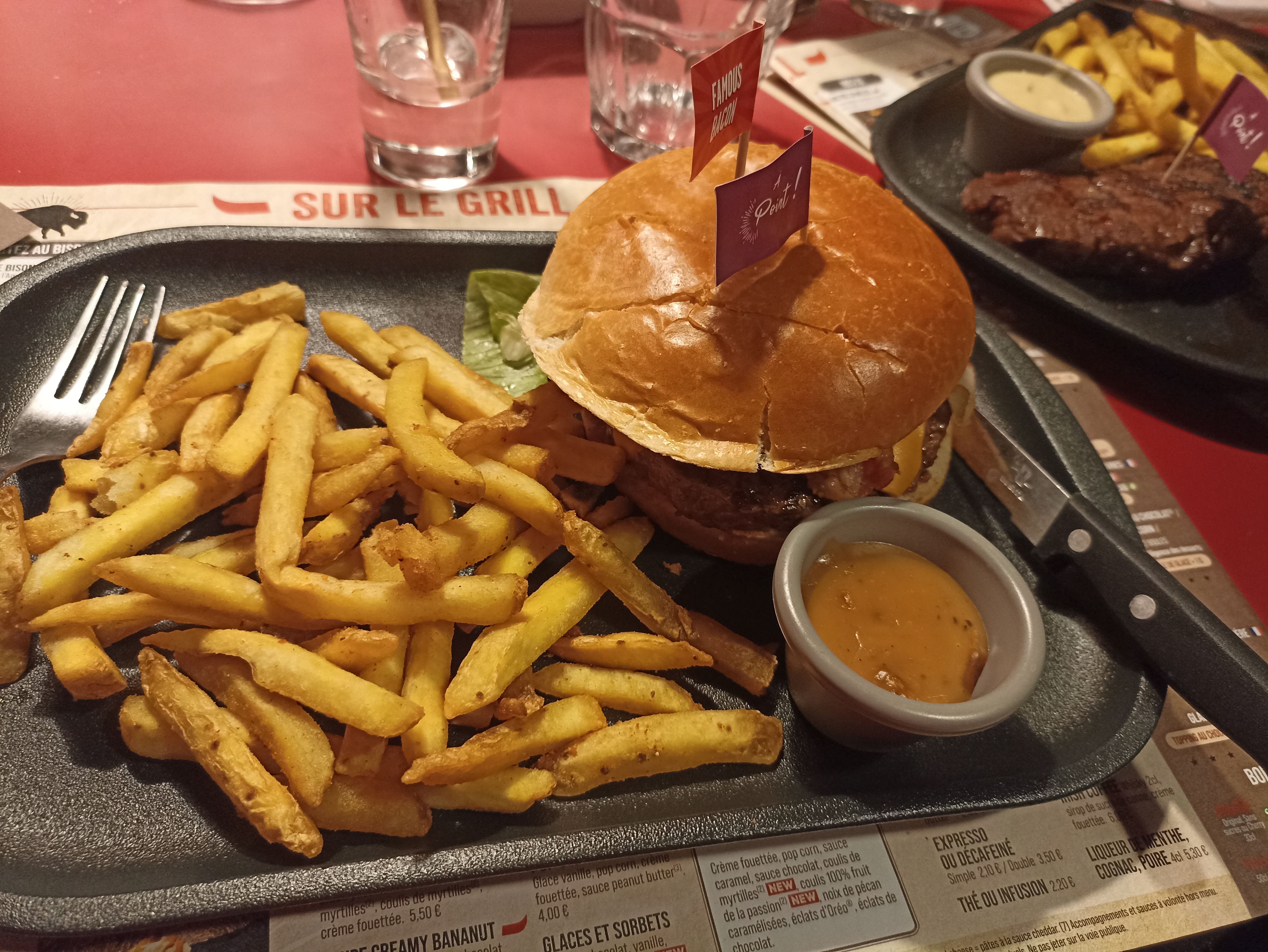 Edit: 17 février 2024! Toujours pas assez de frite pourtant demandé des le départ.... Viande terminée et frites jamais arrivé ! Dessert Leslie coffee revue À la baisse sans la glace ! 3 serveuses différentes pour notre table, c'est sympa mais pas efficace. Bref, bien que la réponse aimable de la chaîne va vers l'écoute pour améliorer le service. En réalité, c'est une fumisterie car rien n'a évolué !!! En 2021..... Accueil très professionnel et sympathique avec du personnel qui respecte à la lettre les gestes barrières qui font que vous passez une soirée en toute sérénité. De plus les consignes données en cuisine ont été entendues sur la cuisson et l'accompagnement. La cuisine est est de ce qu'on attend d'un restaurant grill de la chaîne. Repas enfant assez copieux. Erreur quand même sur commande du dessert de Mme. A contrario, je trouve qu'un chien d'un client n'a pas sa place dans un restaurant. Dommage je retire 1 étoile.. Retour au 15 sept 2021, viande ok et goûteuse par contre les frites se battent en duel dans l'assiette... Je repars avec la faim .... Bref pas si top au final... Dommage