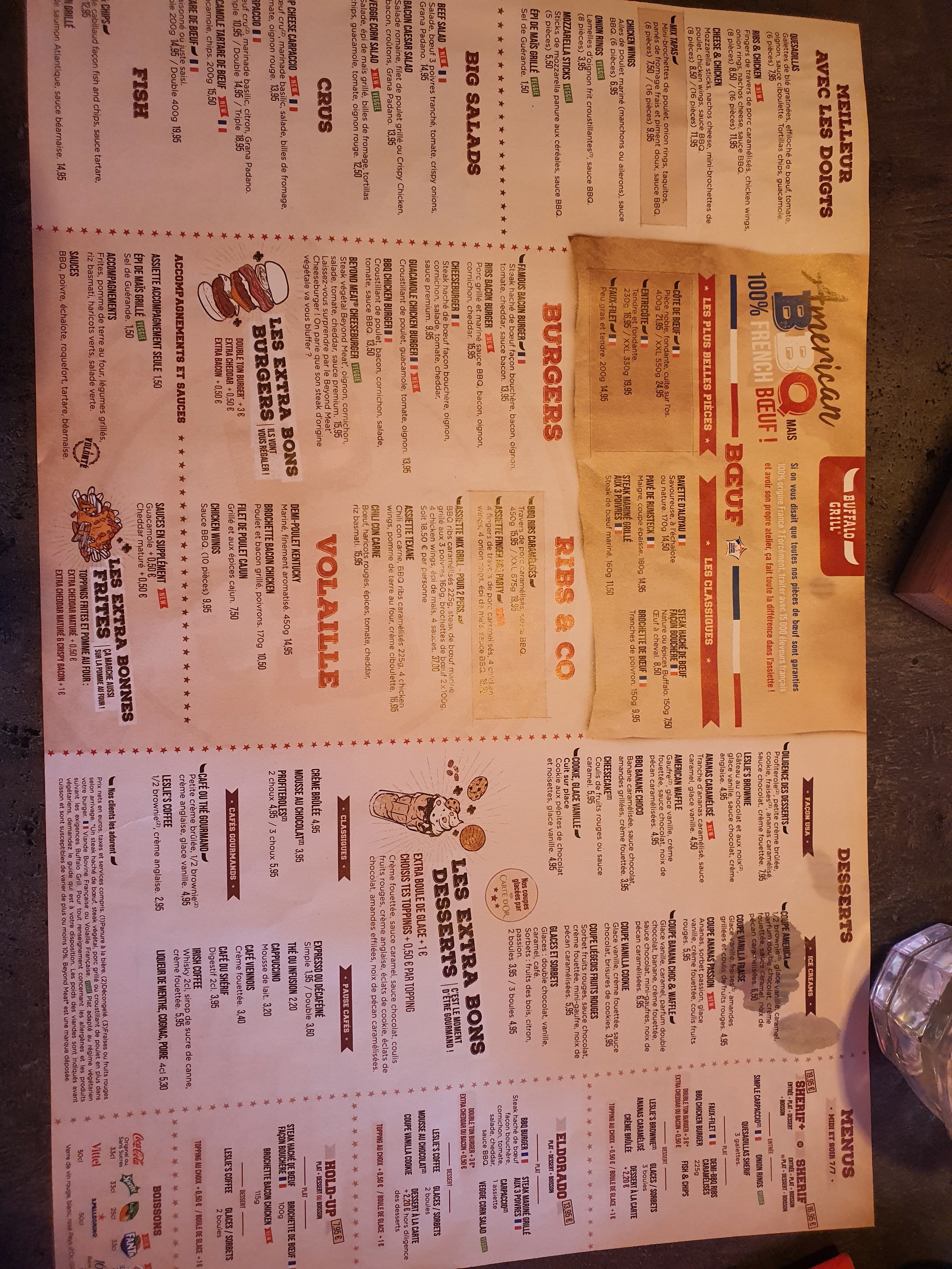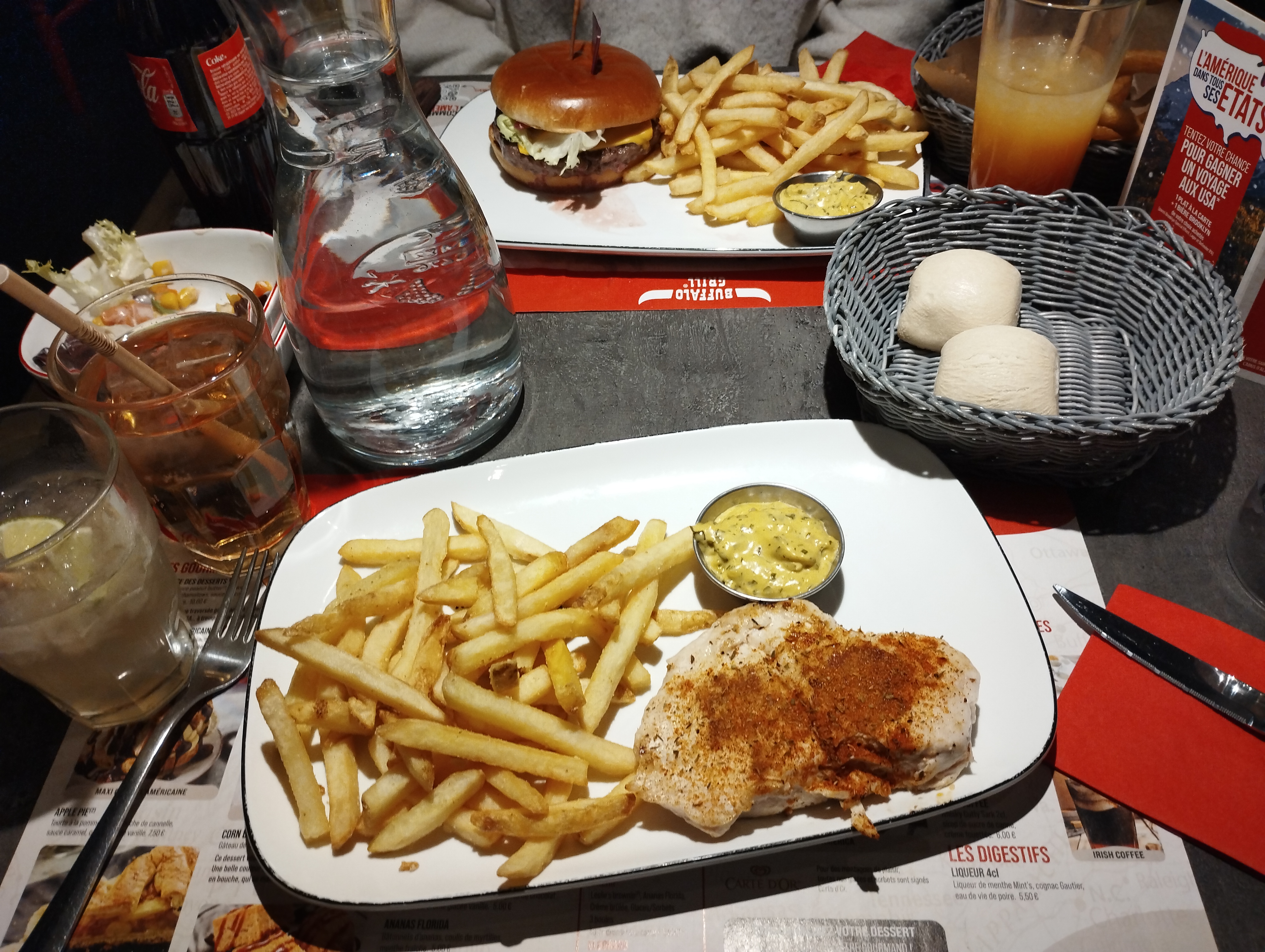 Nous sommes arrivés, on a attendu 5 minutes avant d'être placer, la jeune fille au bar fesait des cocktails, personne d'autre pour s'occuper de nous. Ensuite on nous emmène les salades, une pour mon mari, une pour moi et pas de salade pour ma fille, pareil pour le pain, 2 pain pour 3 ! Ensuite on prend des cocktails, j'ai du aller les chercher au bar, car ils étaient prêt depuis un moment, mais un gentil serveur m'a dit laisser je vous les emmènent. Du coup j'ai eu mon cocktail et ma boisson de mon menu en même temps. Ensuite on a demander deux fois du pains, on l'attend toujours. Un client a demander 3 fois et a finis par râler sur le serveur. Ma viande ( bavette d'aloyau ) trop dur, et froide, ma fille deux fish and chips Ah et puis toujours en panne de machine pour faire les barbes à papa. Et on nous a même pas emmener une carafe d'eau, on a pas oser demander car bon je pense qu'on l'aurait attendu comme le pain J'ai voulu faire une super sortie en famille, qui a plutôt été gâcher, nous ne viendrons plus je pense dans ce buffalo Je pense qu'il y a eu un changement de propriétaire, car ce n'est pas comme avant. Dommage, avant c'était mieu, c'était plus convivial On ne reviendra pas, déçu
