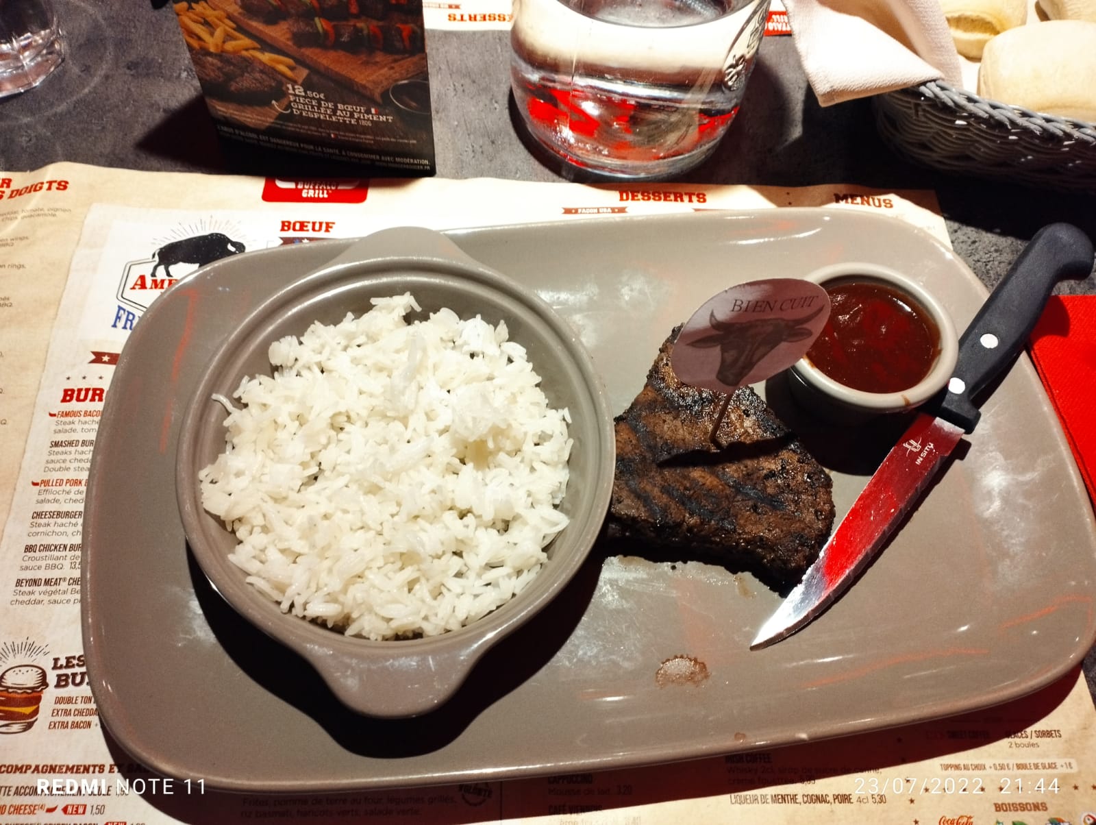 Nous avons bien manger la viande était tendre et bonne ormis un problème entre le poids de l'entrecôte et la côte de bœuf car la côte de bœuf de 550 grammes était vraiment plus petite que mon entrecôte de 400 grammes donc je pense qu'il y a du avoir un problème en cuisine cependant ce problème a été résolu en caisse sans problème le serveur a été très réactif et serviable