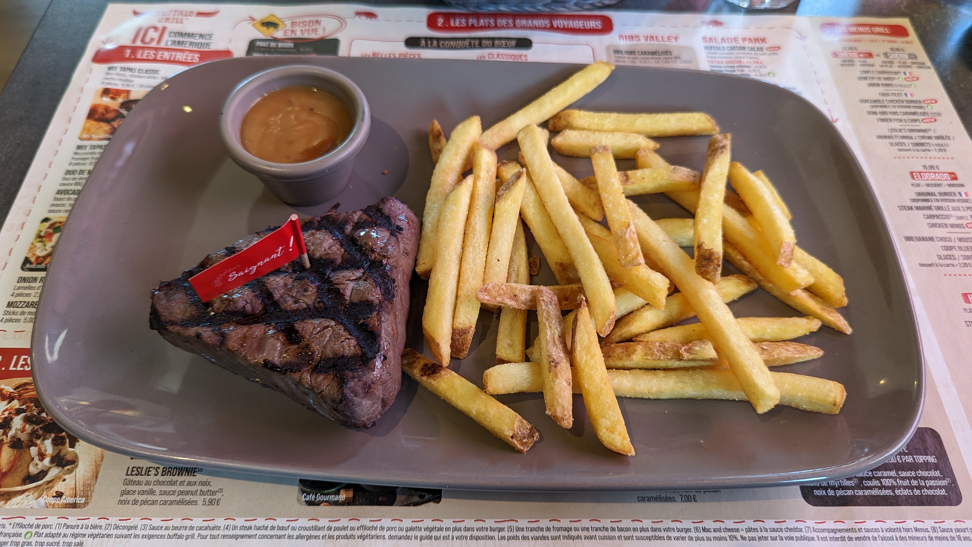 Hier soir nous décidons de venir pour la première fois avec mon conjoint, nous sommes placés à côté de tables très bruyantes, super pour essayer de passer une bonne soirée… après avoir demandé à changer de place nous sommes replacés dans un endroit plus calme. Ensuite viens le moment où nos plats arrivent, mon conjoint a pris une « entrecôte » qui avait le goût de l’eau et rien d’autre… la sauce au poivre qui l’accompagnait n’avait que très peu le goût du poivre, les frites industrielles ils faut pas se leurrer… quant à moi mon pavé de bison avait plus le goût du bœuf bref.. Nous décidons de partir sans finir nos plats, une fois à la caisse nous expliquons ce qui n’allait pas avec nos plats, et la personne à la caisse nous a fait une « remise » de 10%, il faut noté que nous n’avons manger que quelques bouchées des plats, en bref 55€ (oui quand même) de jeté en l’air. Nous ne recommanderons jamais ce restaurant, et si j’avais pu mettre moins d’une étoile pour les notes je l’aurai fait.