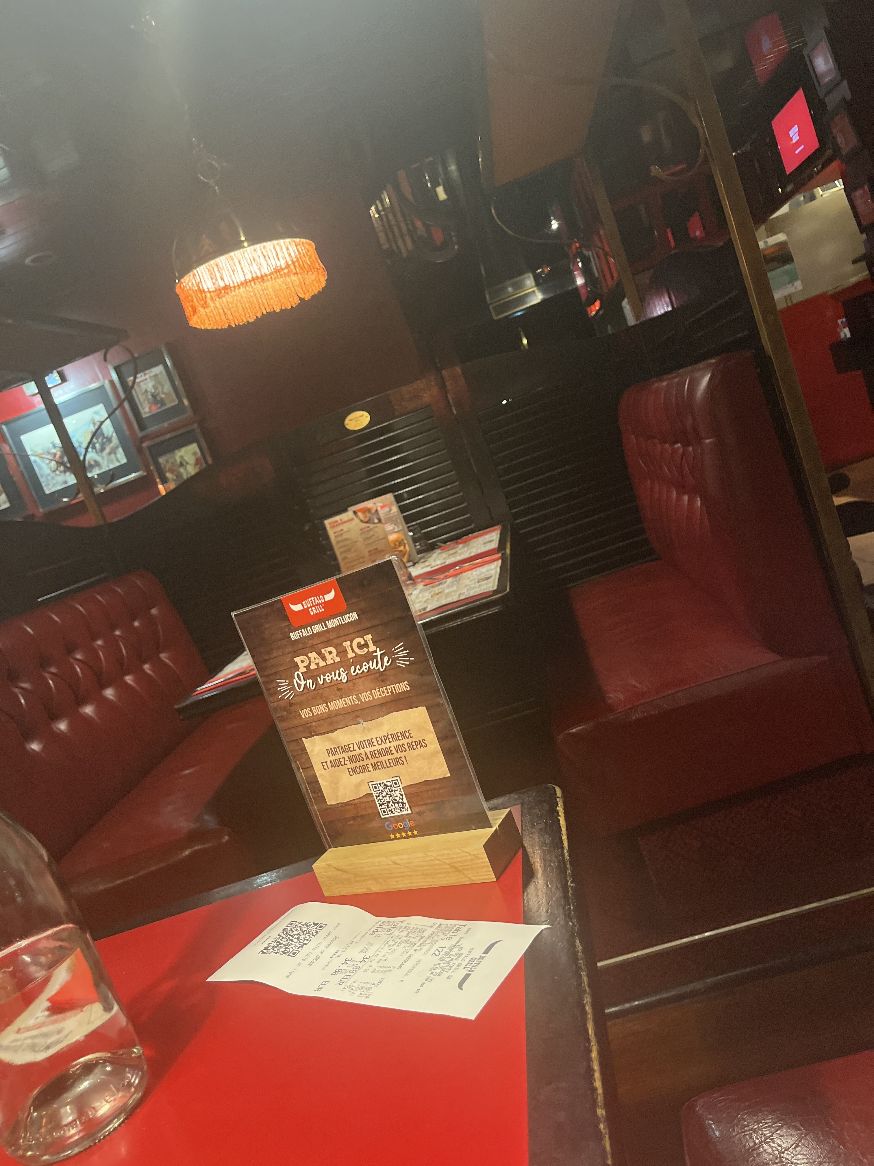buffalo grill était mon restaurant préféré mais après cette dernière mauvaise expérience je ne reviendrai pas de sitôt ! le serveur était sympathique mais la nourriture elle-même était très mauvaise, j'ai commandé ma viande bien cuite ! Elle est crue à l'intérieur et brûlée à l'extérieur ! forte odeur de brûlé et de sang dans l'assiette, les patates très grasses que je n'ai pas pu manger, la commande était fausse ! à la fin ils m'ont fait une réduction de 6€ sur 70€😅 pas cool