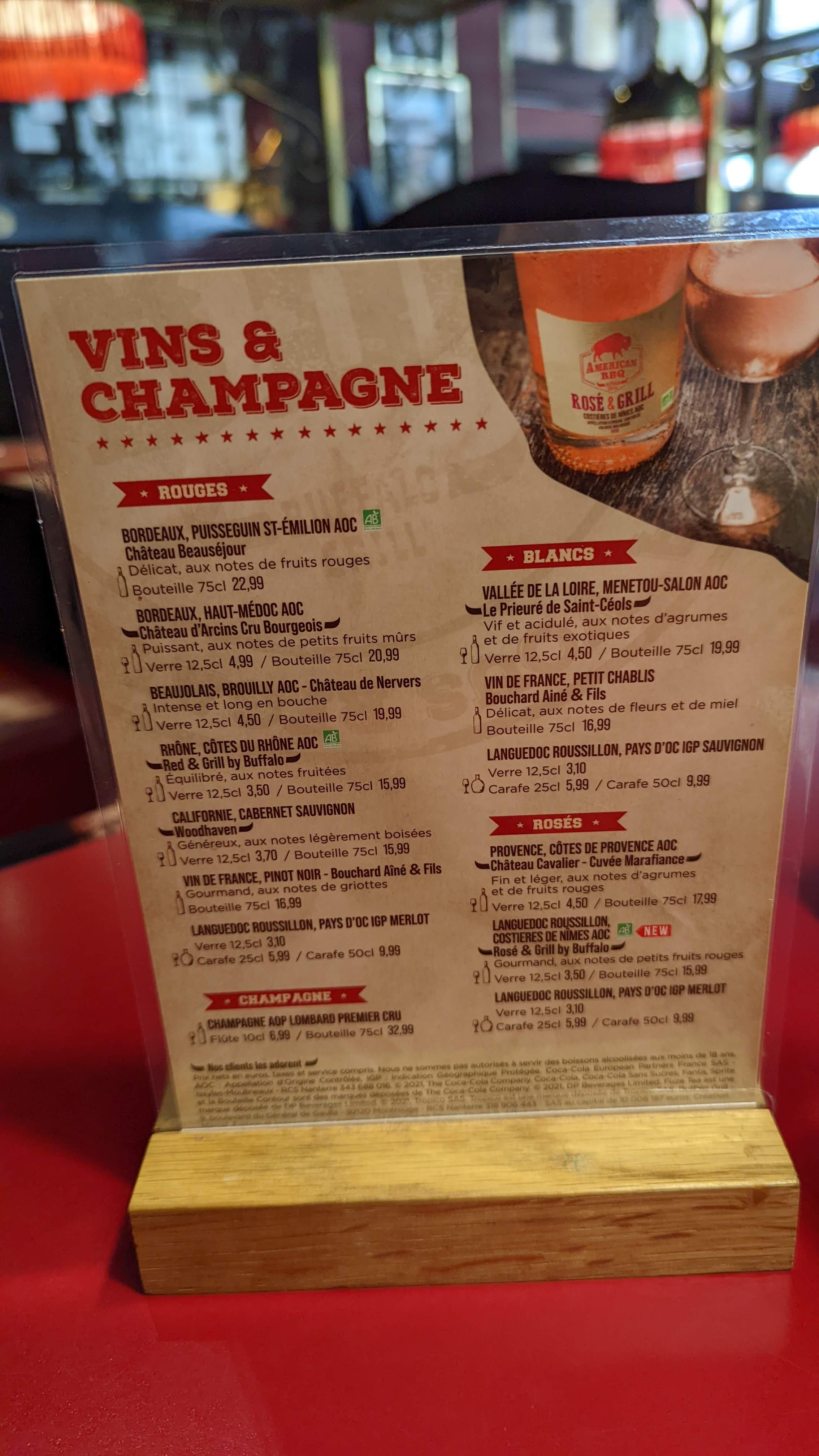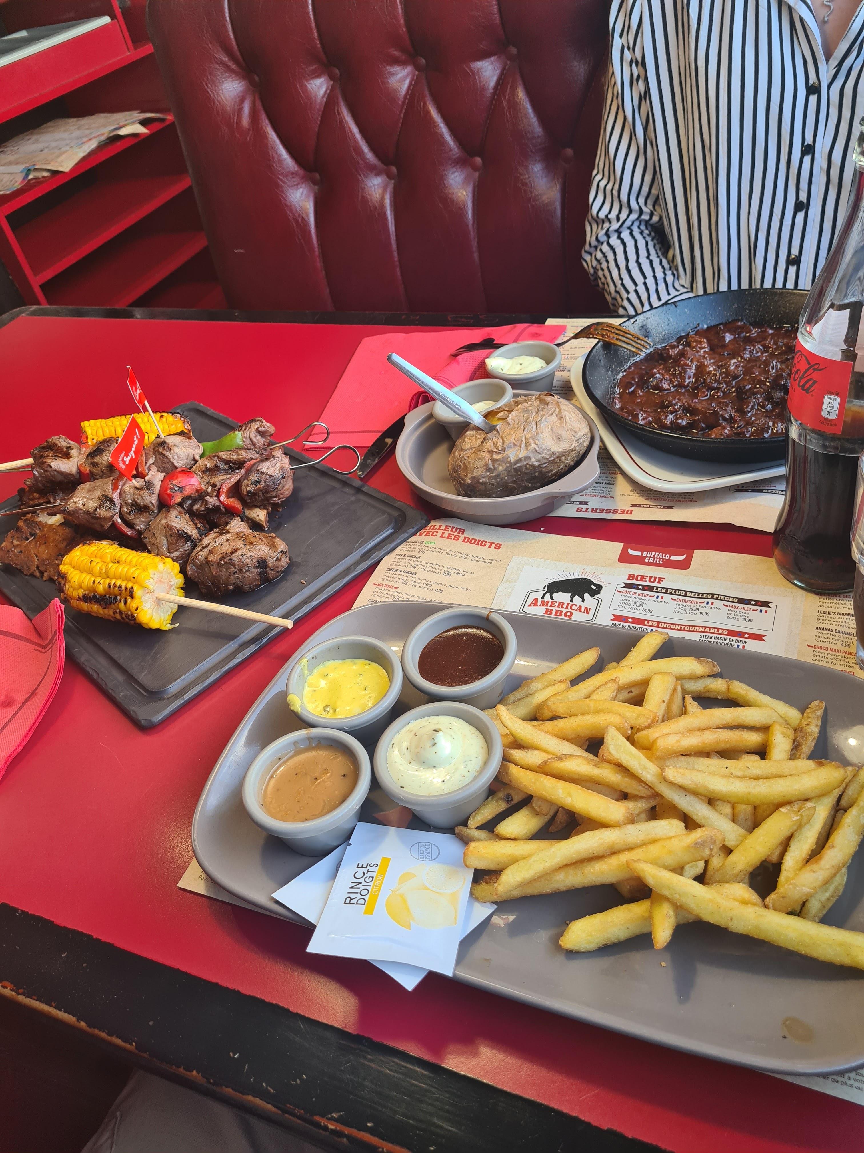 Buffalo un peu comme tout les autres. Personnels qui changent souvent mais dans globalité compétent. Niveau décoration, tous pareil. La salade d accueille n est plus donnée systématiquement mais on vous demande si vous là voulez. Bonne chose, car cela évite le gâchis alimentaire. Mais de plus en plus petite, bientôt il n y aura plus qu une feuille de salade lol. Viande en général bonne même si la dernière fois il y avait beade nerfs dans mon entrecôte. Choix de l accompagnement : frites, riz, haricots ou pomme de terre. Choix de plusieurs sauces. Choix de la cuisson. Niveau dessert, la coupe america n a plus rien de comparable d avant. Niveau prix, de plus en plus chère et moins dans l assiette. La crise financière est passé par là. Pour deux personnes : 2 entrecôtes, un pichet de vin, 50 cl d eau minérale, 1 dessert ( coupe america ) et deux café = 71 €. WC propre, accès handicapés, parking assez grand pour les clients, ce situe sur un grand axe routier au niveau d un rond-point. Accès facile.