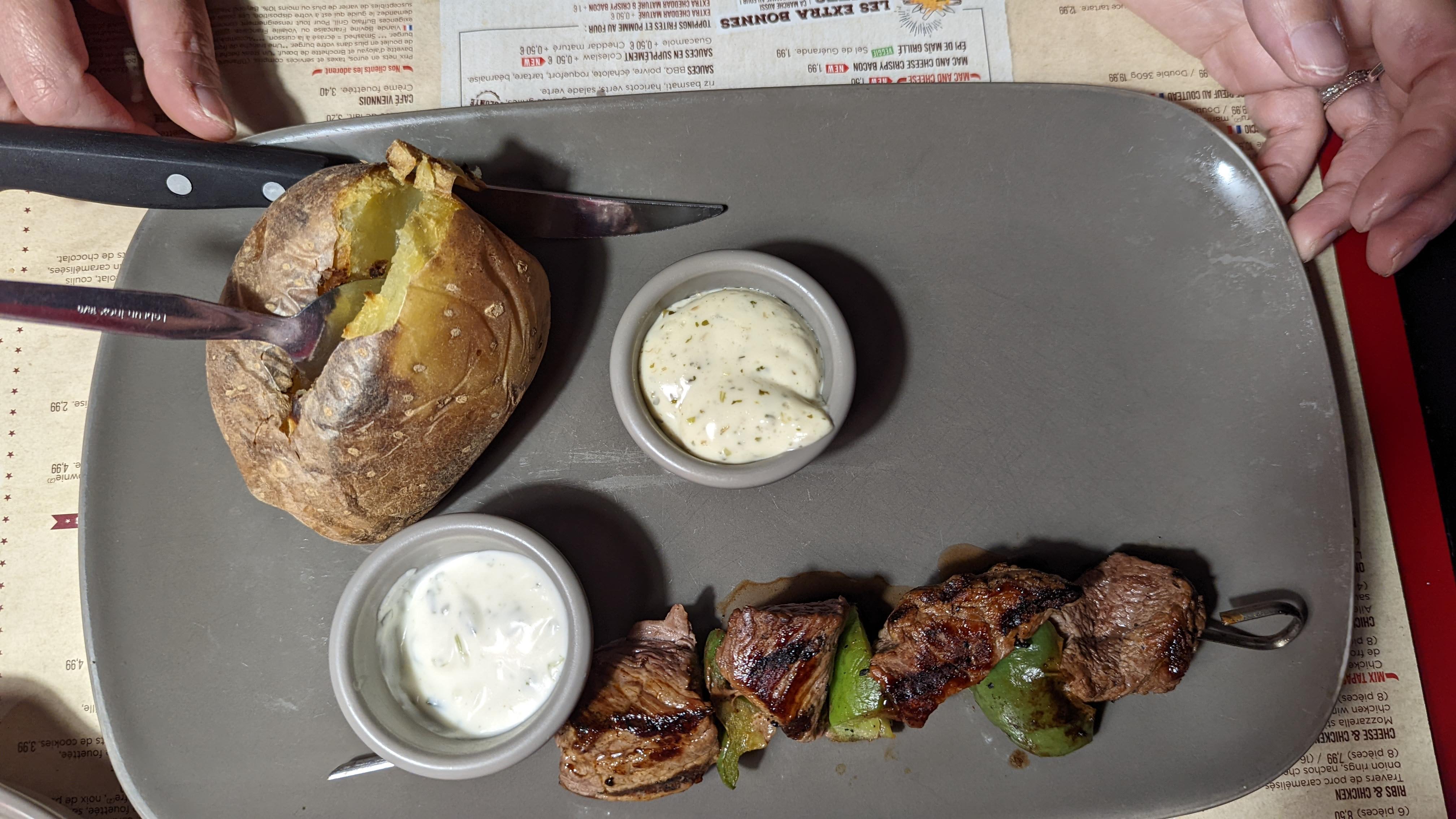 Arriver à 20h00 avec un accueil pas très joviale. Première prise de commande 20h24, servis plus ou moins rapidement environ 15min. La tailles des pains à réduit, je dirais un peux plus petit qu'un kiwi. J'ai pris une viande, j'ai eu avec un couteau à viande qui ne coupe pas la serveuse ma dit on est courant prenez votre couteau à beurre, vous y arriverais plus facilement bon galère quand même. Ma compagne a commander deux sauces roquefort, elle a eu le droit à deux poivre. Même si les sauces et accompagnement sont à volonté cela reste moyen. Ça a bien changé, très déçus.