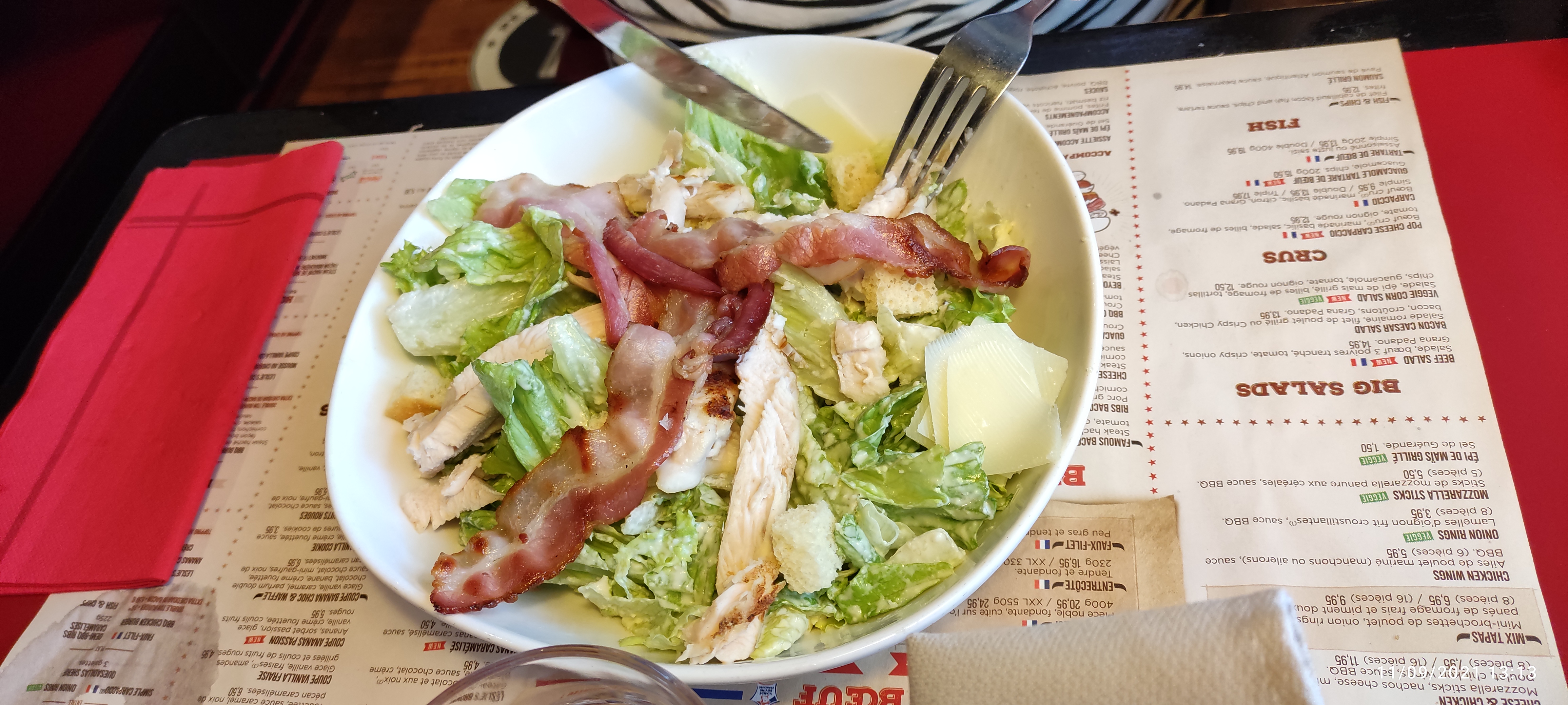 Commandé une salade caesar au prix de 15,90€, et reçu 3 malheureux bout de salade et 2 filets de poulets. Je ne recommande pas de commander chez buffalo pour leur salade caesar, pourtant à un prix bien plus élevé qu’ailleurs. Fortement déçu.