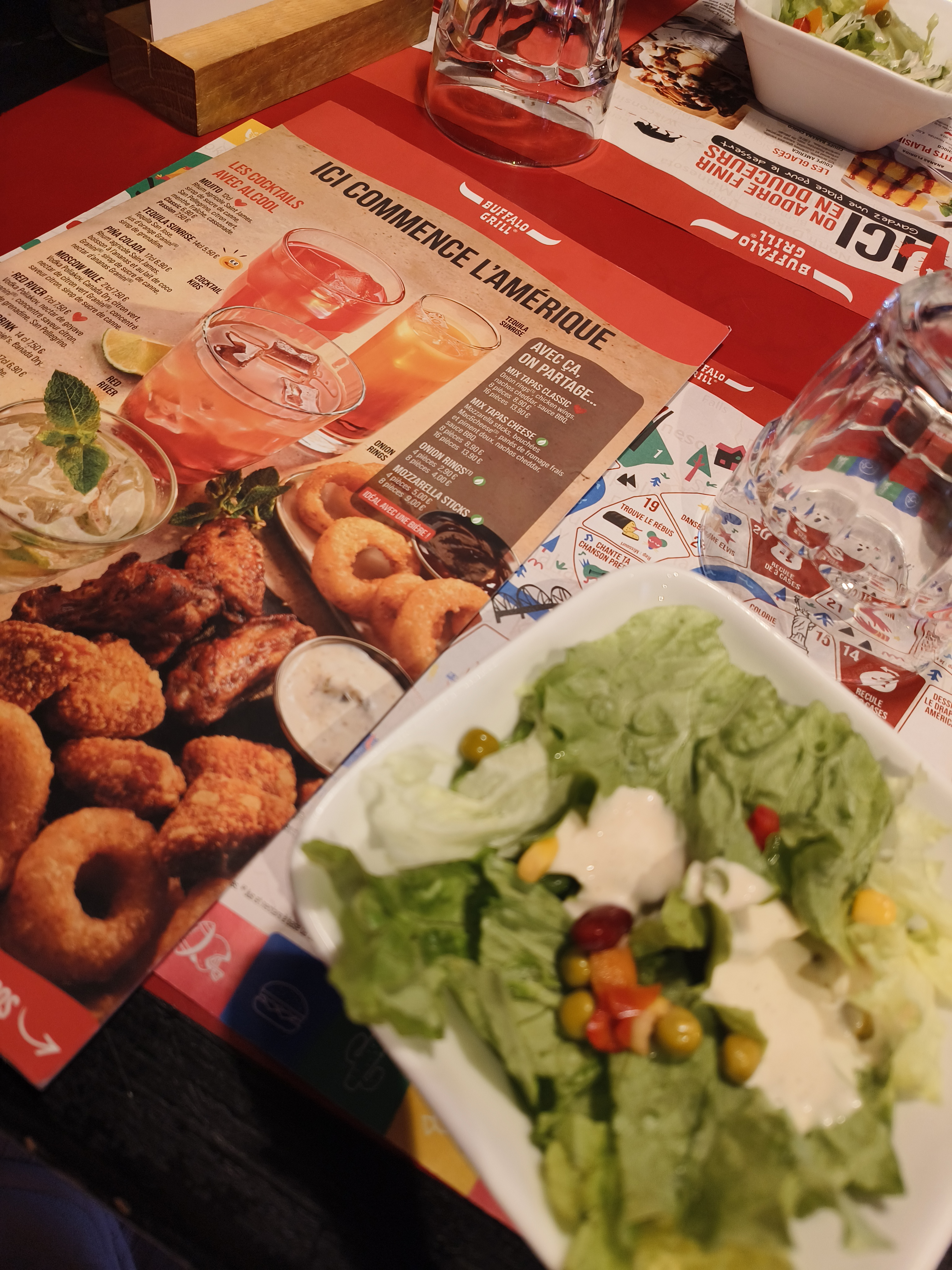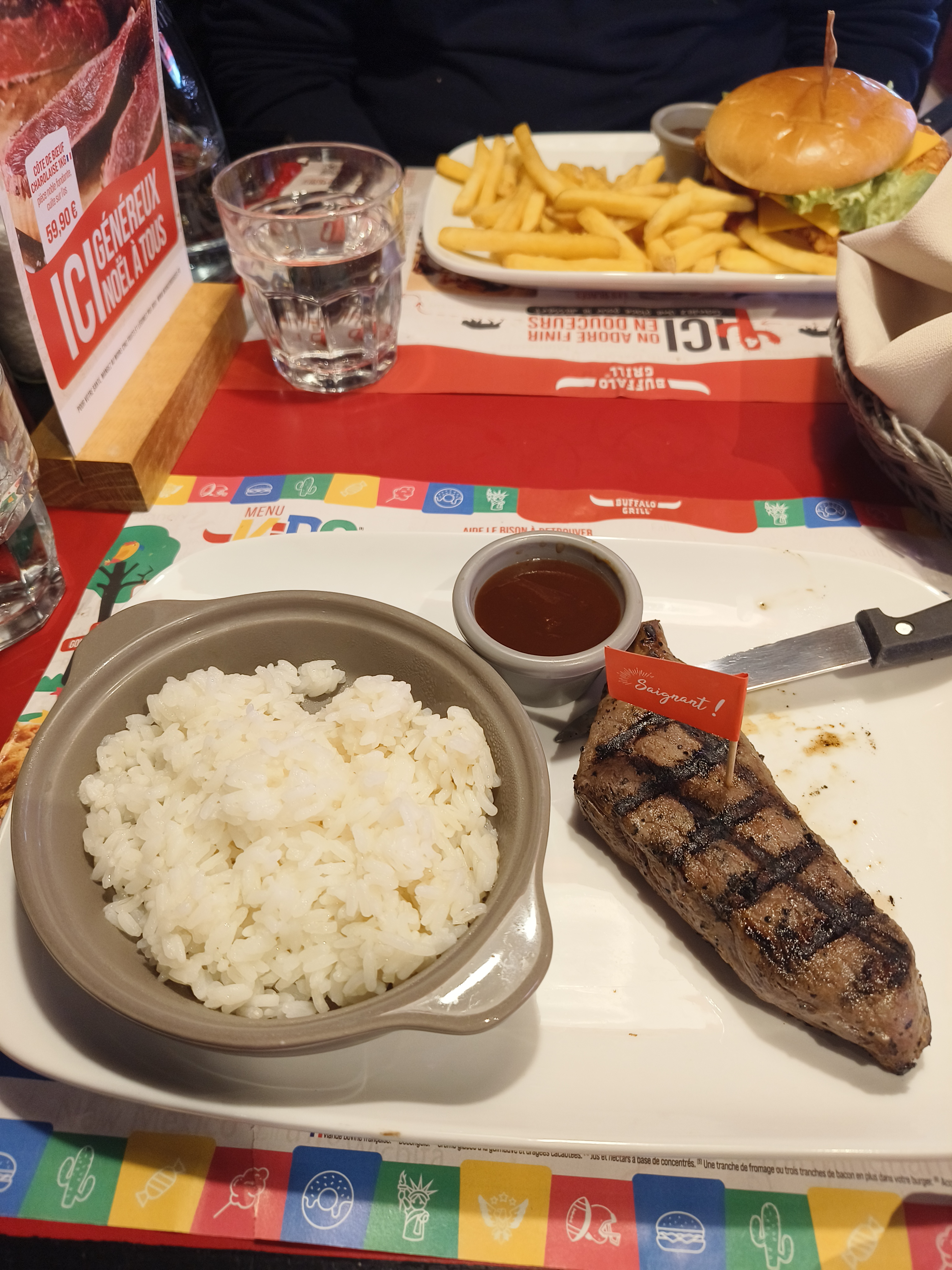 Beaucoup d’attente. Les boissons arrivant quasiment en même temps que les plats. Une viande demandé à point mais elle est bleu, de plus elle est avait beaucoup de gras. Je recommande absolument pas buffalo.