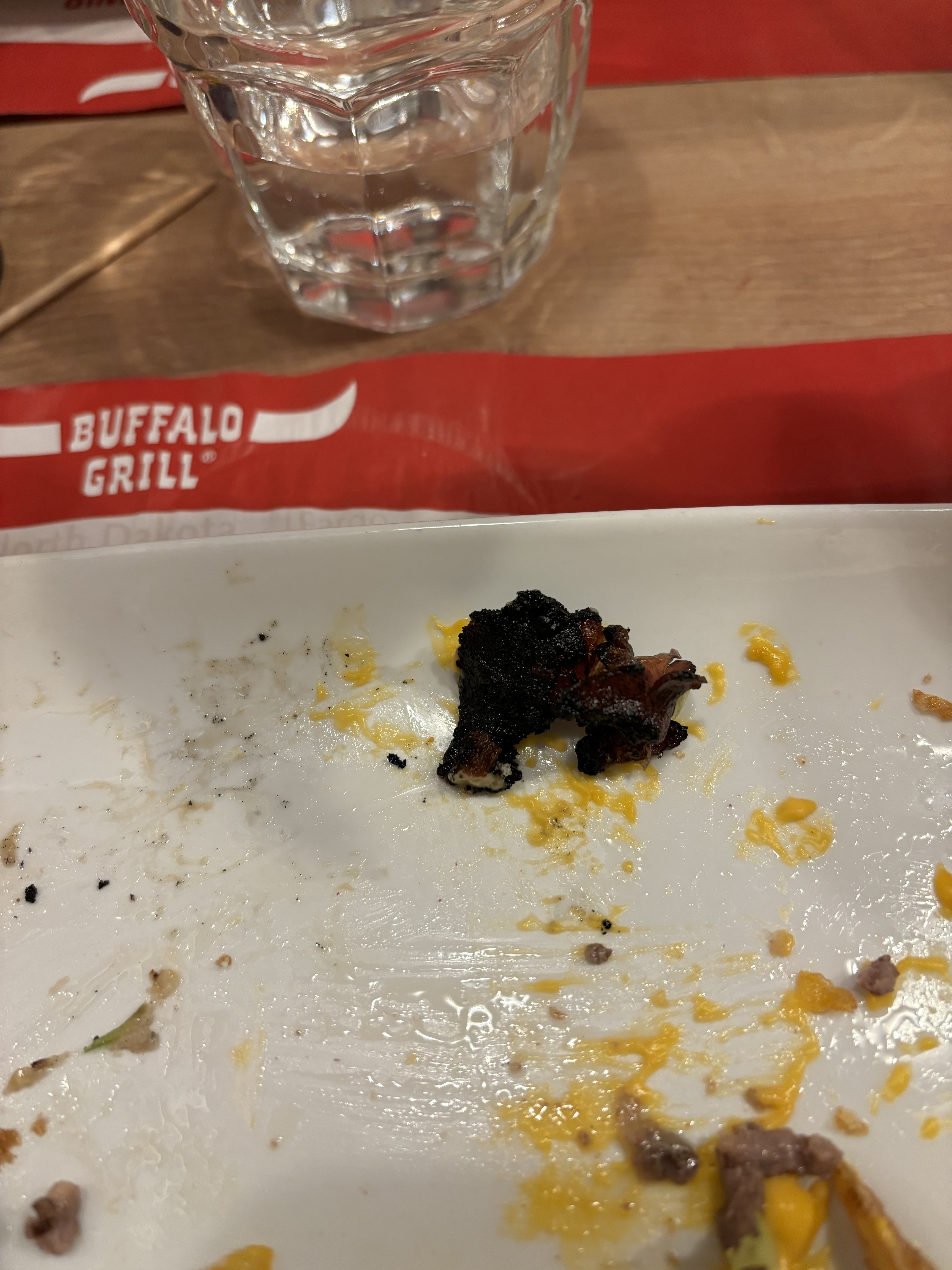 Catastrophique !!!!!! J'ai pourtant l'habitude de manger à Buffalo, une fois par semaine dans ma ville d'origine et tout s'y passe très très bien. Pour cette fois, revenant d'un déplacement, je m'arrête à celui-ci et je peux vous dire que ça m'a écoeurée de votre chaîne de restaurant ! Déjà l'accueil est glacial, l'attente interminable, les tables sales et collantes ! On commande de l'eau minérale, on nous sert de l'eau dans une bouteille en plastique (oui oui comme celle du supermarché) ! Je n'ai jamais vu ça ! La serveuse arrive, ne prend pas notre commande par écrit et essaye de mémoriser. Résultats: nombreuses erreurs au moment de l'arrivée des plats (ce qui était à prévoir). Et la pire du pire c'est la viande que l'on a servi à ma mère : CARBONISEE ! Immangeable ! Une honte de servir ça ! En plus le cuisto avait bien pris soin de retourner les Ribs pour pas qu'on voit que c'était du charbon ! Les steaks dans nos burgers étaient pareils, le goût du cramé gâchait tout !!!! C'est une honte ! BUFFALO c'est fini pour moi !!!!