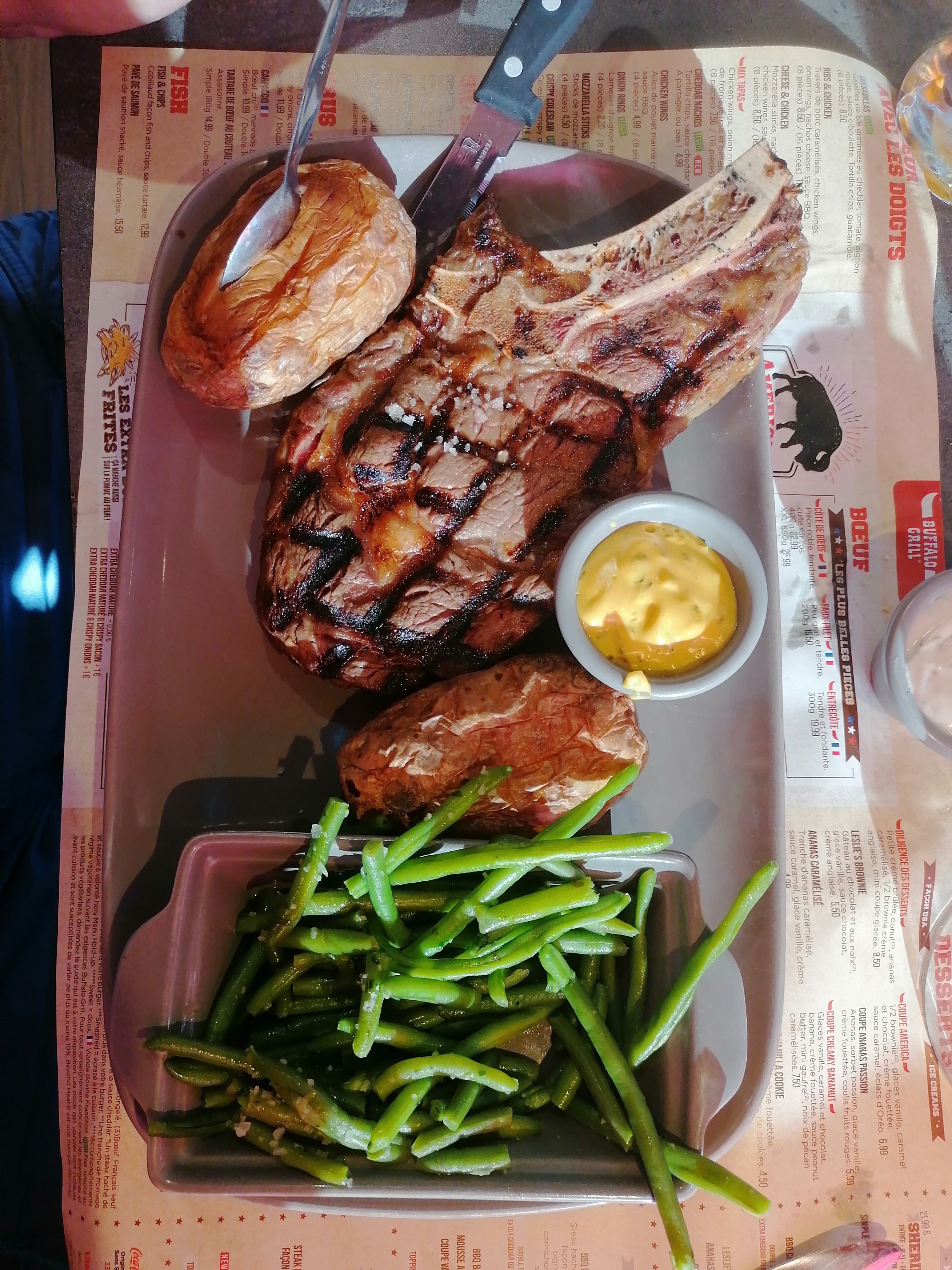 Super accueil et commander une cote de bœuf frite le plus bleu possible le cuisinier a respecter ma cuisson et je me suis régalé de ouf je conseil le Buffalo des sables d’Olonnes si vous venez en vacance comme moi j’ai mis une photo pour vous montrer la cote de bœuf et bravo au cuisto la serveuse excellent service et très agréable merci à Buffalo
