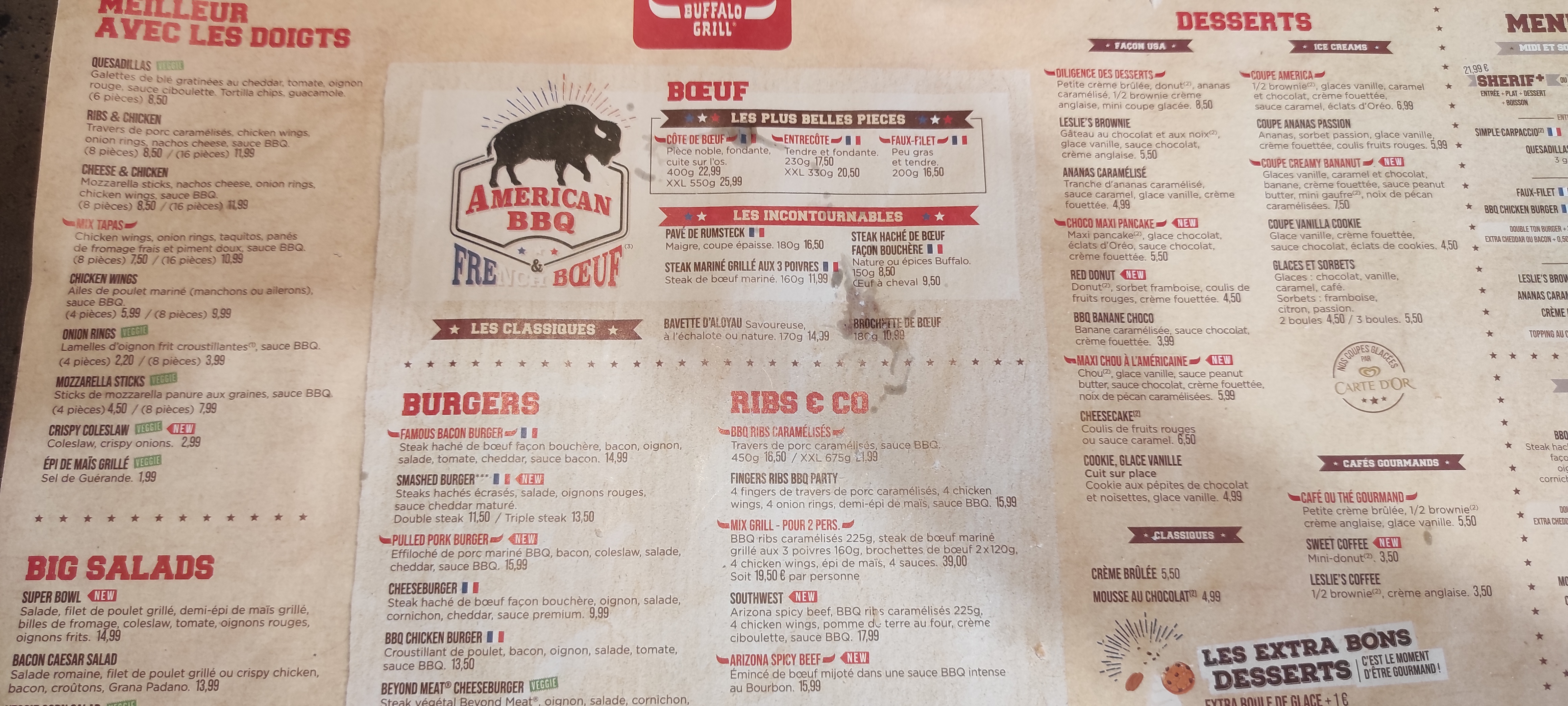 Bonjour, je suis désolé mais j'avais pris un burger qui était bien cuit mais cramé au dessus. Il était tout noir 😞. Ma femme avait pris une pomme de terre cuite, elle était trop cuite et sèche. C'est la première fois que je vais dans un buffalo où je suis déçu. J'espère que mon commentaire vous fera réagir.