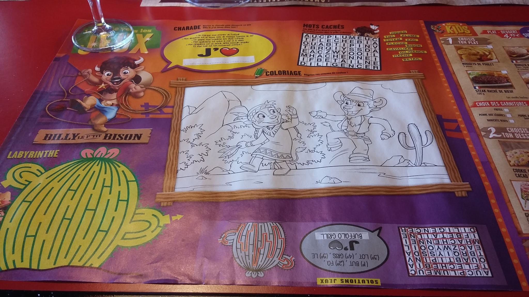Un bon repas qui nous a réconciliés avec le Buffalo! Arrivé avec deux enfants, mes filles ont immédiatement eu droit à leurs cadeaux : un sachet de crayons de couleurs et un frisbee pliant qui leur fait plaisir! Elles ont zappé la salade de bienvenue mais j'en ai fait mon affaire! Deux menus enfants commandés et un burger au bacon pour moi. La viande est saignante, comme demandé. Le bacon est bien grillé. Très bon! Ma femme nous a rejoints en fin de repas (Ce n'était pas prévu). Elle a commandé une suggestion du jour qui s'est avérée excellente! Elle n'a malheureusement pas eu droit à la salade de bienvenue... Pendant ce temps, j'ai accompagné ma grande fille dans l'aire de jeux (un peu pauvre mais qui a le mérite dexister) puis j'ai changé la couche de mon autre fille (La table à langer est dans les toilettes femmes... comme trop souvent). Pas de tapis hygiénique ou de lingettes disponible malgré la présence des distributeurs. Dommage! Les toilettes hommes et femmes sont cependant d'une propreté correcte. Il est temps de partir. Mes filles emmènent chacune un ballon et un bonbon. Nous avons passé un bon moment! Information complémentaire : Impossible de payer avec la carte Ticket Restaurant dans cet établissement.