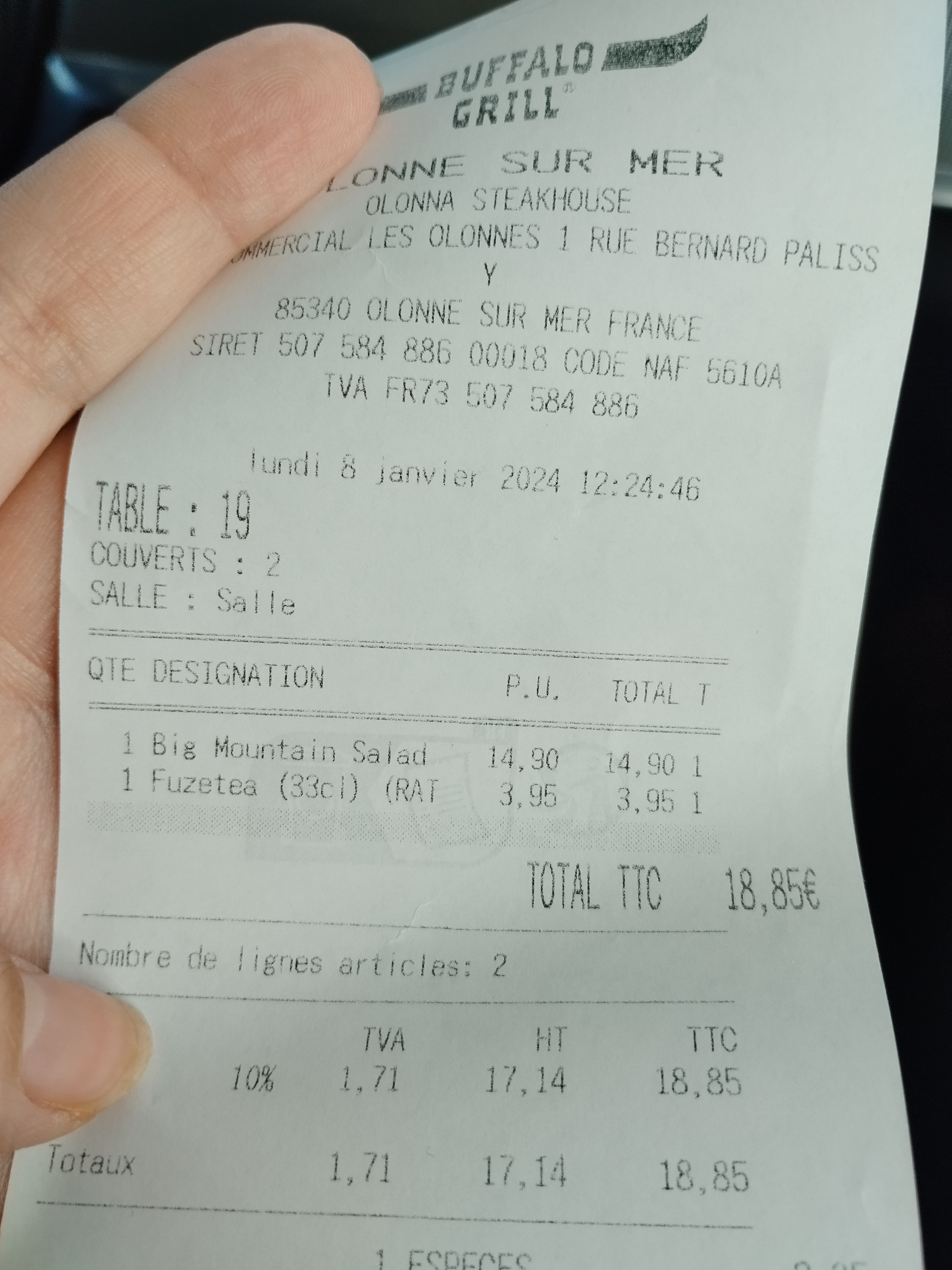 les 2 jeunes serveuses sont très agréable, le repas moyen mais pour un grill en semaine ça va. par contre le caissier a fait une grossière erreur 454 euros au lieu de 45,40 euros, mais je ne lui en veux pas car j’aurai dû vérifier la facture. Par contre impossible de me faire rembourser par la carte bancaire, il m'on donc remboursé en espèces, l'erreur est humaine mais grave, inadmissible que Buffalo n'ai pas les moyens adéquates. Je ne crois pas que je retournerai dans cet établissement