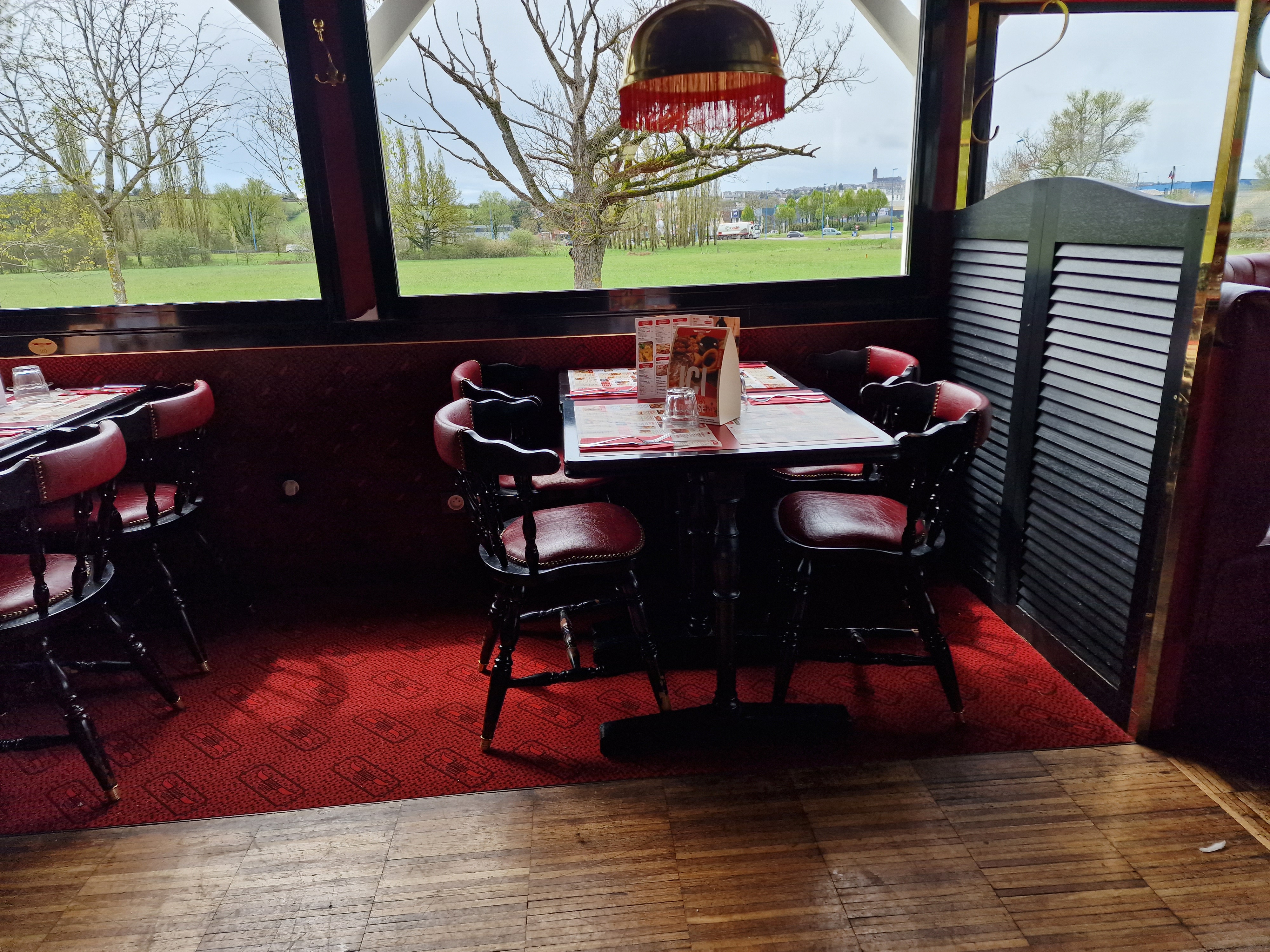 Restaurant qui paraît mal entretenu, le sol colle beaucoup ( nous sommes les. Premiers clients 11h45) les cuirs des assises déchirés, poussière sur les lustres, toilettes très sales Repas pas top pour mon fils nuggets frite ok, boisson arrivé à la fin de son plat, pas le dessert choisi et pas de surprise avec le menu!! Pour moi entrecôte a point mais vraiment trop cuite avec un côté noir comme si la plaque de cuisson était sale.. Le service au top, souriant et agréable.