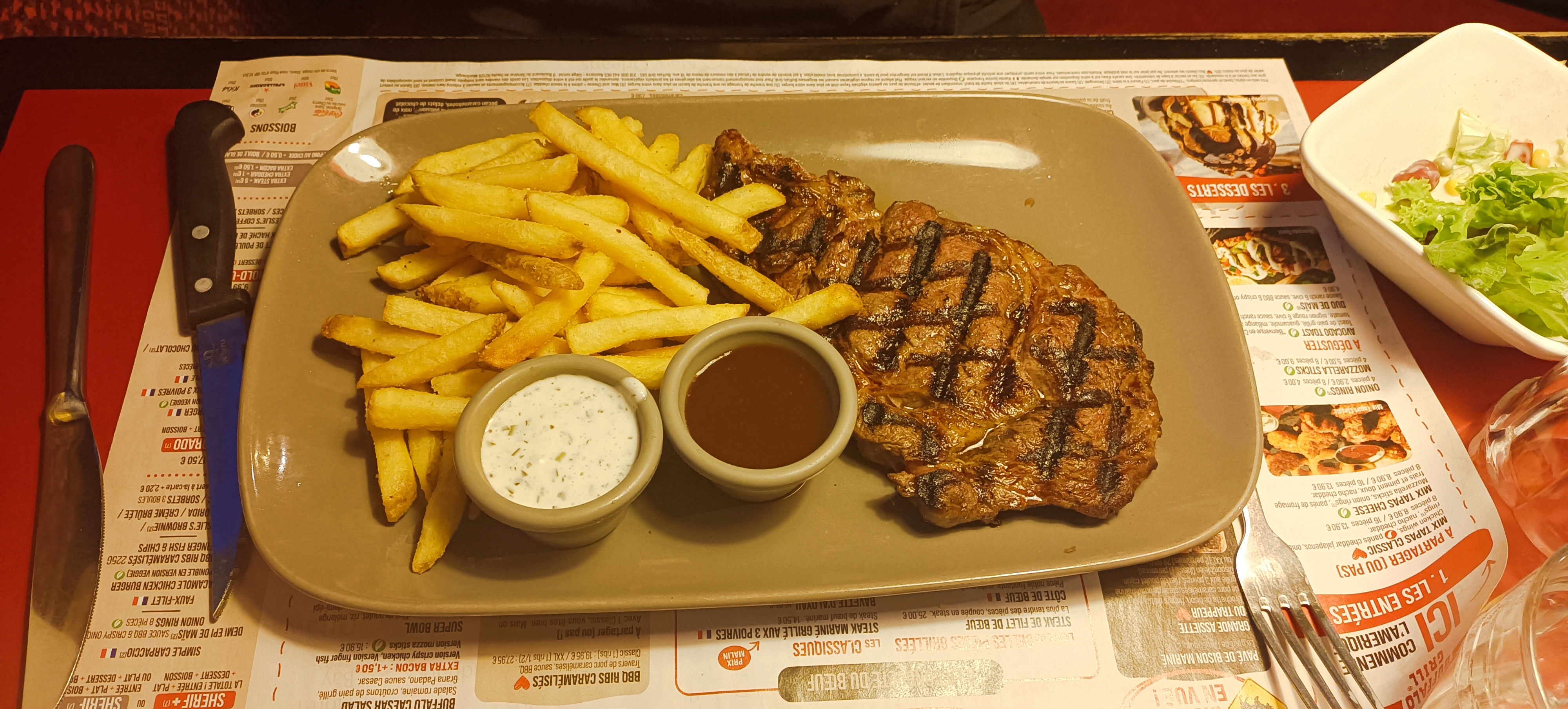 La viande est très bonne. Par contre il faut être patient. On redemande de la sauce, heureusement qu'on a mangé les frites sans rien car la sauce est arrivée 20 min apres ils ont du aller cueillir les échalotes Niveau dessert je ne peux pas vous dire car il n'y a plus de banane à 20:30 donc deux desserts de moins. Forcément il reste tout les plus cher.