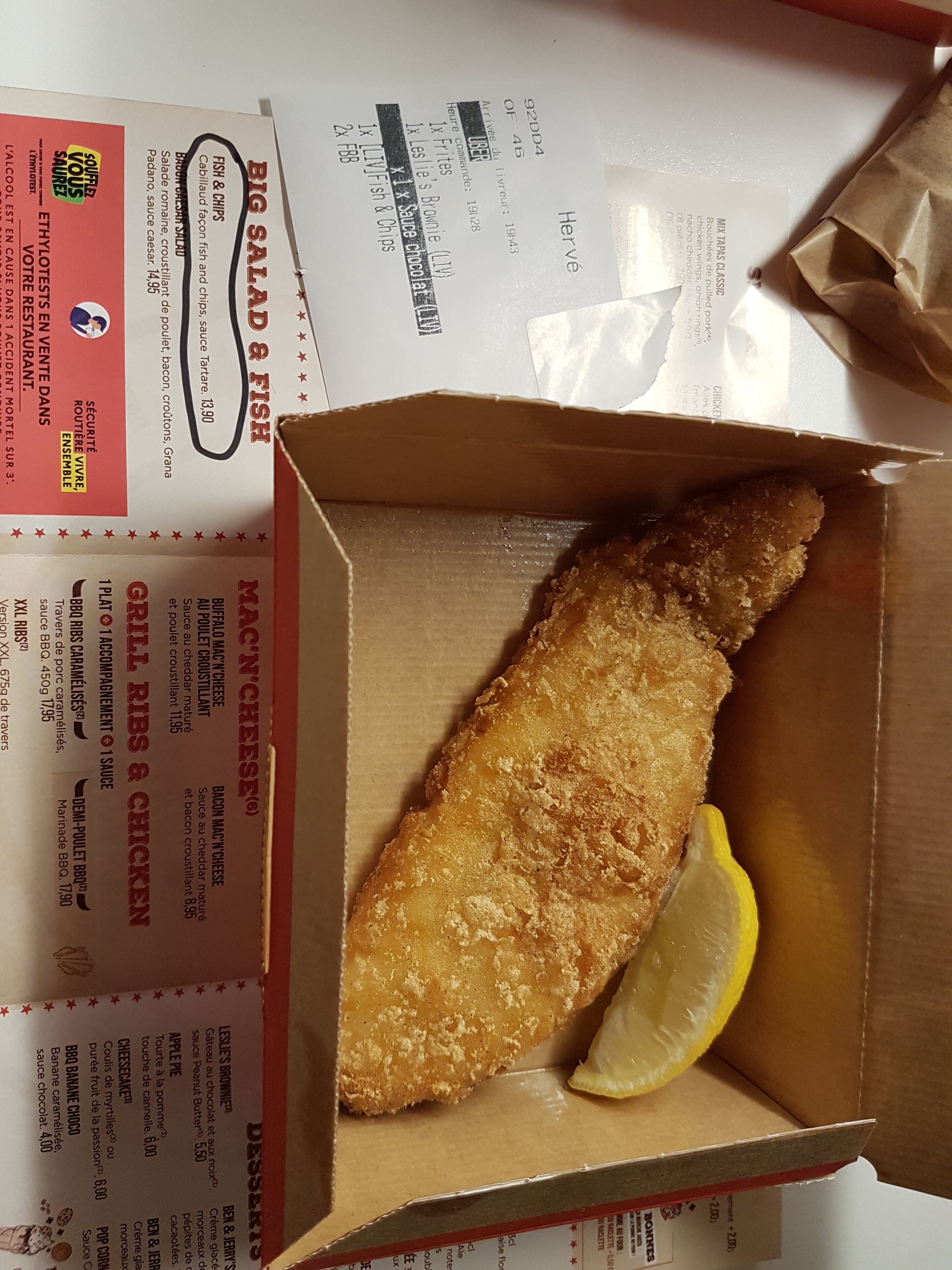 Dernière fois que je commande chez Buffalo Grill via Uber Eat. Sur 4 commandes, il y a eu 2 frites oubliées et aujourd'hui, on m'explique le fish and chips à 12,90€ sur Uber Eat est livré sans chips (frites)! La même formule sur la carte restaurant est proposée à 13,90€ avec frites et sauce. Conclusion : 12,90€ pour un bout de poisson pané, c'est vraiment se fisher du monde ! De plus, pas un seul geste commercial n'a été proposé par Buffalo grill ou uber eat, je déconseille fortement.