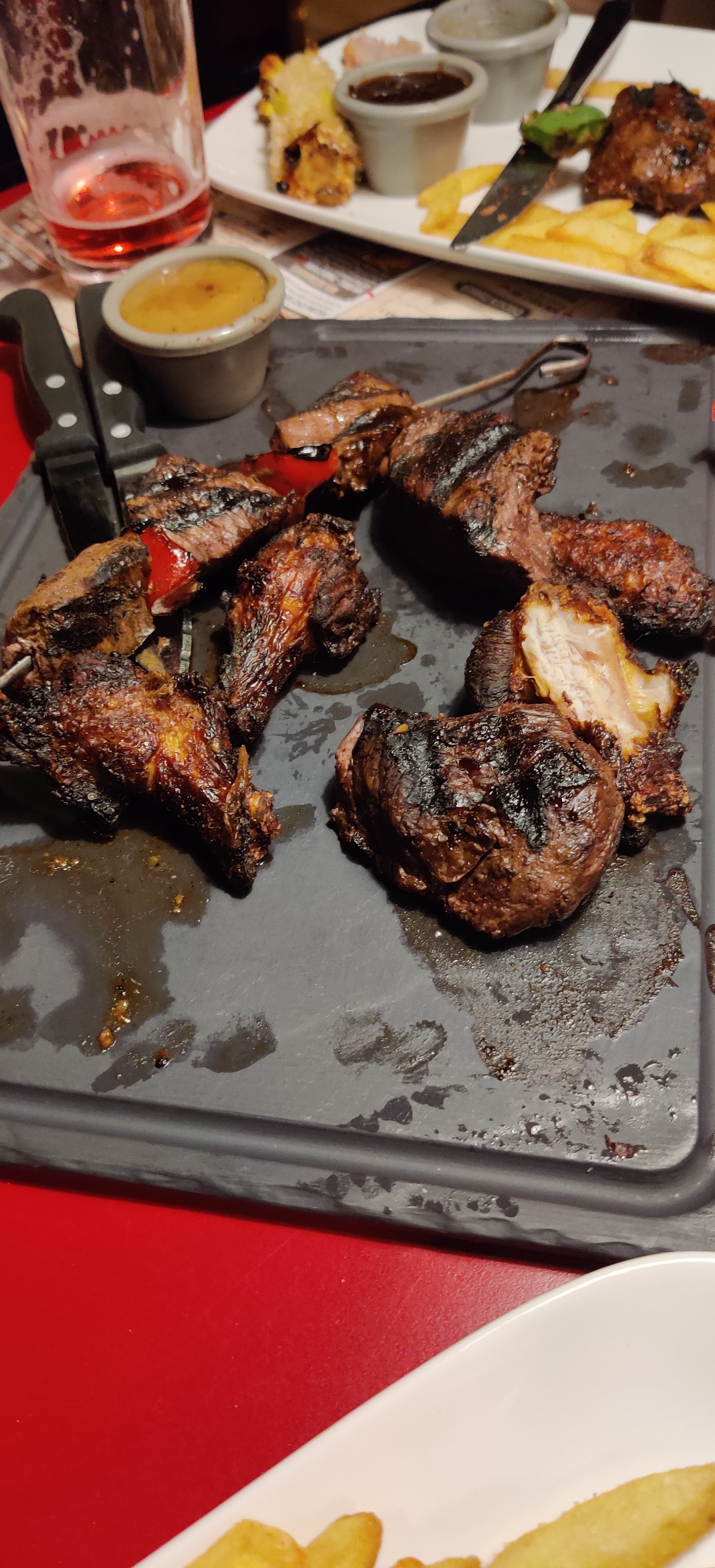 En groupe de 6 adultes arrivés un peu avant 22h, on a bien reçu notre salade de bienvenue rapidement. Mais l'attente pour le repas était plutôt long. Repas arrivés, plusieurs viandes étaient noircies parce qu'on a demandé une cuisson Bien cuite ! Or on avait bien précisé que la viande ne soit pas brûlée. Malheureusement notre précision n'a pas été prise en compte. Avec le fait d'avoir déjà trop attendu on a juste fait refaire les viandes trop cramées sinon franchement on aurait retourné tout le plat. Si la cuisson Bien cuite doit correspondre à du cramé autant prévenir les clients. Le responsable a été compréhensif et a refait les viandes mais on retse déçu car on avait quand même attiré l'attention pour éviter que ça arrive. (En photo les viandes noircies et à côté celles refaites)