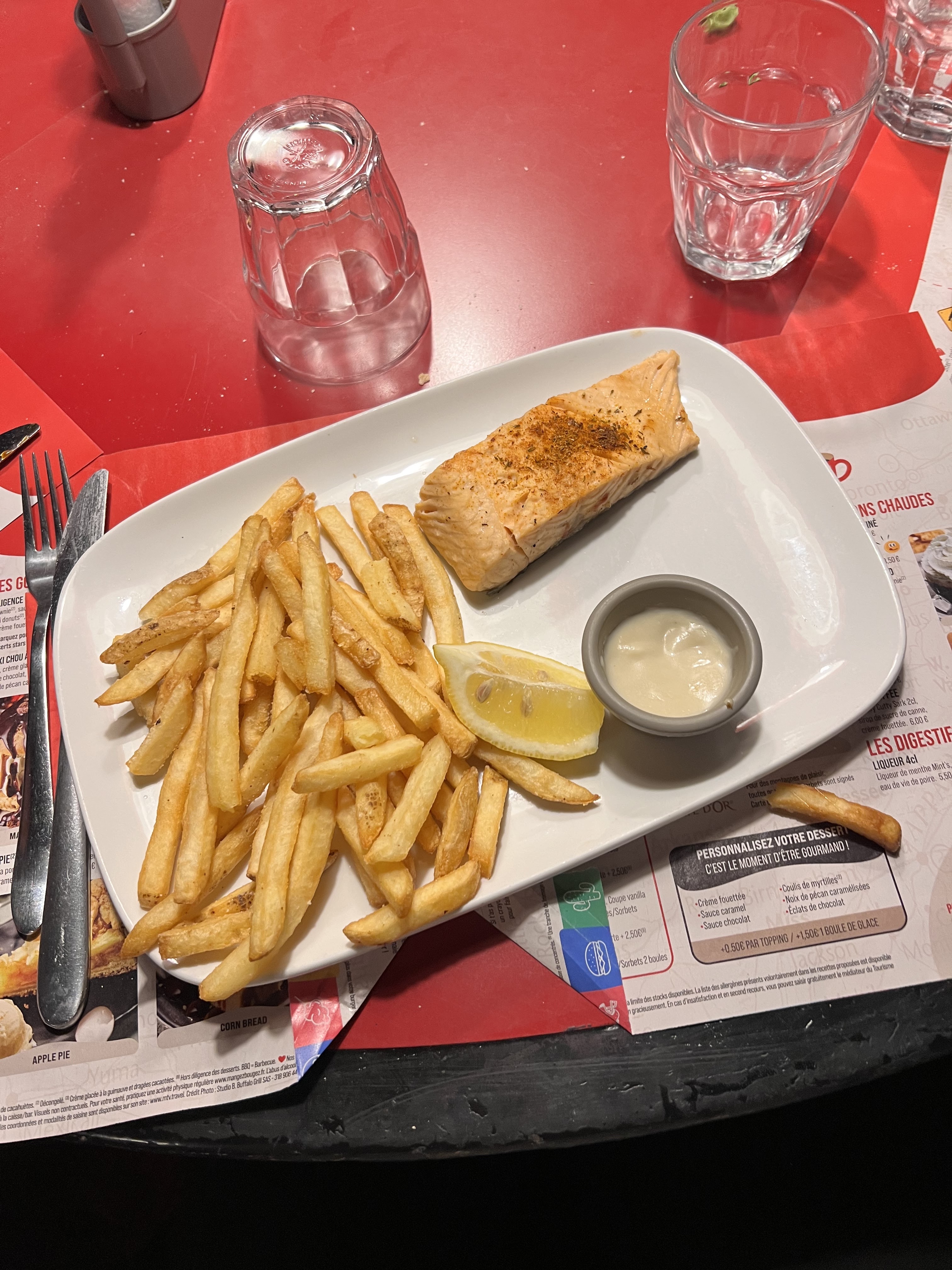 Je vais a l' hôtel à côté et je décide de mange dans ce restaurant après 5h d écoute car j' ais pas le courage de traverser la route pour aller chez le concurrent en face qu on m'avait recommandé.... En fait ce que je commande ne correspond pas du tout a ce que l' on me sert à table. J' ai dis à la serveuse qu on mange mieux chez Flunch en fait. Des frites froides du riz froid un pavé de saumon servi sans la sauce ranch etc... Une pomme au four dégueu. Je suis très déçu . 26 euros pour manger cela un pavé saumon surgelé servi neutre et du riz froid etc.... J' ai dis à la serveuse que j étais déçu et que je ne reviendrais pas. Elle n a pas réagi elle était genre je m en fous. De plus je demande des frites avec suppléments cheddar et je fais constater et désolée me dit elle mais sur la facture elle ne corrige pas bref a fuir.