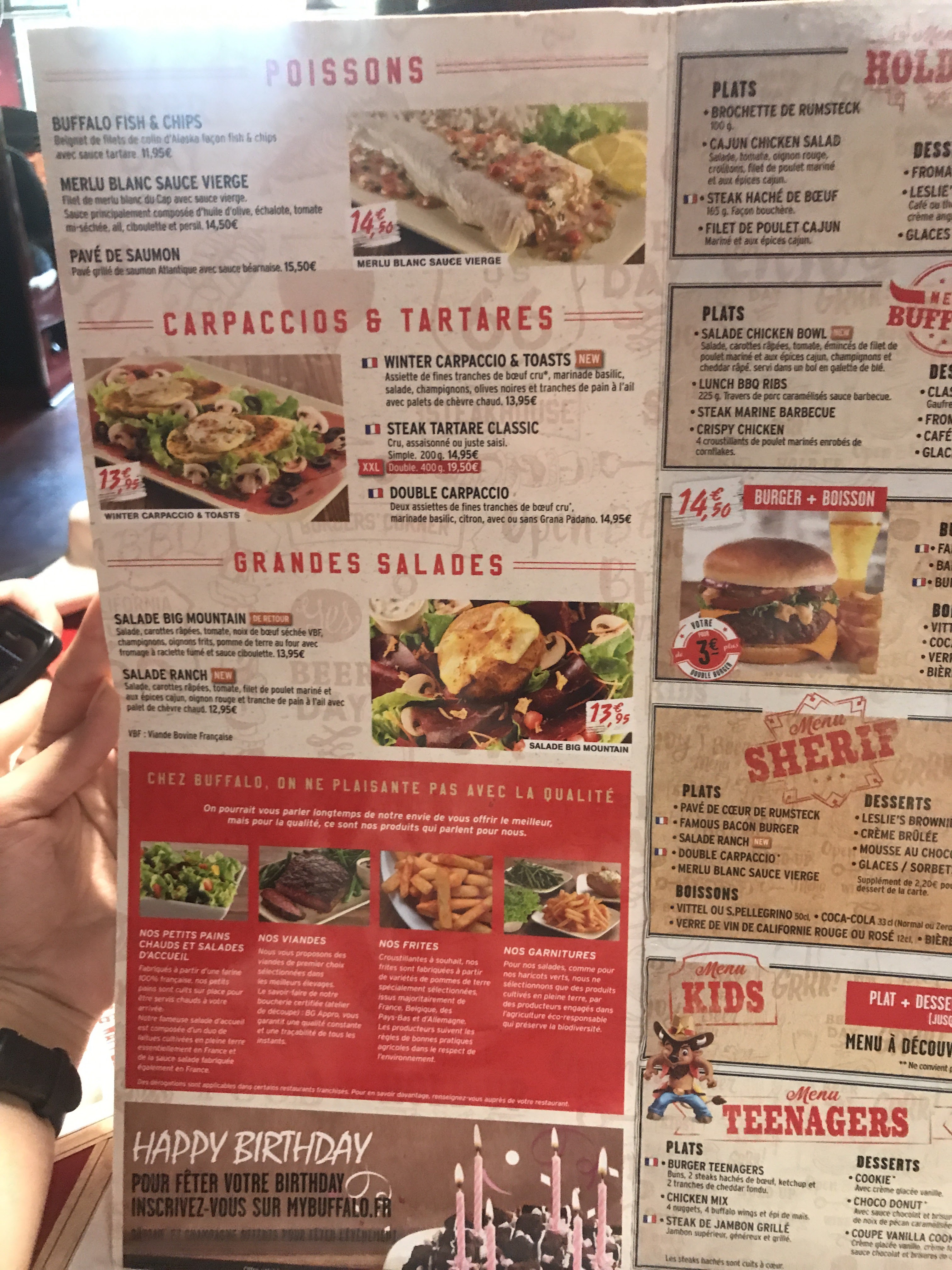 Pas de surprise, une qualité qui baisse à mon sens. La salade d entrée est ridicule, avec le carpaccio de bœuf je n ai eu que très peu d huile d assaisonnement deux minuscules morceaux de citron, il n y a plus de capre. Assez déçu