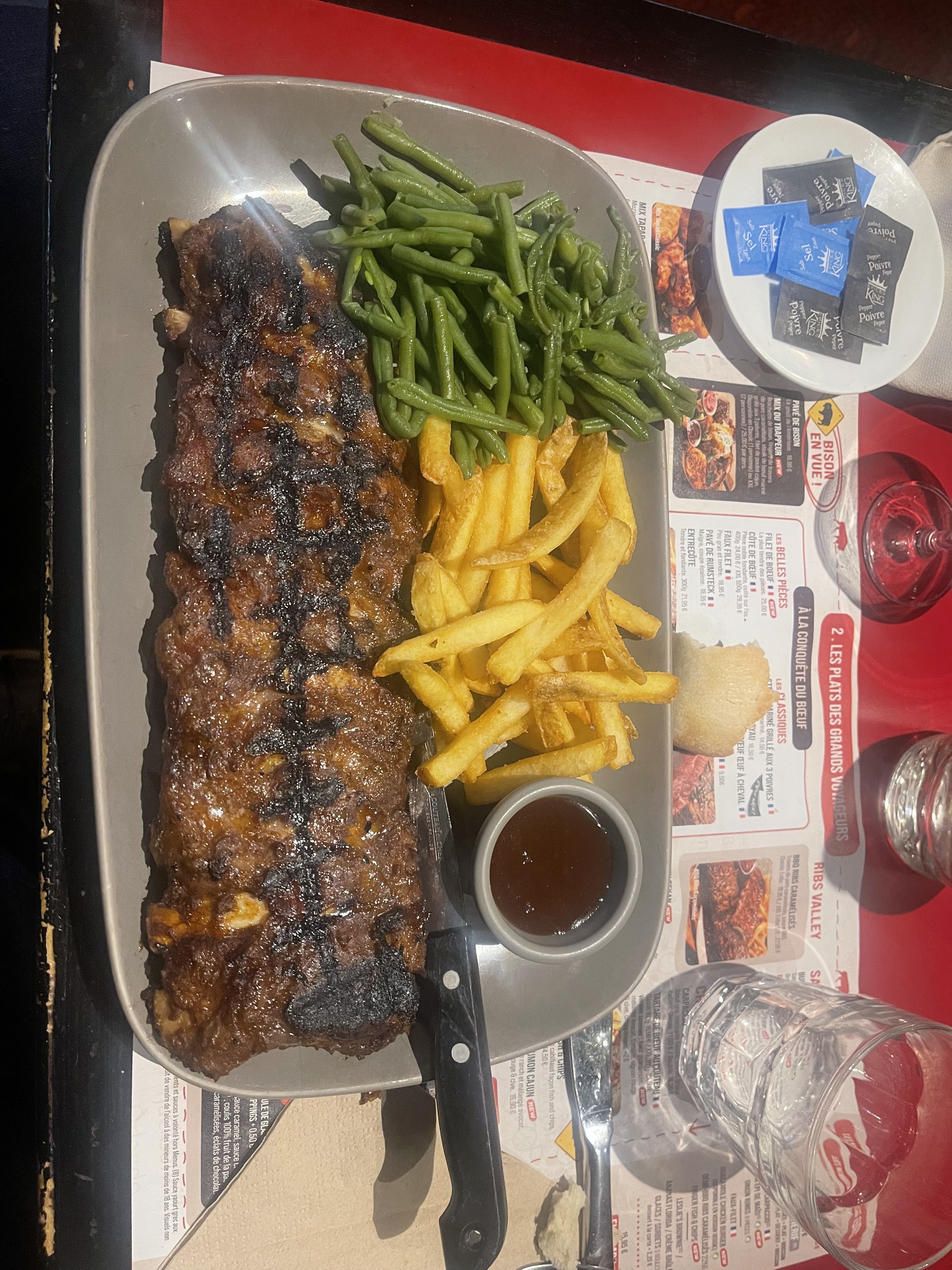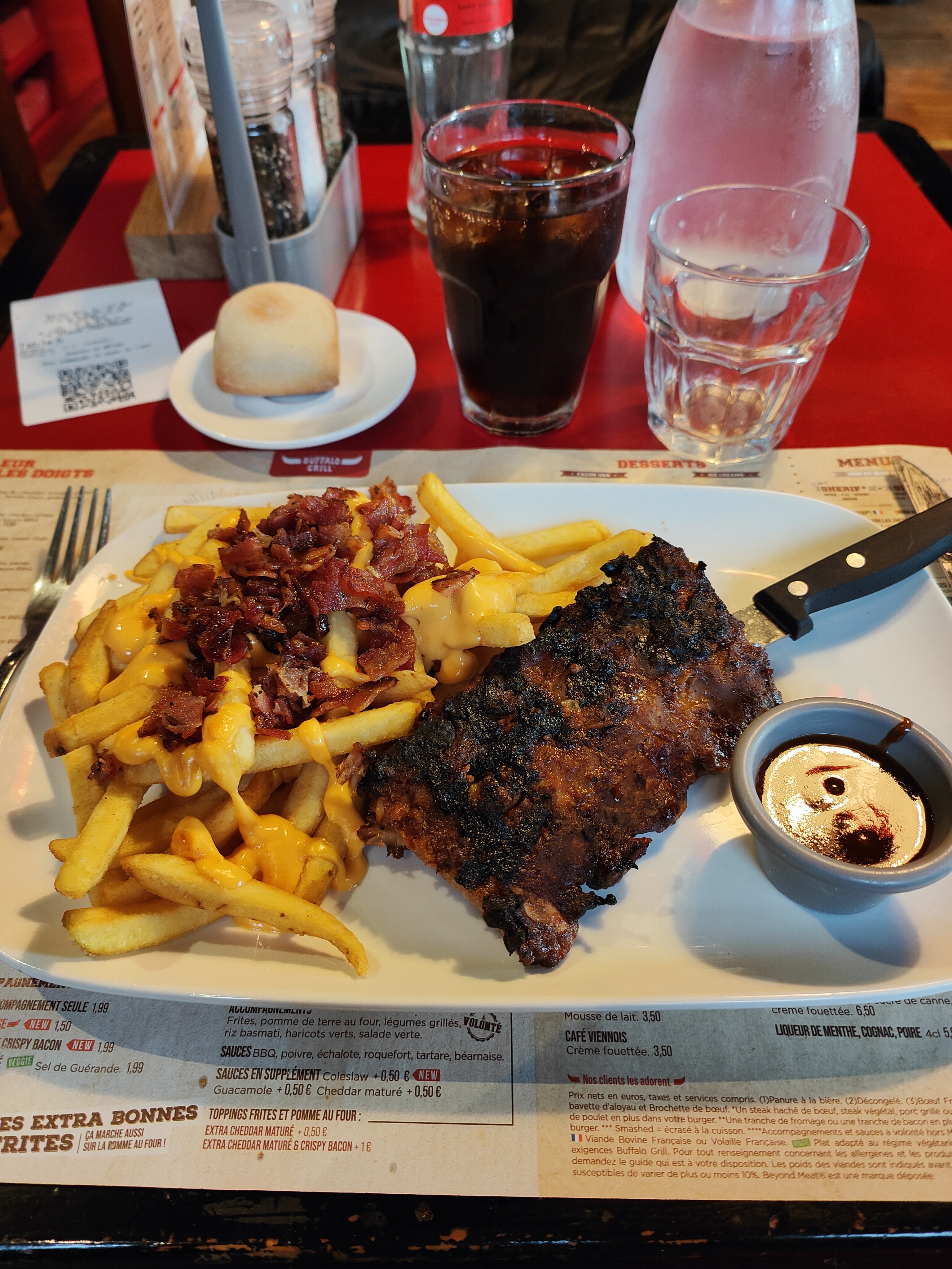 Authentique Buffalo Grill comme on connaît depuis tout petit mais hélas n'a pas le même effet comme quand on était petits. Plusieurs serveurs nous ont vu et regardé en rentrant mais ça a pris bien 5 minutes avant qu'on soit mis à table malgré de nombreuses tables vides. Le système de commander 'en ligne' n'est pas toujours pratique vu que le QR nous ait apporté sous forme de petit ticket qui s'envole et qui se perd etc... après notre serveur était très gentil mais on senti qu'ils étaient soit précipité ou perdu.. La viande était bonne mais j'aurai apprécié un peu plus d'épice, de la viande cuit directement avec de la sauce bbq pour garder toutes les saveurs. Les frites étaient juste comme des frites congelées et directement cuit au four, en soit pas mauvais mais bon ça change pas de ce qu'on peut faire chez nous !