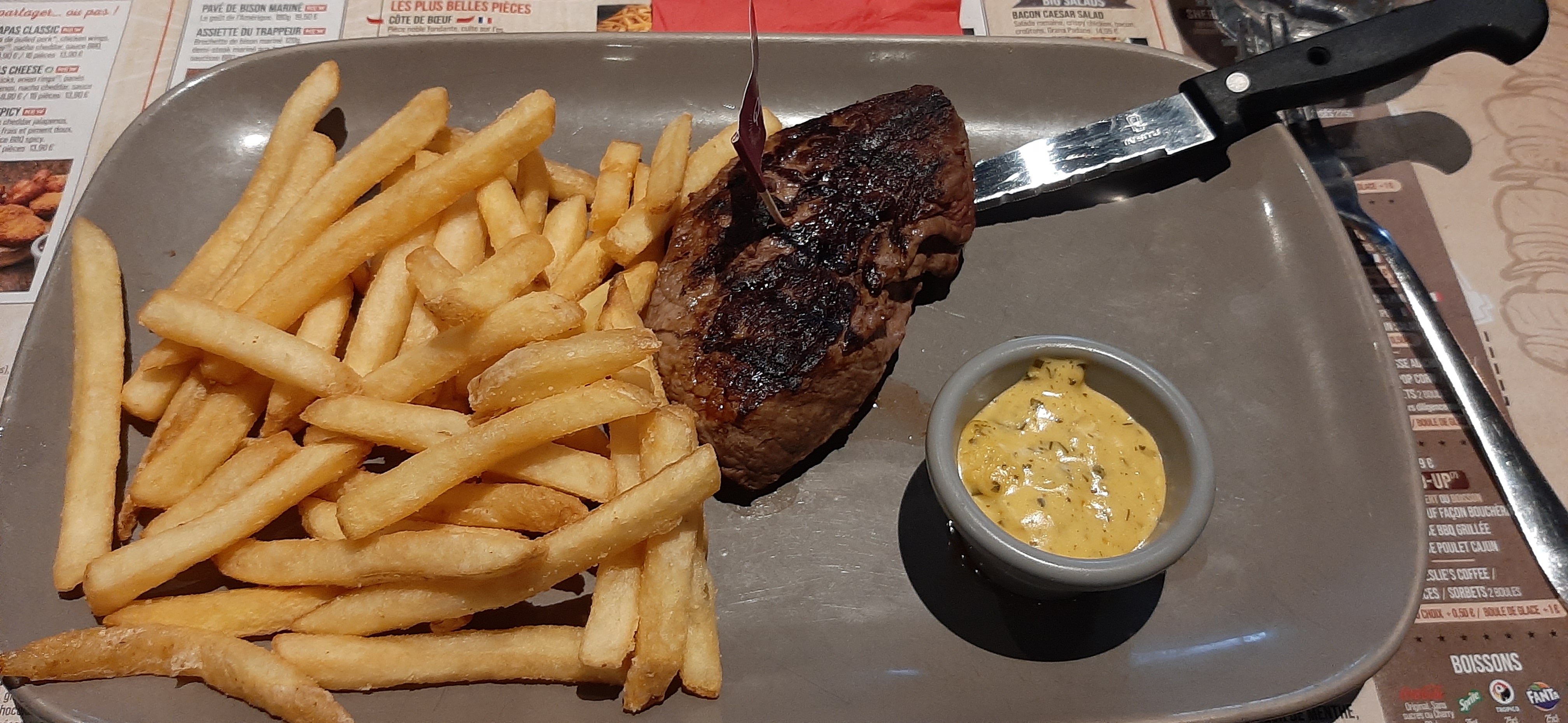 Tout était super bon la grande assiette du trappeur était copieux la viande bonne et bien cuite a recomender je reviendrais bientôt.