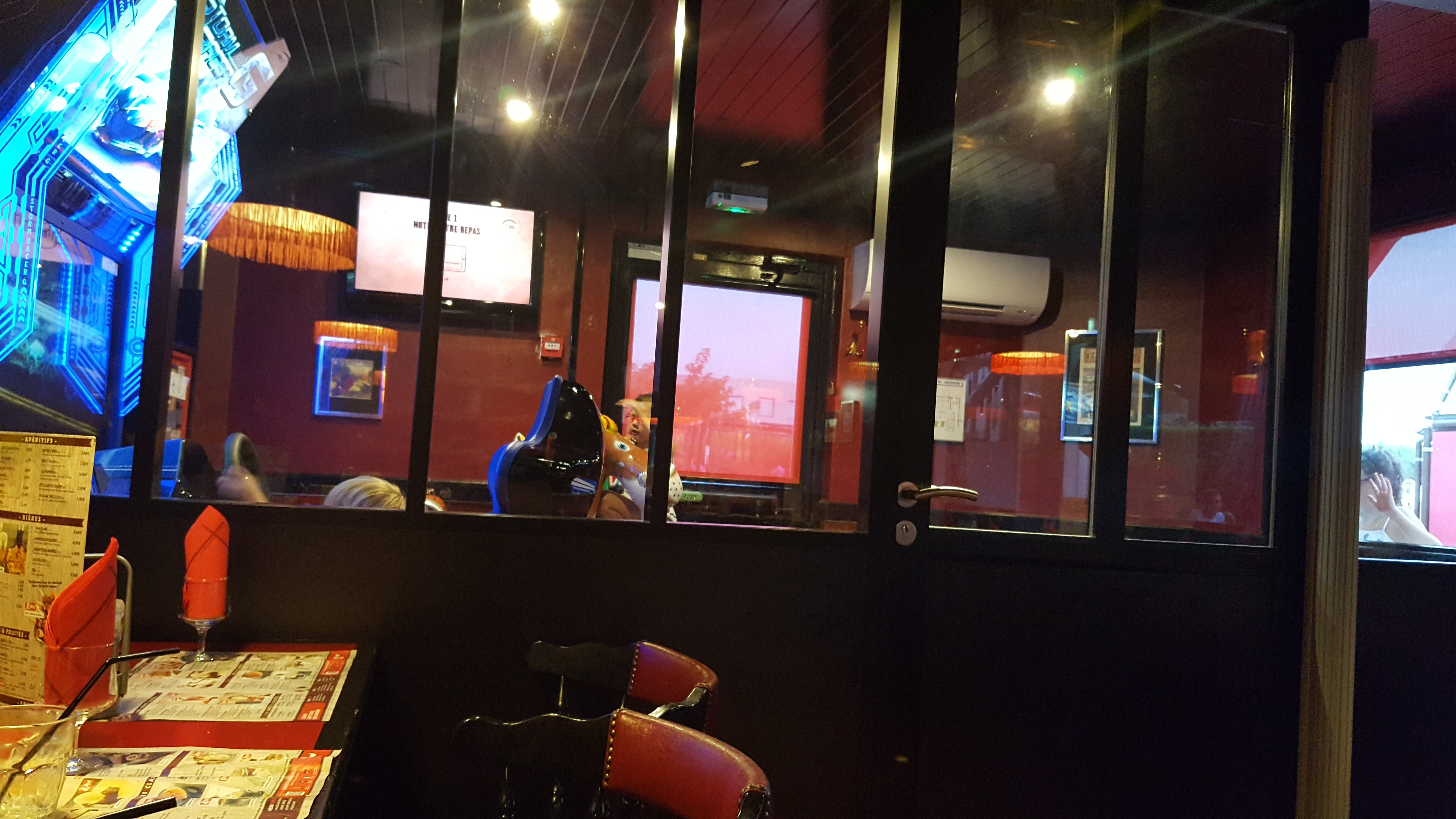 Notre faux filet , qui avait manié d’être un rumsteck , effectivement le grill est respecté ce goût de cramé m’a laissé insatisfait.Ayant commandé un coca je pense que l’eau était en supplément. L’aller retour des enfants pour allez au jeux , laissai rentré le froid dans le restaurant, fort désagréable quand vous voulez passer un moment chaleureux