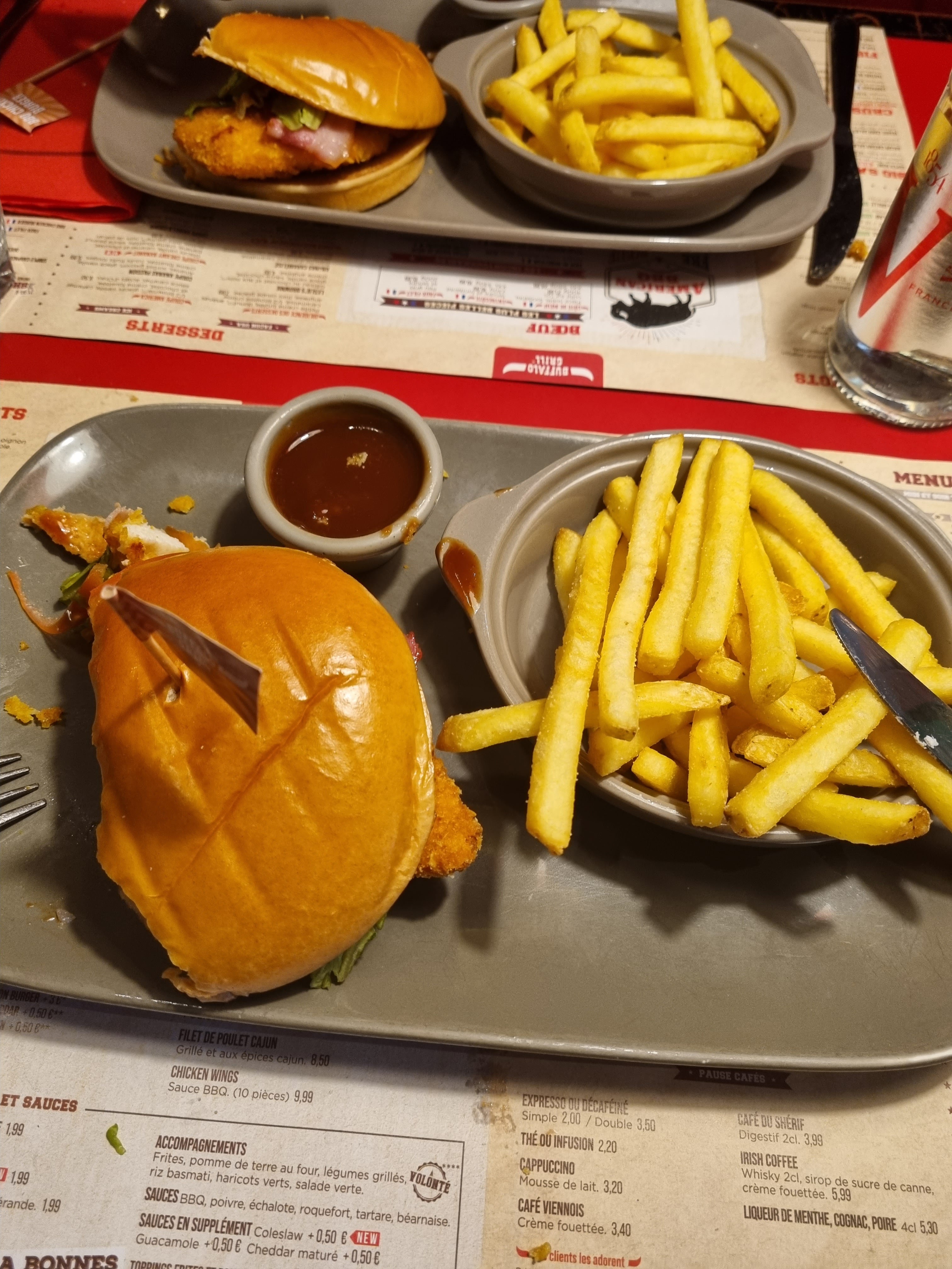 Buffalo correct, dommage que le plat était un peu froid. L'assiette du trappeur était très bonne ce pendant, avec ses frites à volonté. Service un peu long. Le personnel est sympathique et souriant.