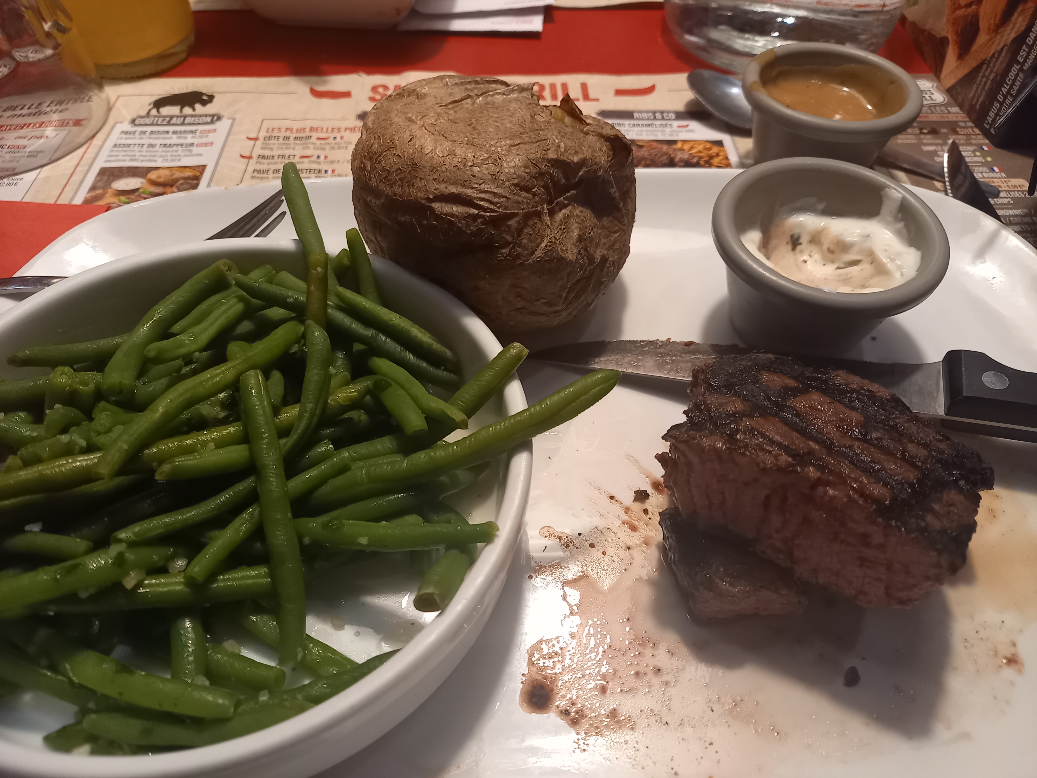 Expérience très décevante Moucheron dans la carafe d eau des morceaux de papier sulfurisé brûlé dans le plat et la sauce. Une heure d attente pour avoir le plat nous nous sommes arrêtés là. Buffalo Grill en a beaucoup perdu nous ne reviendrons pas.