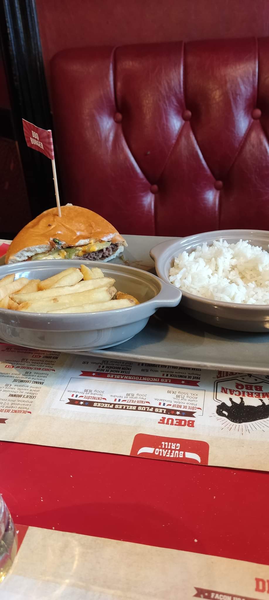 Plus jamais à emporter !!! On a voulu tester le « À emporter ». On s’est dit que vu que c’était le Buffalo Grill, qu’on en était très contents sur place, on allait leur faire une confiance aveugle. Comment dire : quand on demande un Burger Ribs Bacon et qu’on a un burger pour les enfants, on se paie notre tête !! Je suis très mécontente de ce restaurant aujourd’hui. Mon conjoint a un repas pour enfant ! Top ! Sans compter sur mon dessert retourné. On voulait se faire plaisir, on s’est fait arnaquer. Ce n’est pas comme si on habitait à 20 minutes de Pierrelaye...