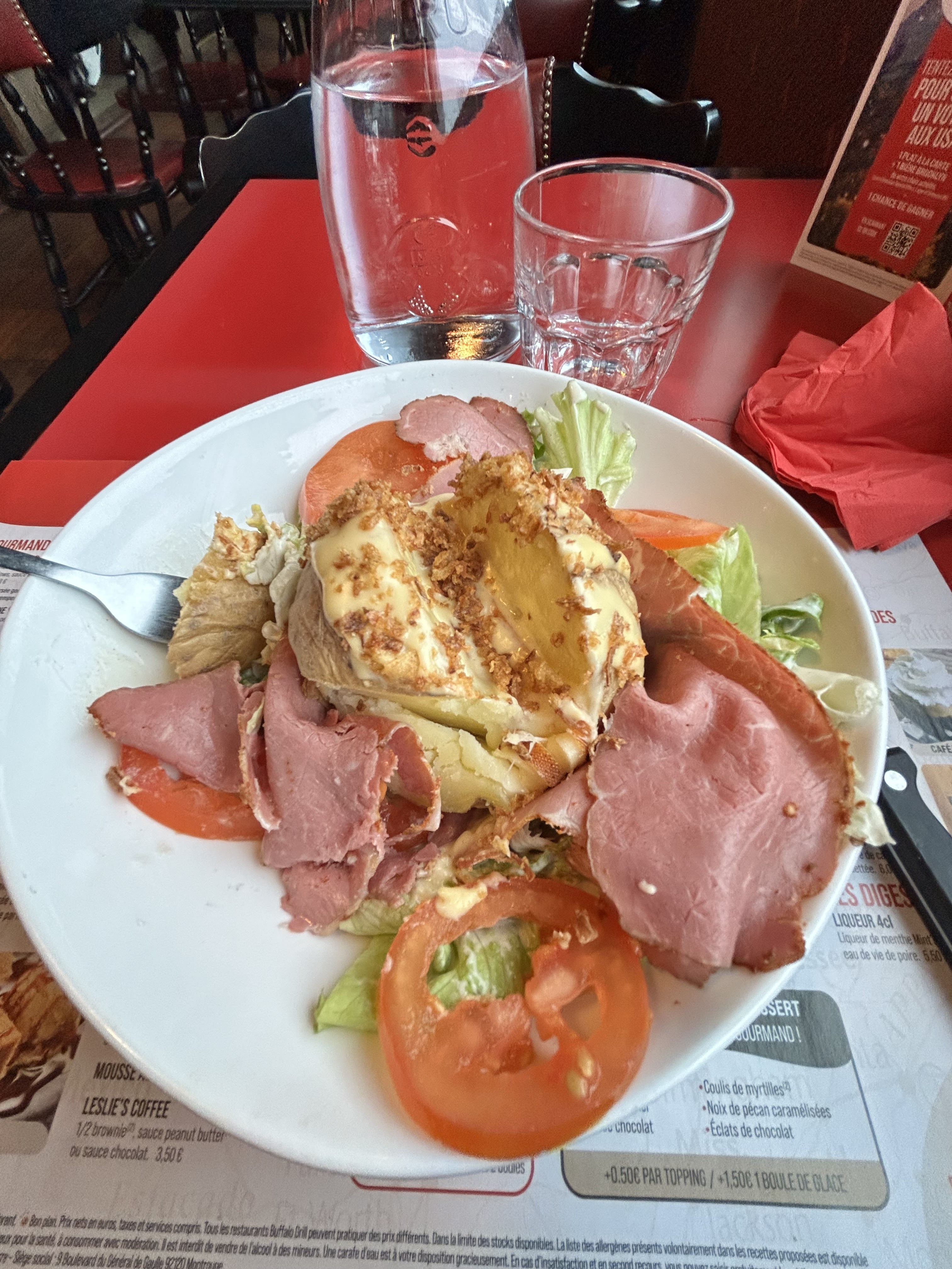 Dès l'entrée dans le restaurant l'attente s'est fait ressentir. 2 personnes pour tenir le restaurant c'est peu, même si nous avons été bien reçu et le sourire était au rendez-vous. Mais Bufallo à la solution, transformer le client en serveur via un qrcode. Le temps de trouver le fonctionnement et la prise en compte de notre commande, il s est écoulé environ 30 minutes, une fois la salade d accueil distribué nous avons enfin pu commencer les festivités. C est sans compter des assiettes qui arrivent tièdes et des assiettes brûlantes, un remplissage de garniture (frites) légères pour les un et correcte pour les autres. Comment demander du sel lorsque l on se sent bien seul ? Nous avons passé 2 heures dans un restaurant quasi vide en client. C'est domage car d'habitude Buffalo est une valeur sûre.