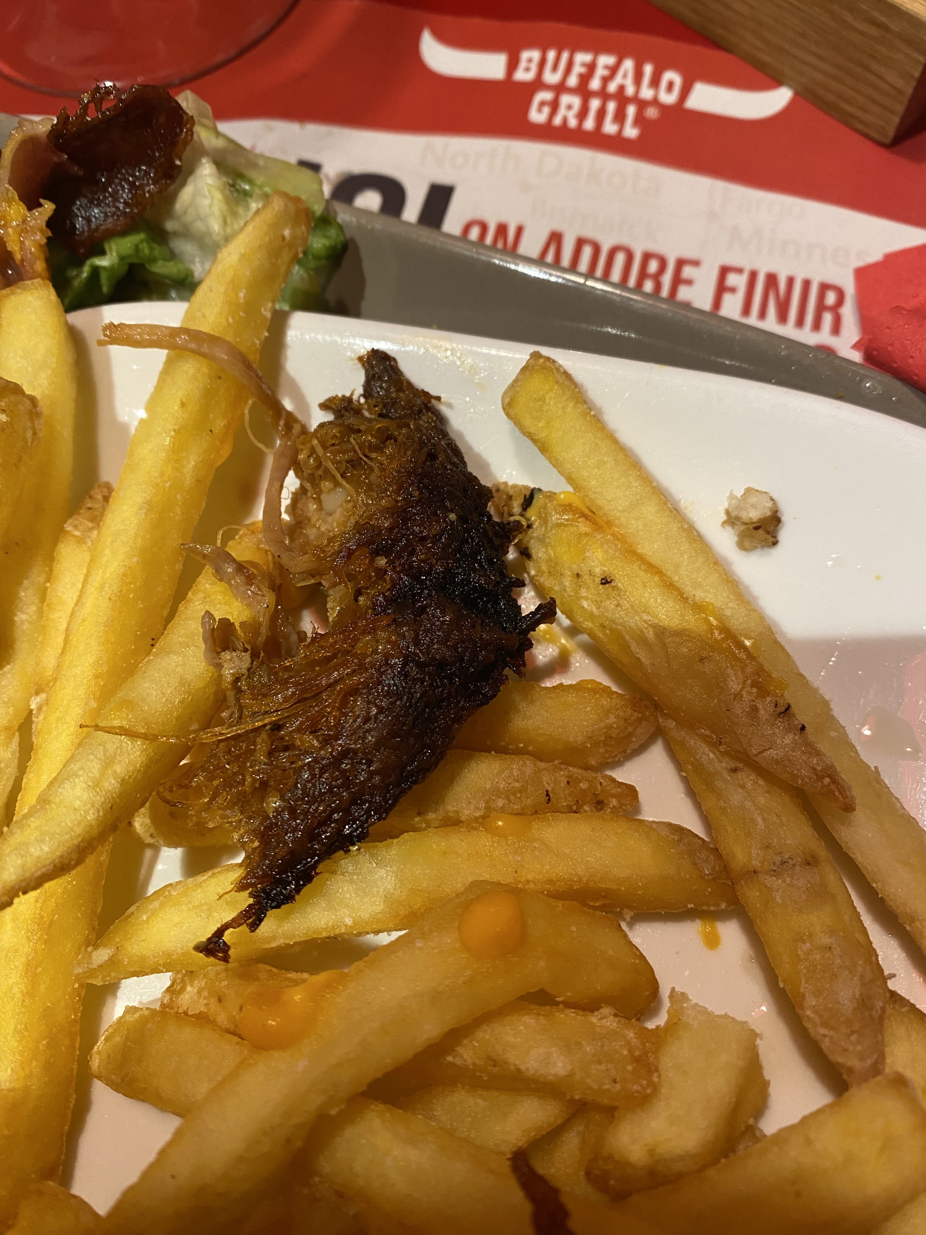 Des années que nous avions pas mangé dans un Buffalo et dans mes souvenirs ont en ressortait rassasié...et bah ce soir cela n à vraiment pas était le cas, un steak minuscule et des frites qui ne donnent pas envie...Le pire un burger poulet guacamole et bien 🤔 je cherche encore l un et l autre ( preuve en photo) ...( pour les frites la quantité est celle de la photo pas une n avait atteint une bouche ,donc pauvre assiette ) ...par contre jolie decor mais ce sera tout car nous n avons pas voulue tenter le dessert pour ne pas dépenser pour rien ...environ 15e par assiette pour rien