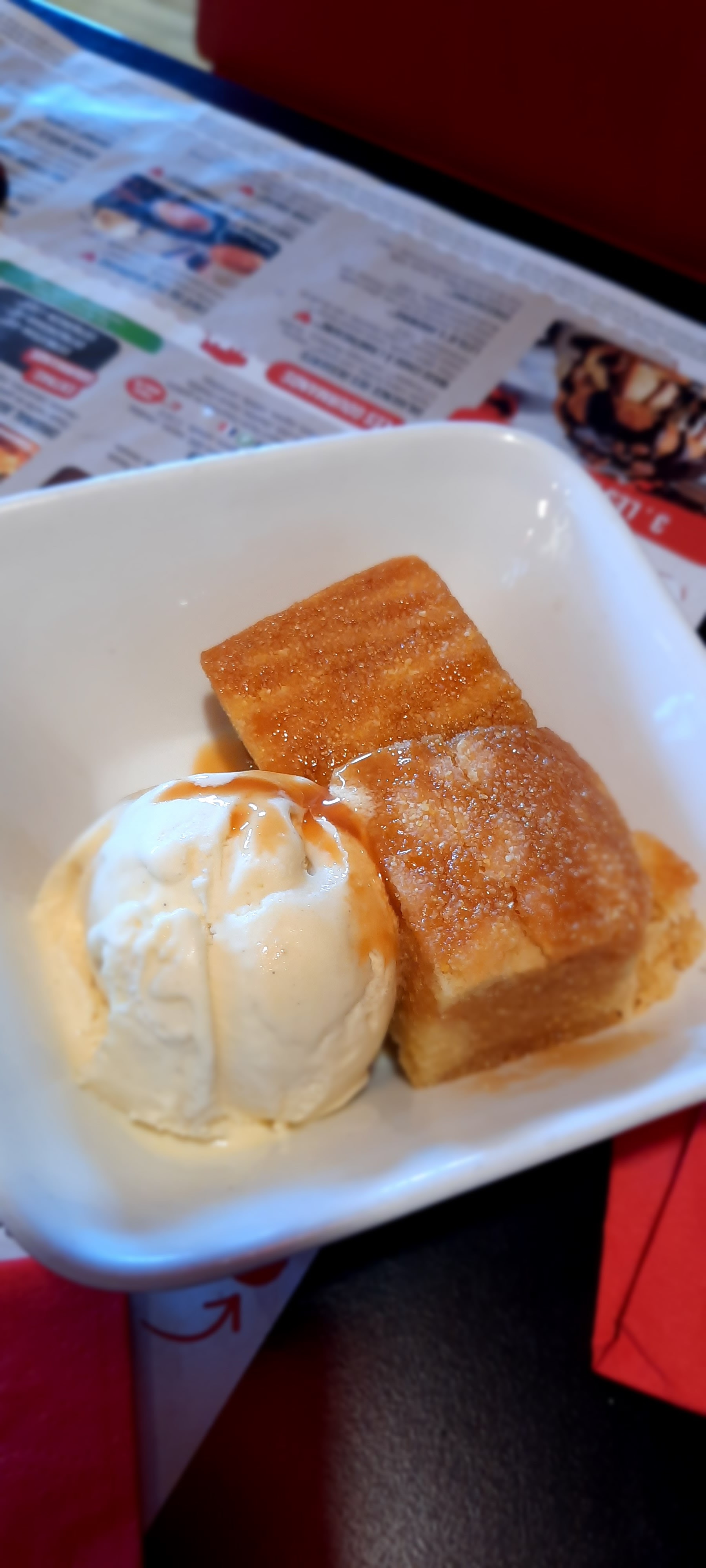 Avec un pavé de bison a 19,90 je suis très déçue... mais... Le pave est nerveux immangeable... Ce qui n etait pas le cas dans d autres Buffalo... Est ce un coup de malchance ??? La serveuse très sympathique a fait changer la viande par de nouveaux pavés de bison... idem... ce devait être l arrivage... pas de chance... toujours aussi nerveux... Avec en détail des bouts de salade très abîmés... Le chef nous décompte les pavés, ce qui est très commerçant. Pour tenter de nous requinquer en protéines, nous tentons le dessert. Je prends un café gourmand et mon mari une coupe vanillia cookie... En attendant, nous savourons le rosé california qui etait destiné au repas... Ce rosé est très bon 😅 Le café gourmand parfait... Je reviendrai pour retester le bison et ne pas rester sur un Echec... qui n est pas l enseigne generale de Buffalo... ... avec l offre des pavés, et la suite de notre commande, le service sympathique de la serveuse, nous reviendrons... À bientôt !!! 😉